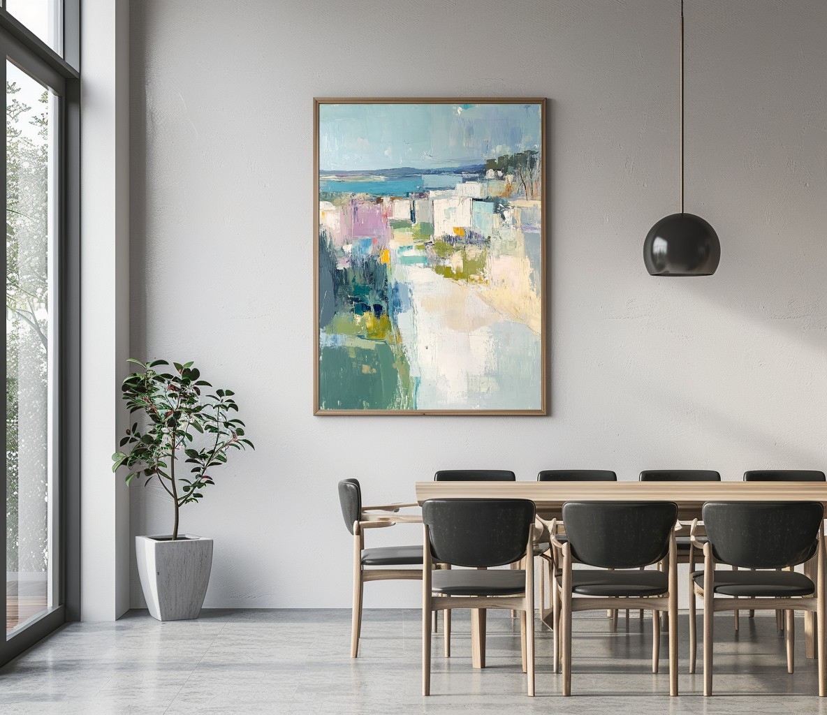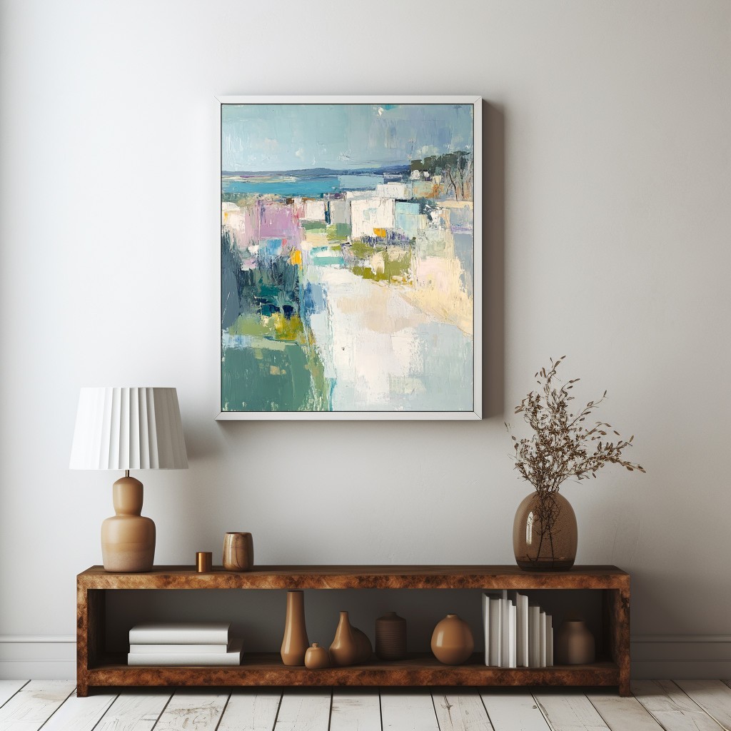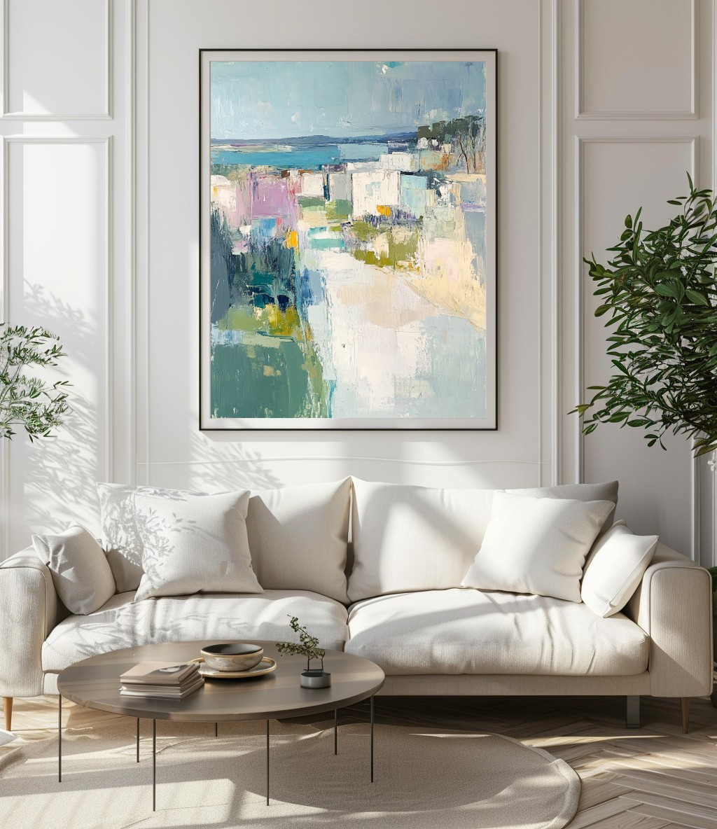 Questo dipinto astratto ispirato al mare cattura la bellezza di un paesaggio costiero attraverso pennellate morbide e sfumature delicate di azzurro, bianco e verde. La composizione geometrica crea un effetto armonioso, evocando una vista panoramica tra natura e architettura. Perfetto per arredamenti moderni e minimalisti, questo quadro dona un senso di tranquillità e raffinatezza agli ambienti. Ideale per soggiorni, camere da letto o studi, aggiunge un tocco artistico e sofisticato. Se cerchi un'opera che unisca astrazione e paesaggio marino, questa tela è la scelta giusta per il tuo spazio.