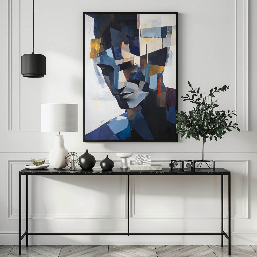 Questo dipinto astratto cubista raffigura un volto enigmatico scomposto in geometrie e sfumature profonde di blu, bianco e oro. Le pennellate decise e la frammentazione delle forme evocano emozioni intense, rendendo l'opera perfetta per chi ama l'arte moderna e l'espressionismo astratto. Ideale per ambienti contemporanei, loft o spazi minimalisti, questo quadro aggiunge un tocco di eleganza e introspezione. Se cerchi un'opera d'arte originale per decorare il tuo salotto o studio con un pezzo unico, questa tela è la scelta perfetta.