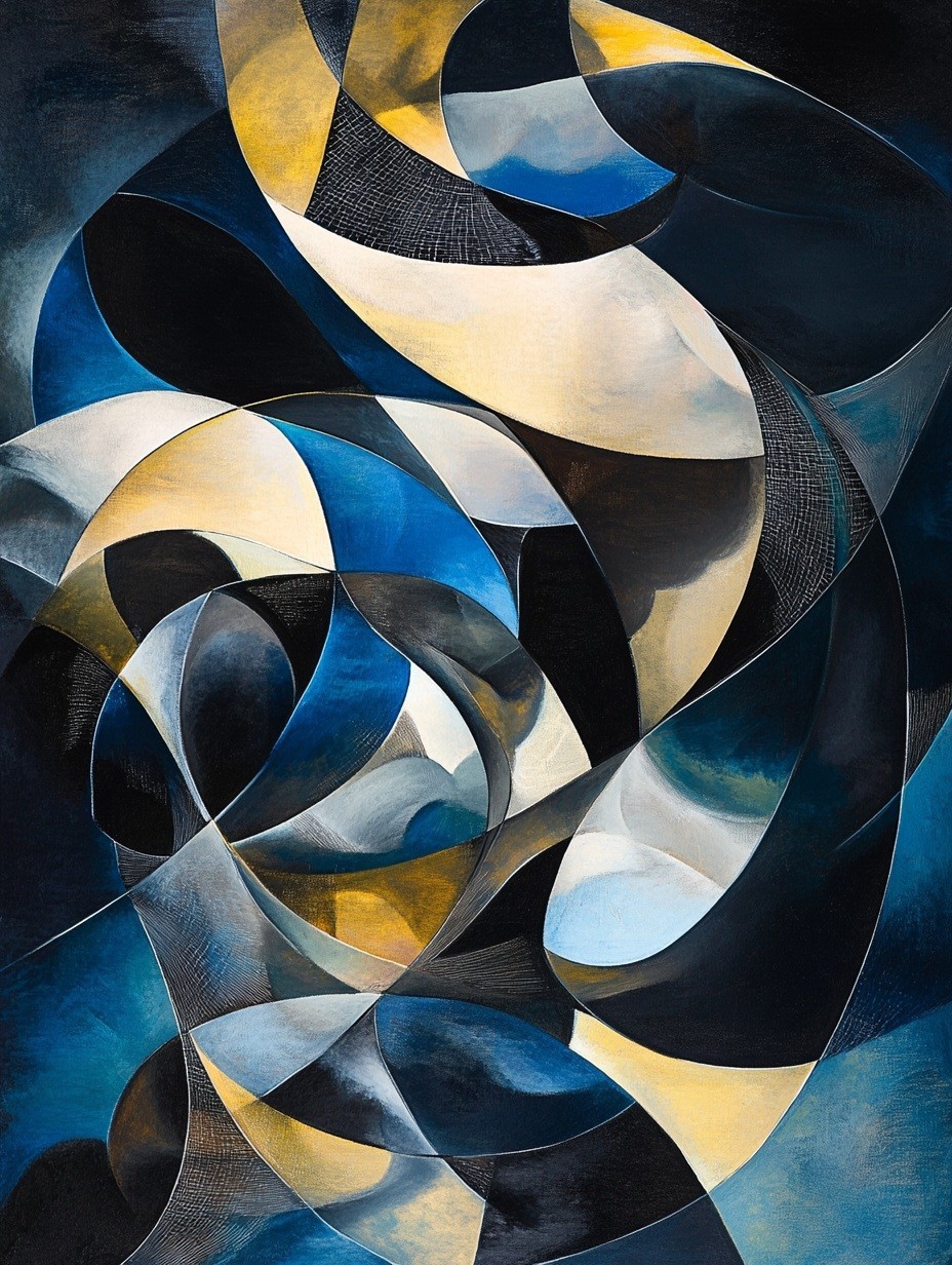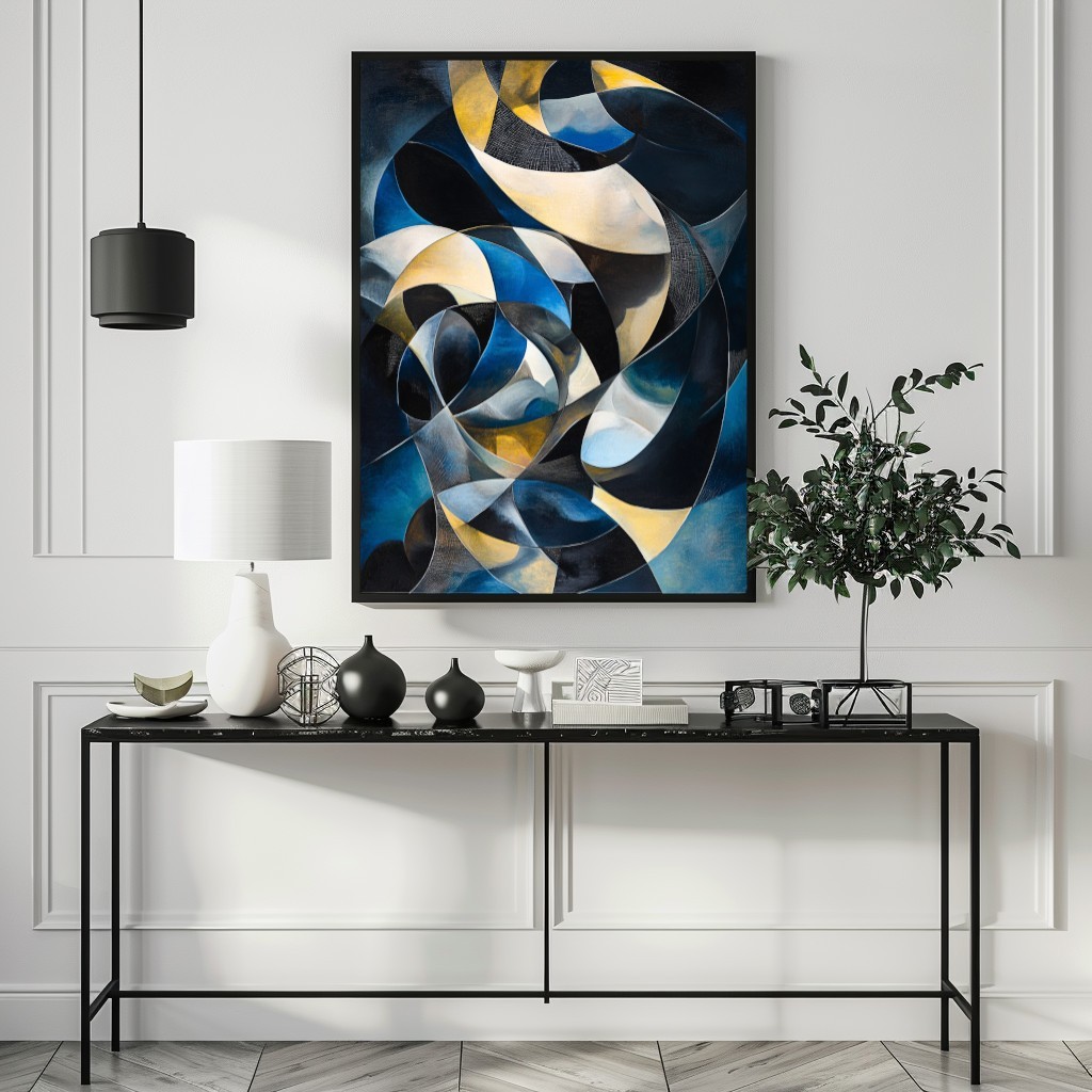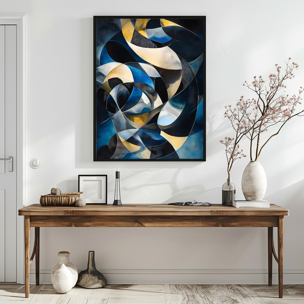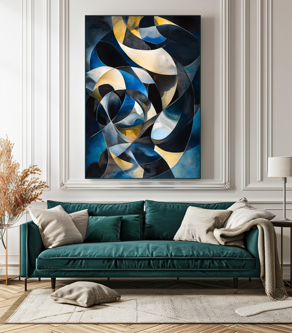 Questa straordinaria opera d’arte astratta geometrica fonde forme fluide e dinamiche in una palette sofisticata di blu profondo, oro e nero, creando un effetto ipnotico e raffinato. Le curve e le linee si intrecciano in un movimento armonioso, evocando un senso di energia e profondità. Perfetto per ambienti moderni e minimalisti, questo quadro aggiunge un tocco di lusso ed eleganza a salotti, uffici o spazi espositivi. Se cerchi un'opera d’arte unica e di impatto per decorare con stile e originalità, questa tela è la scelta perfetta.