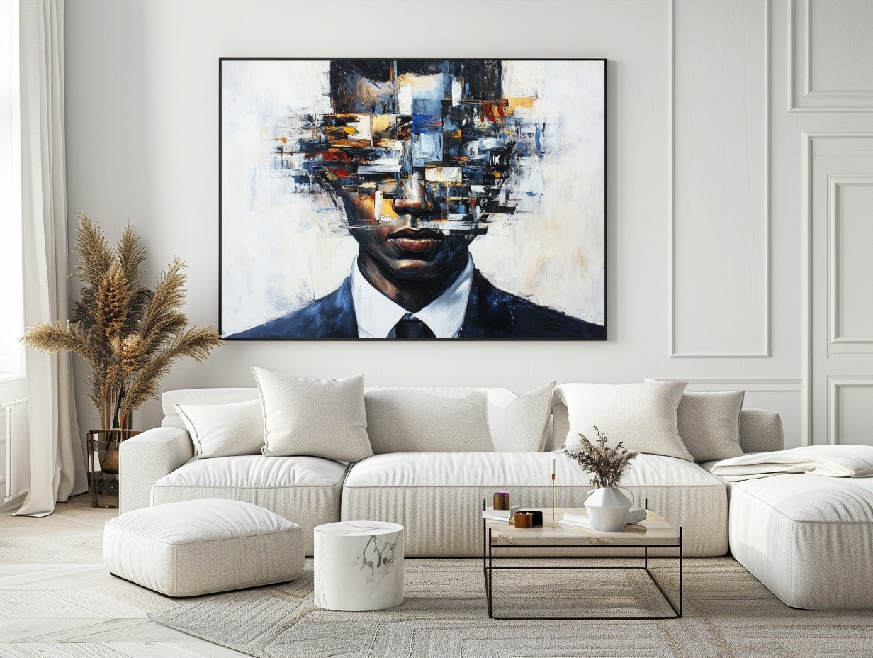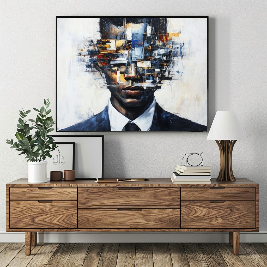 Questo dipinto astratto moderno raffigura un volto maschile frammentato in una composizione geometrica dinamica, dove il realismo incontra l’espressionismo astratto. Le pennellate decise e la fusione di tonalità scure con dettagli dorati e bianchi creano un effetto visivo d’impatto, perfetto per ambienti eleganti e minimalisti. Ideale per chi cerca un’opera d’arte concettuale, questo quadro evoca il tema dell’identità e della percezione, trasformando ogni spazio in una galleria d’arte contemporanea. Un’opera esclusiva per collezionisti e appassionati di arte astratta figurativa, perfetta per arredare salotti, uffici o spazi espositivi di design.