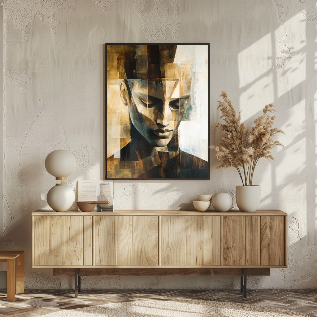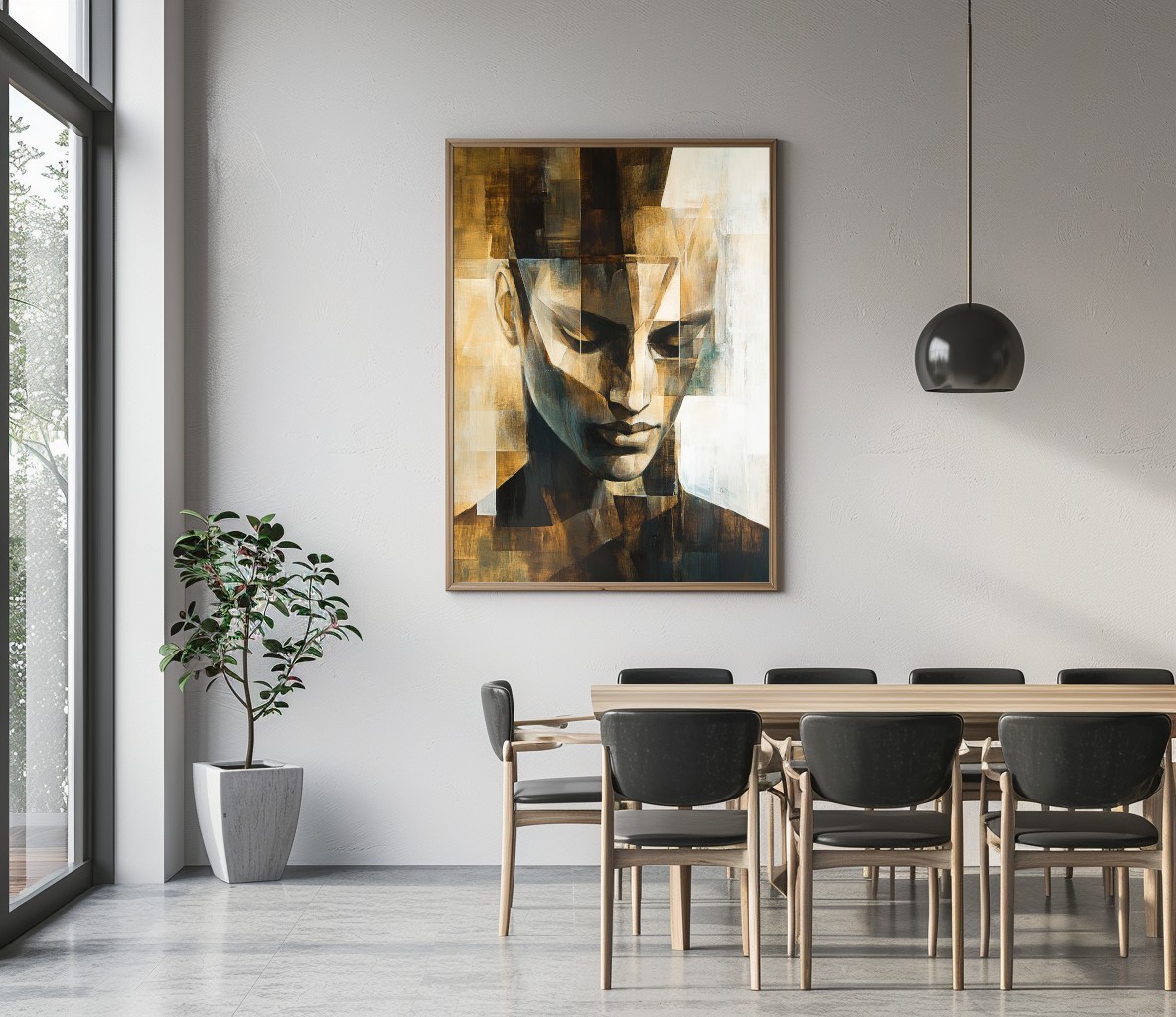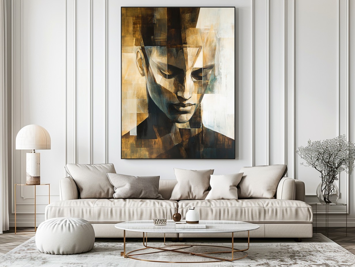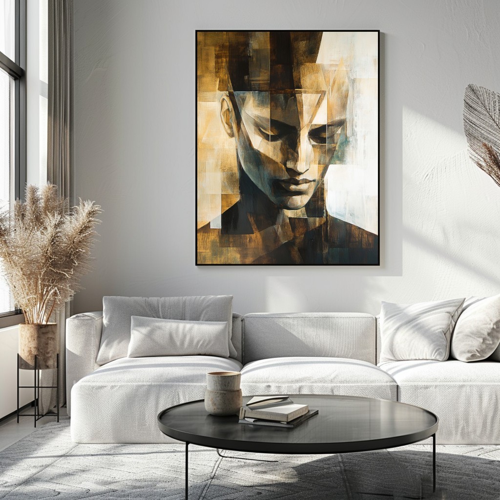 Questo dipinto astratto contemporaneo è un'opera d'arte che combina il cubismo moderno con l’espressionismo figurativo, creando un volto enigmatico frammentato da geometrie sovrapposte. Le tonalità calde di ocra, marrone e nero si fondono con sfumature delicate di bianco, donando profondità e contrasto. Perfetto per chi cerca un quadro astratto elegante per il salotto, l’ufficio o una galleria d’arte. Quest’opera esclusiva è ideale per gli amanti dell’arte concettuale e minimalista, aggiungendo un tocco di raffinatezza e mistero all’arredamento.