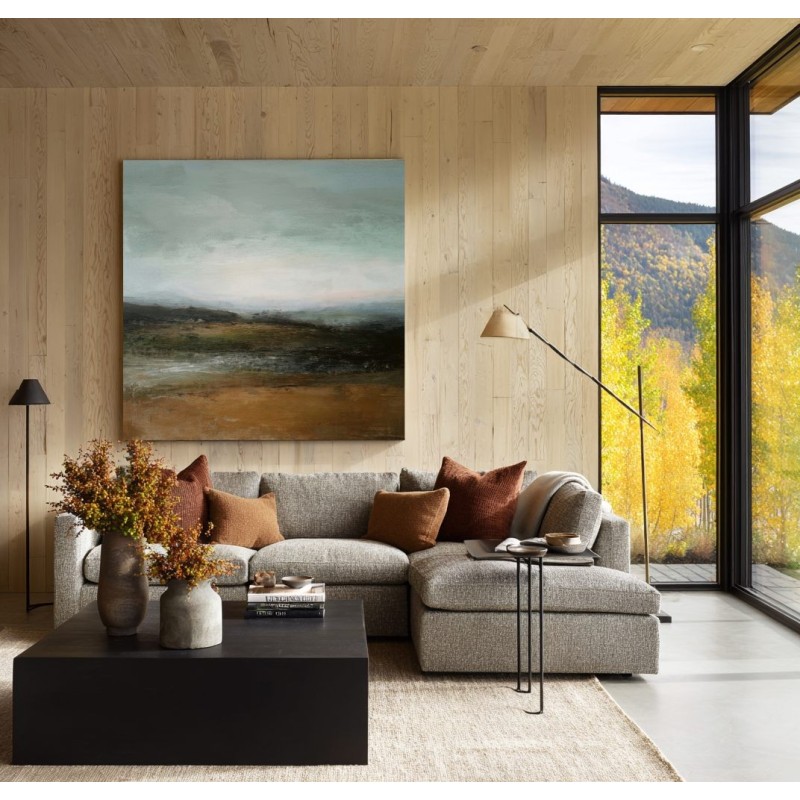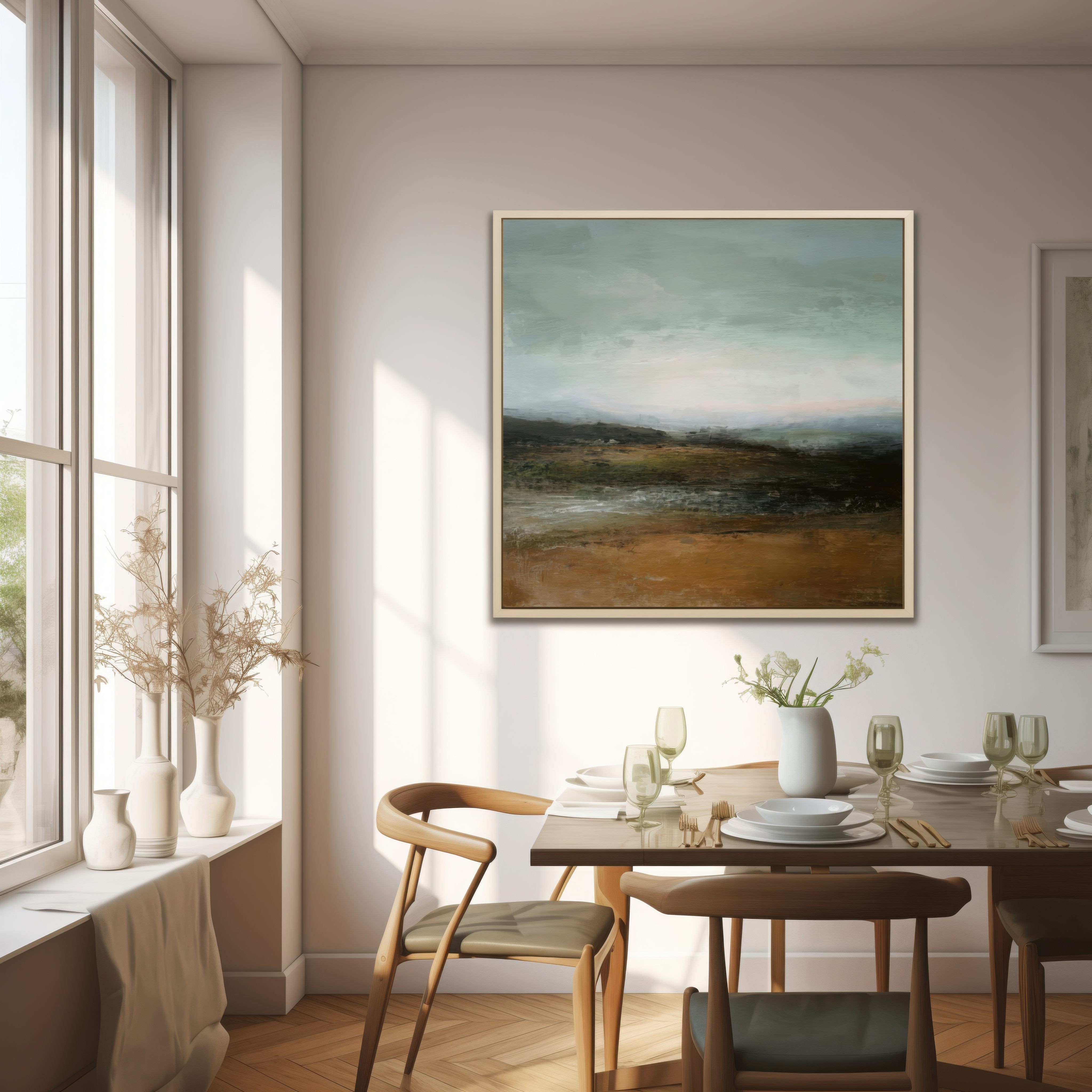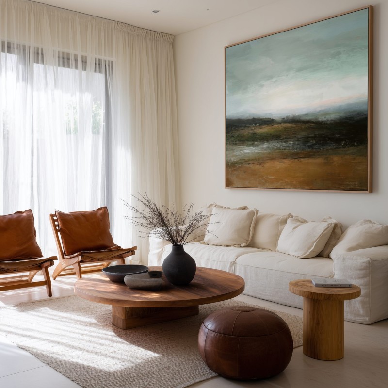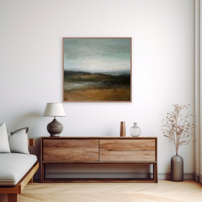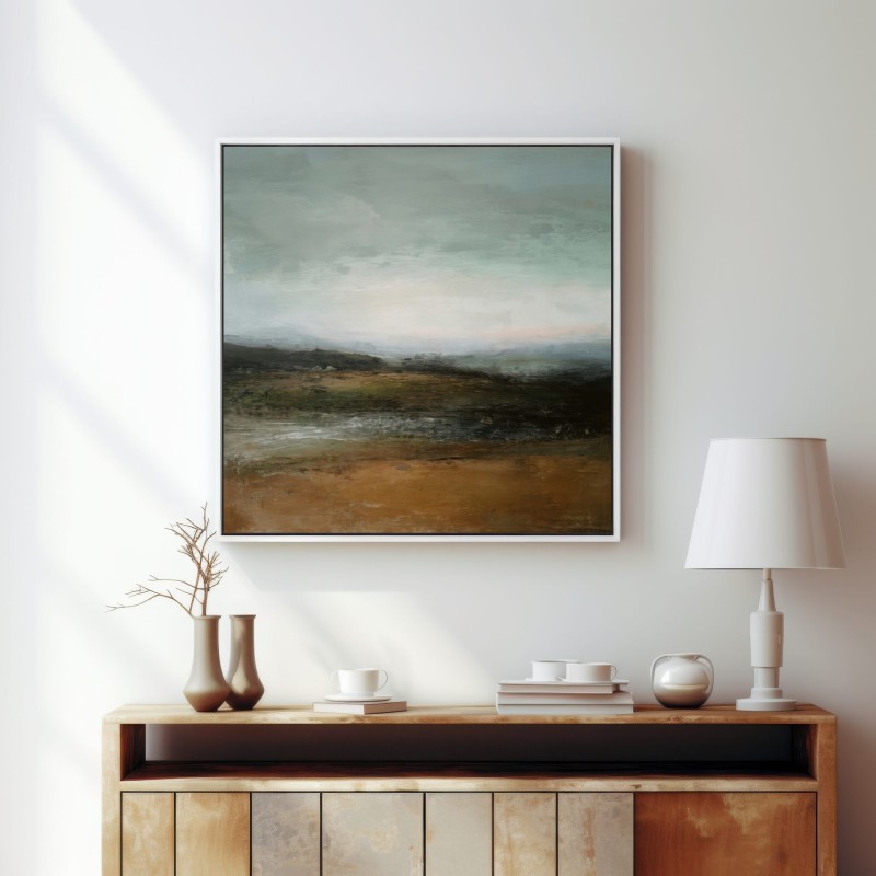 Questo quadro astratto contemporaneo rappresenta un paesaggio naturale avvolto da un’atmosfera silenziosa e meditativa. Le delicate sfumature verdi, terra e grigio azzurro evocano orizzonti aperti e una profonda connessione con la natura. La texture pittorica materica dona carattere senza appesantire l’ambiente, rendendolo ideale per arredamento moderno, stile minimal e interni Japandi. Perfetto come quadro decorativo per soggiorno, camera da letto o studio, crea equilibrio visivo e sensazione di calma.