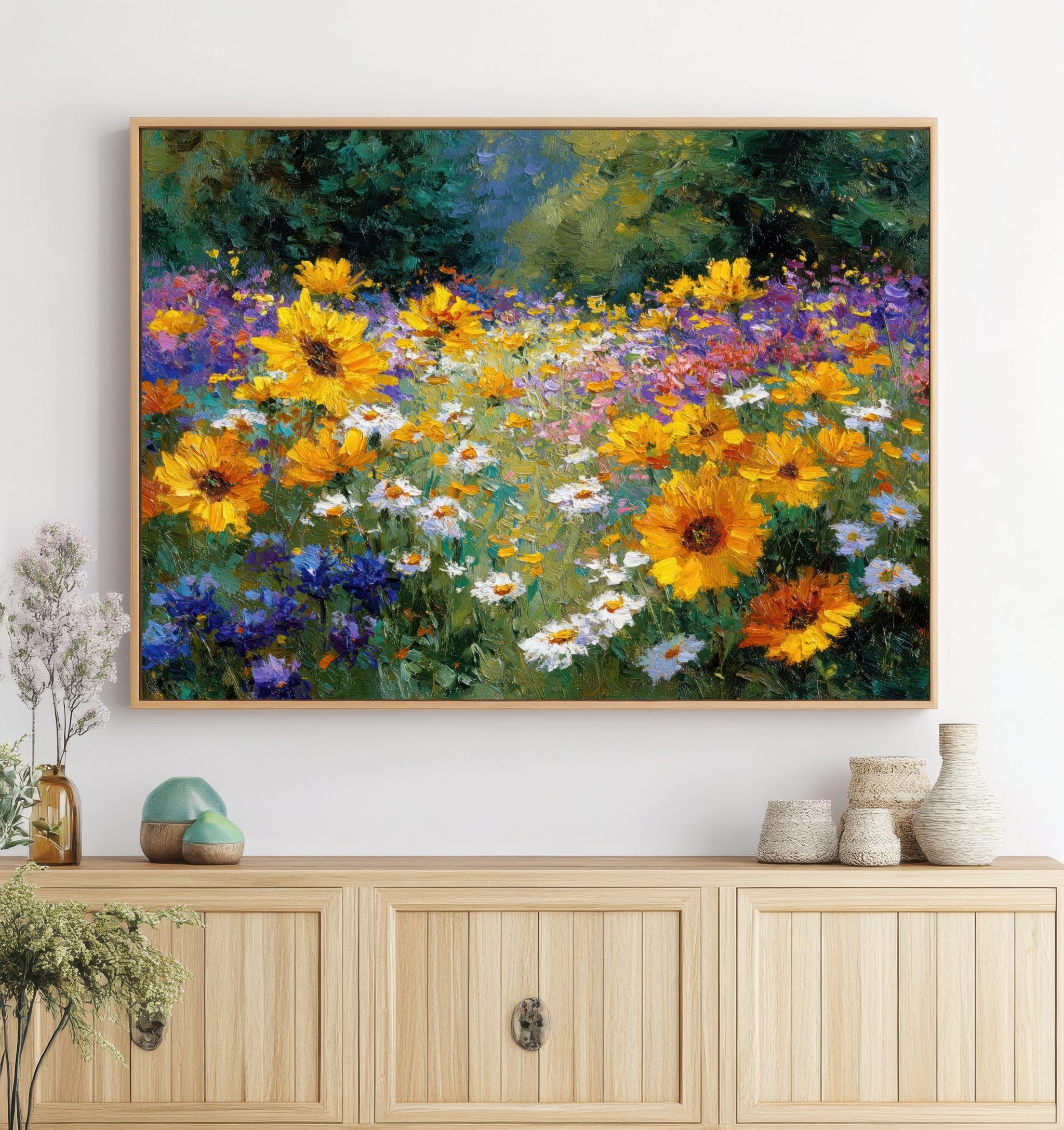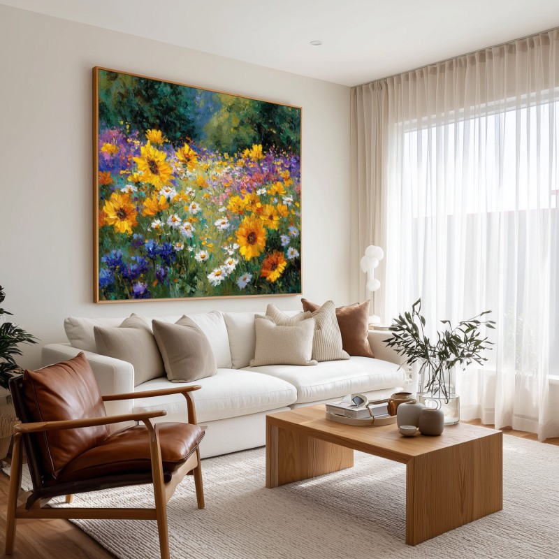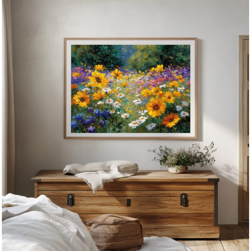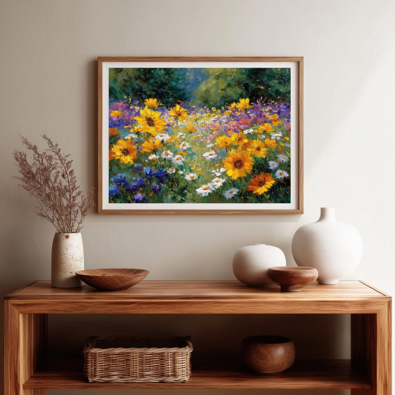 Questo quadro raffigurante un campo di fiori colorati trasmette tutta la vitalità e la bellezza della natura in piena fioritura. Girasoli luminosi, margherite bianche e fiori selvatici viola e blu creano una scena ricca di colore e movimento, immersa nella luce naturale del paesaggio.