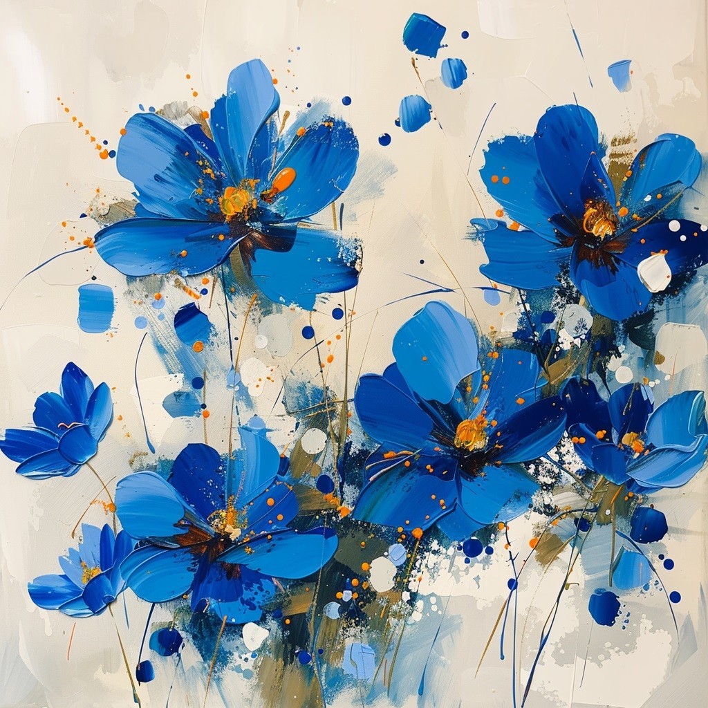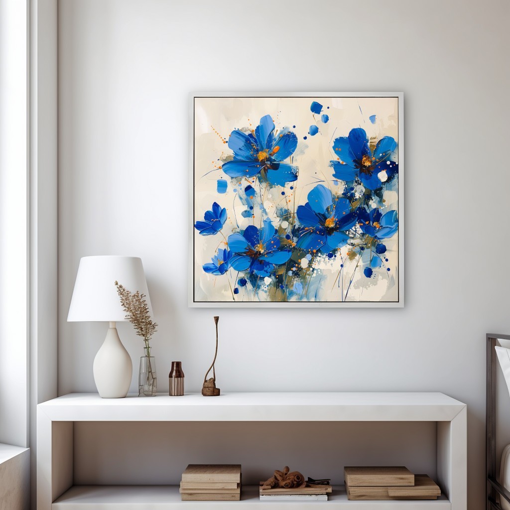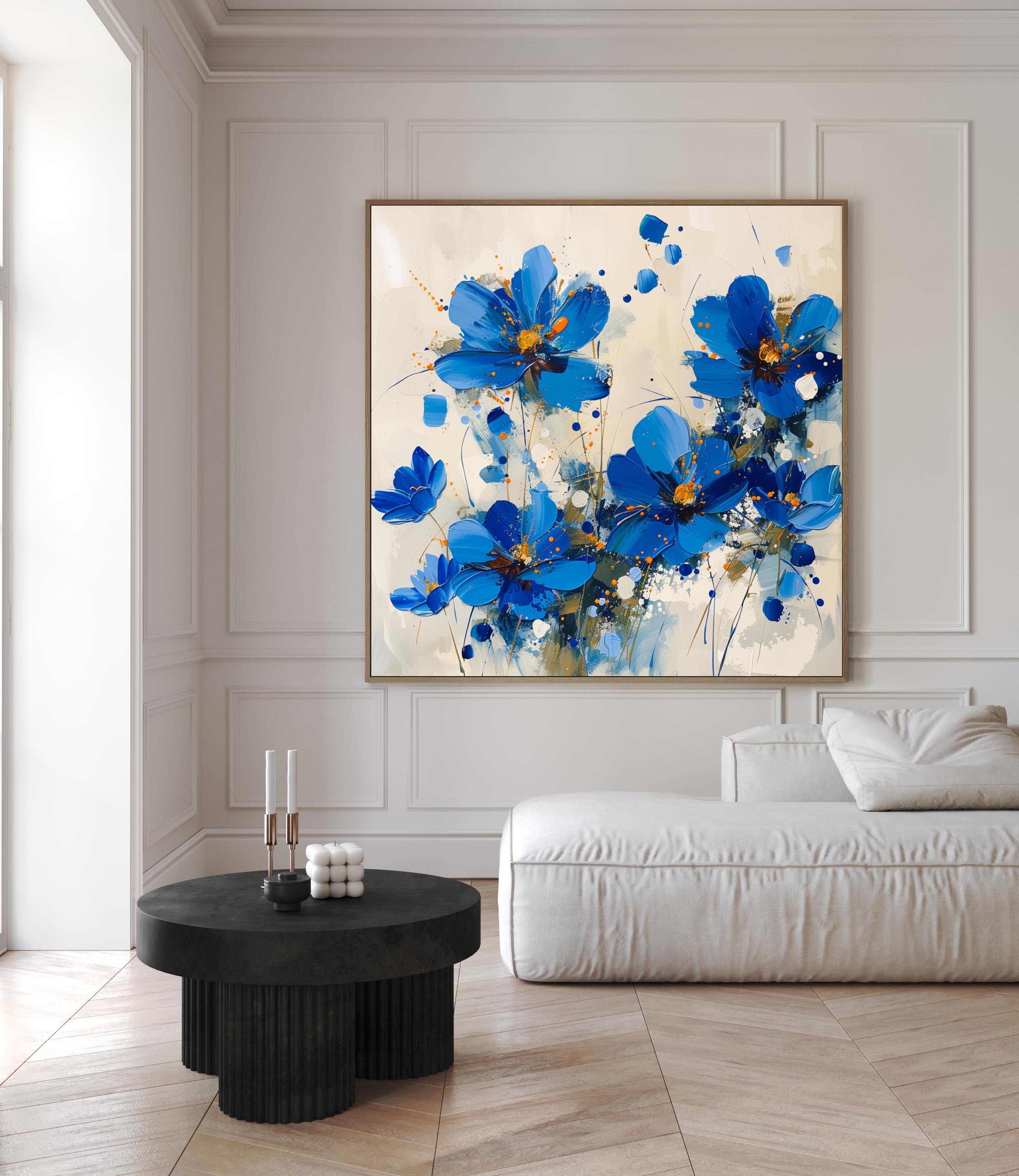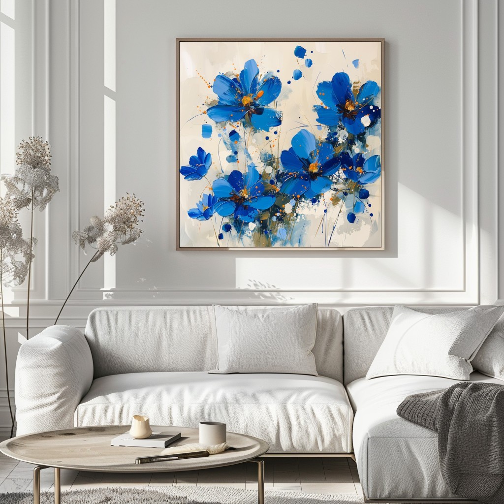 Dipinto Moderno con Fiori Blu – Eleganza e Vitalità per il tuo Spazio.