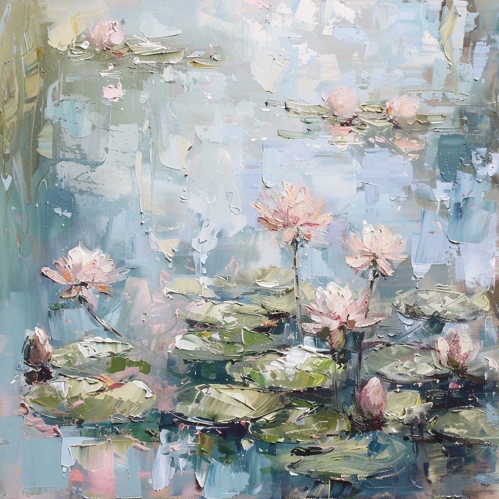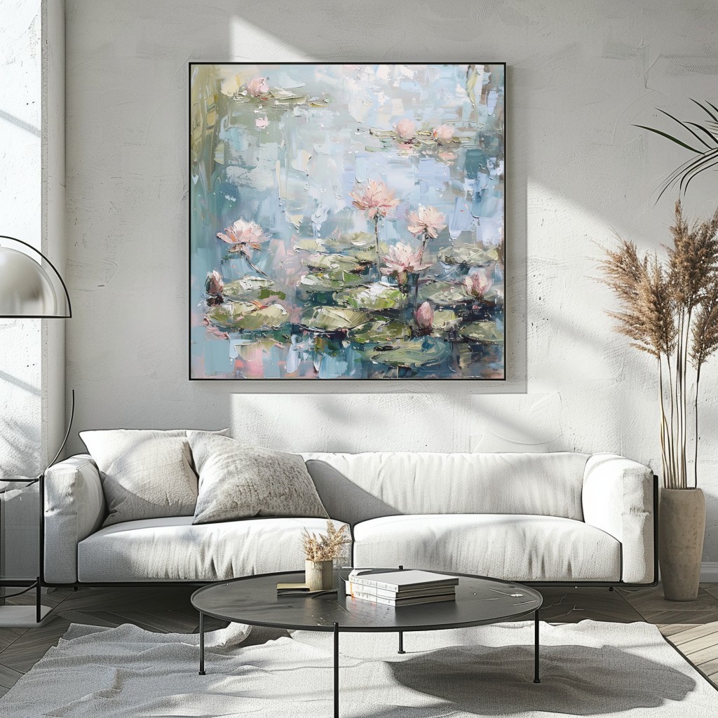 Questo quadro di ninfee cattura la bellezza eterea della natura acquatica con pennellate delicate e texture materiche. Le sfumature di azzurro, verde e rosa si intrecciano armoniosamente, creando un’atmosfera di serenità e raffinatezza. Perfetto per arricchire ambienti moderni e classici, il dipinto aggiunge un tocco di eleganza alla zona living, alla camera da letto o a spazi dedicati al relax. La qualità artistica e i dettagli tridimensionali lo rendono un'opera unica. Scopri l'arte delle ninfee e dona un senso di pace ai tuoi interni con questa meravigliosa creazione.