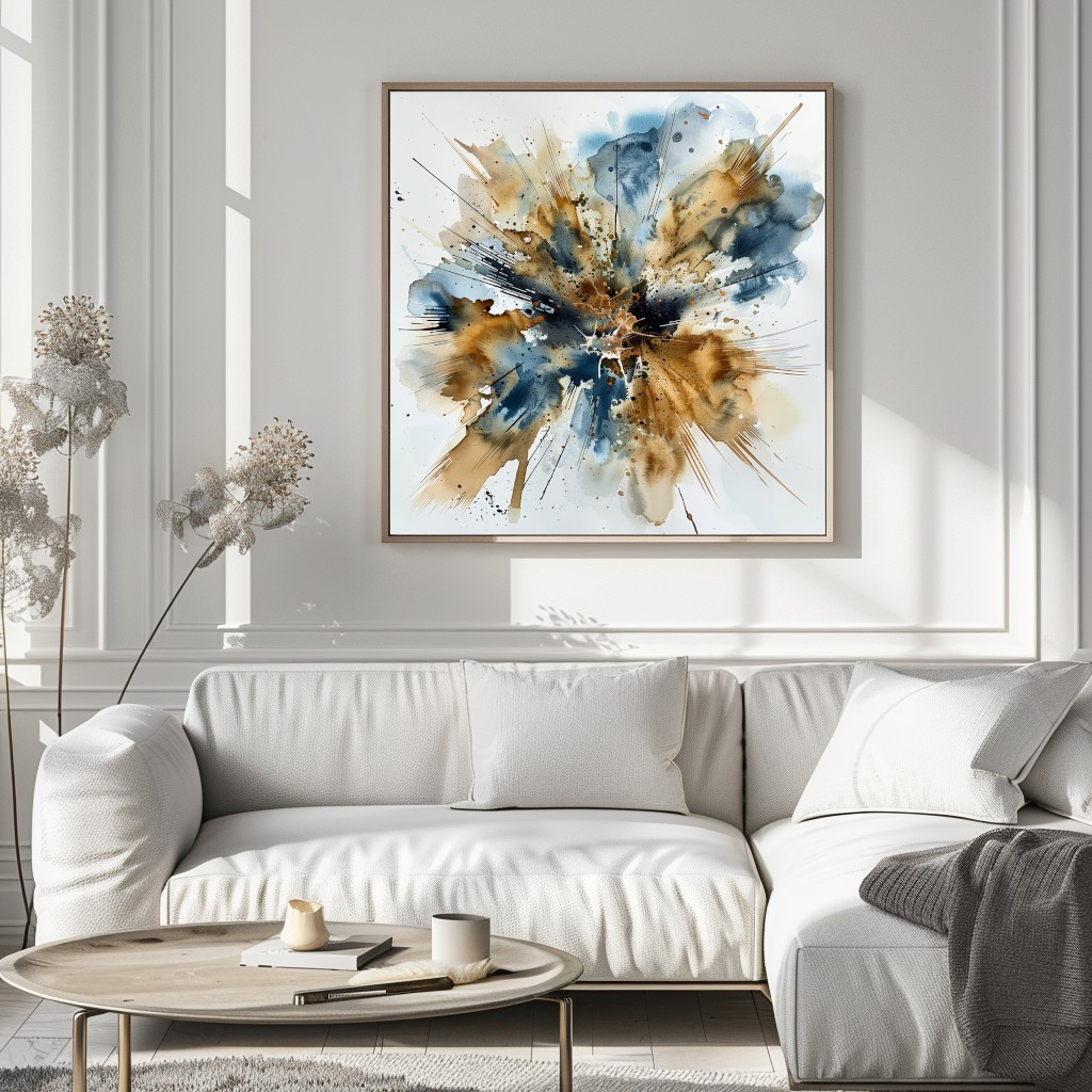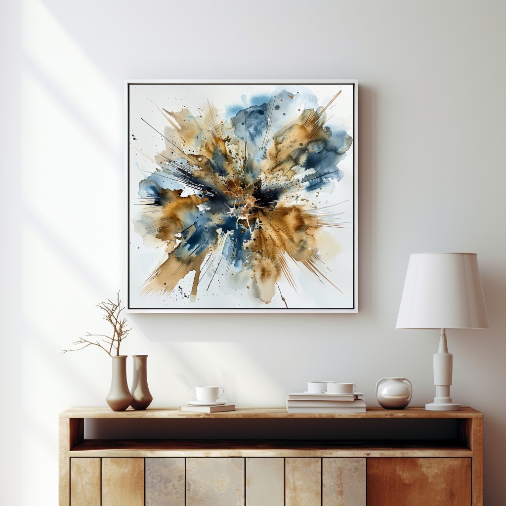 Questo quadro astratto moderno è una celebrazione dell’energia e del movimento. Le pennellate fluide e le sfumature di blu, oro e nero si espandono sulla tela come un’esplosione cosmica, creando un effetto visivo affascinante e dinamico. Perfetto per ambienti minimalisti, industriali o contemporanei, questo dipinto cattura lo sguardo e aggiunge personalità agli spazi. Ideale per arredare soggiorni, uffici o loft con un tocco artistico originale. Porta vitalità e modernità nelle tue pareti con questa straordinaria opera d’arte astratta, perfetta per chi ama l’arte contemporanea e le atmosfere innovative.