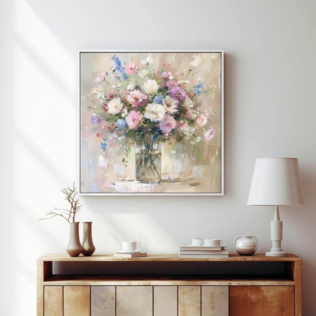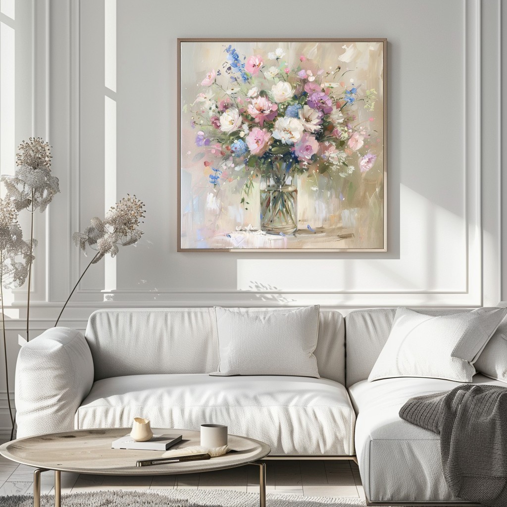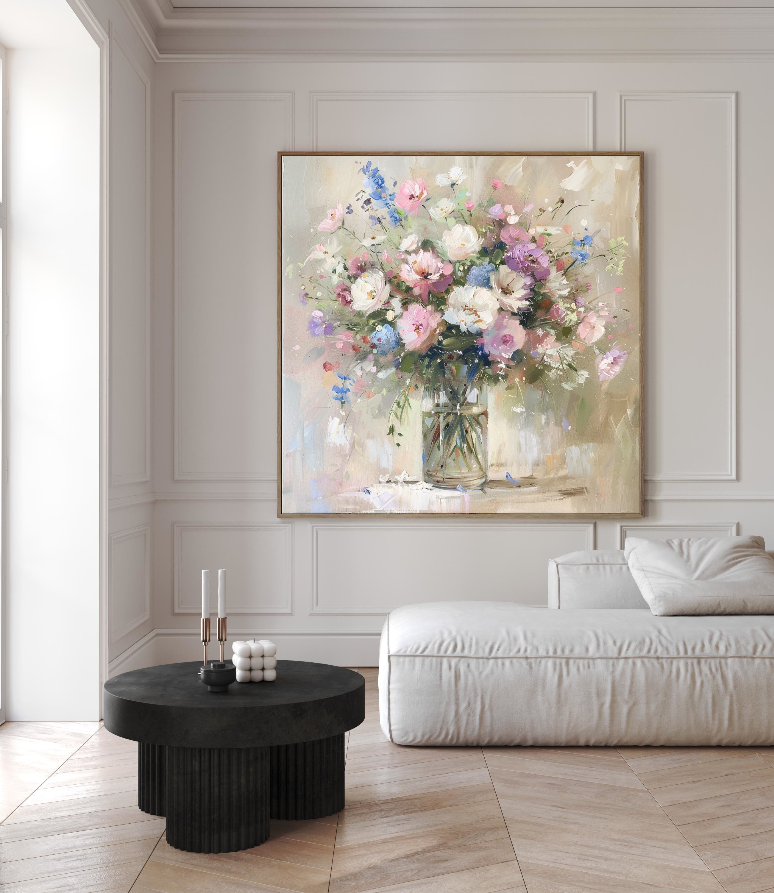 Questa splendida opera raffigura un bouquet di fiori in un vaso di vetro, dipinto con una tecnica che combina delicatezza e spontaneità. Le tonalità di rosa tenue, bianco, lilla e azzurro si fondono in un equilibrio armonioso, mentre il fondo neutro e leggermente sfumato esalta la freschezza dei fiori.