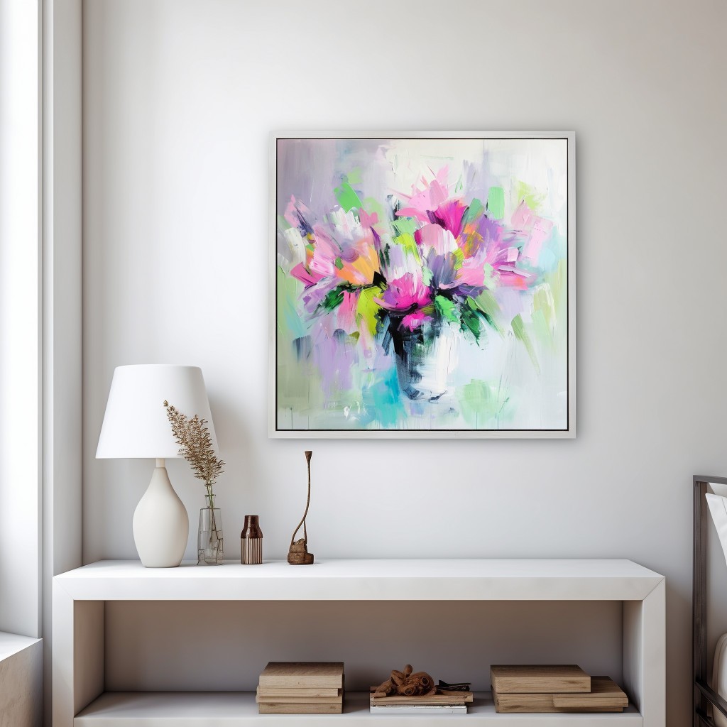 Questa straordinaria opera d’arte celebra la potenza del colore e del movimento, trasmettendo una vivacità unica attraverso pennellate audaci e dinamiche. Il bouquet, astratto e vibrante, si manifesta in una fusione di rosa intenso, verde lime, lilla e tocchi di giallo, creando un effetto di pura energia visiva. Il vaso, accennato con leggerezza, dona profondità alla composizione, mentre il fondo chiaro e sfumato esalta il contrasto cromatico.
