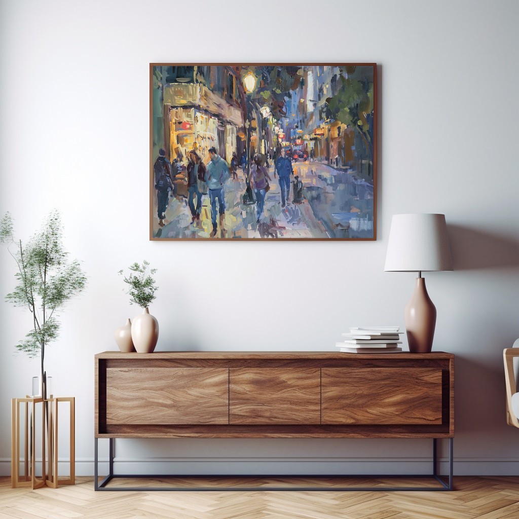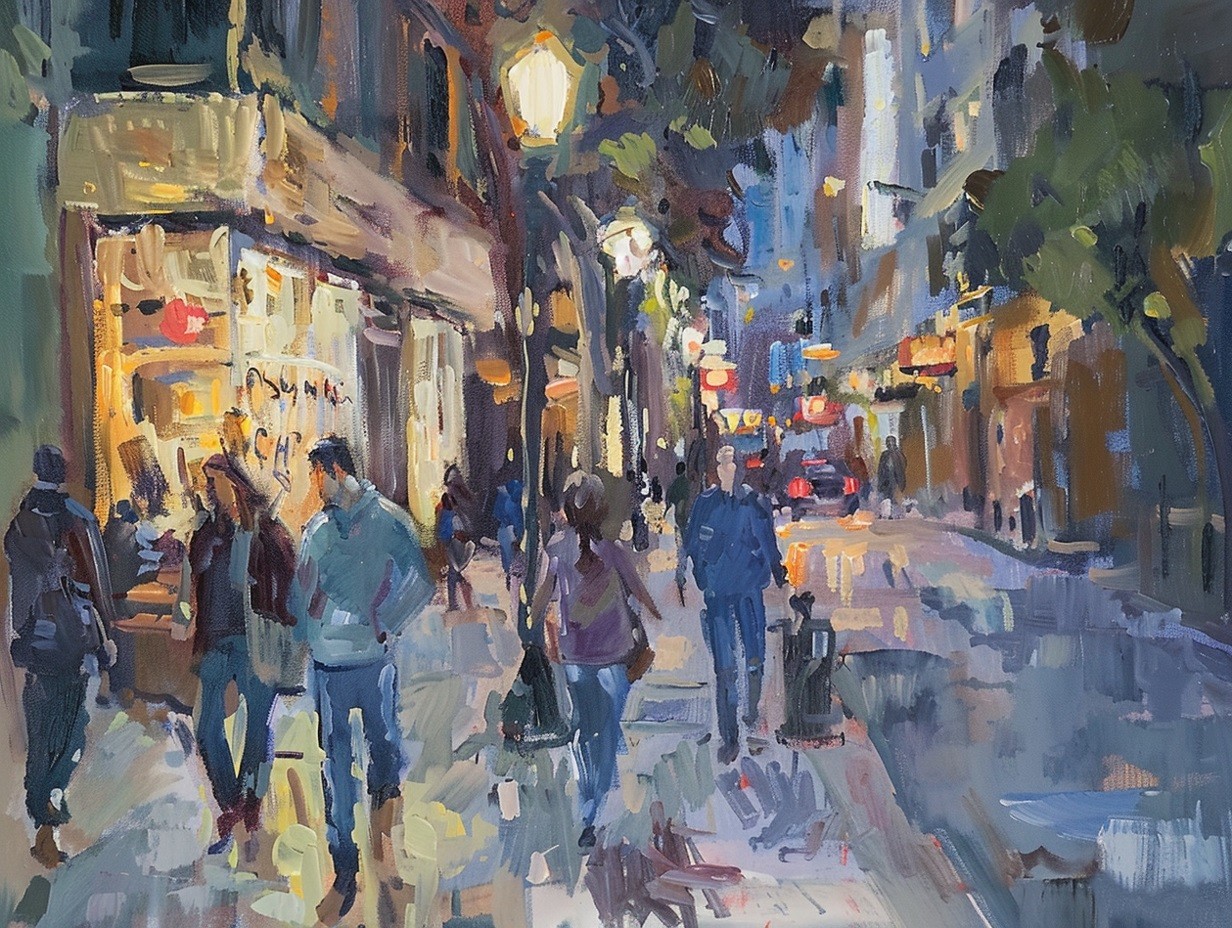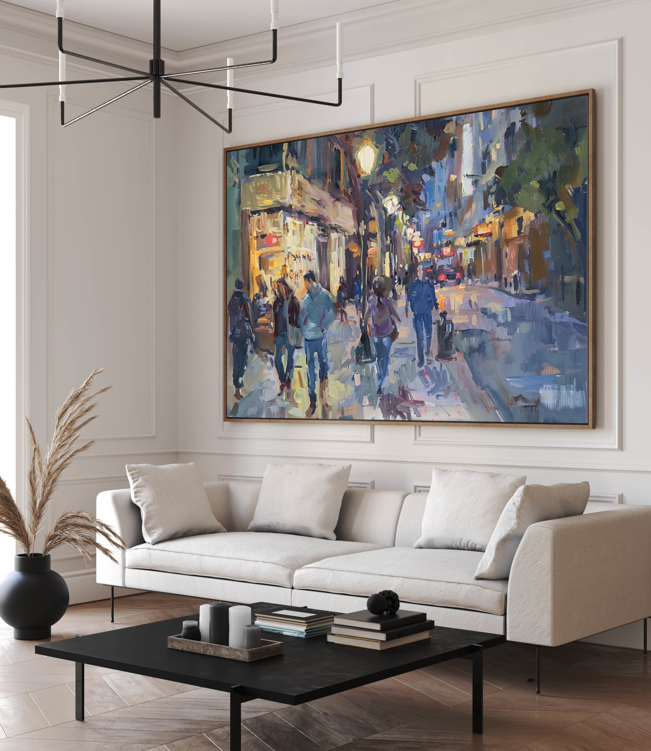 Questo dipinto impressionista cattura la magia della vita notturna in città, con le sue luci calde che si riflettono sulle strade bagnate e la vivace energia dei passanti. Le pennellate espressive e i toni sfumati creano un'atmosfera suggestiva, perfetta per un quadro moderno da inserire in un soggiorno o uno studio elegante. L'uso di colori caldi e freddi bilancia perfettamente il dinamismo urbano con la tranquillità della sera. Ideale per gli amanti dell’arte impressionista contemporanea, questo capolavoro dona un tocco sofisticato agli spazi abitativi.