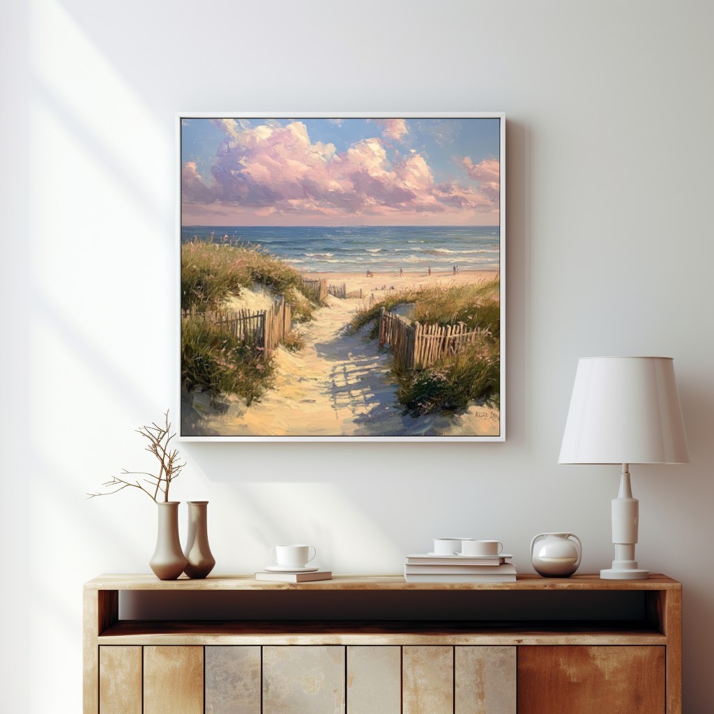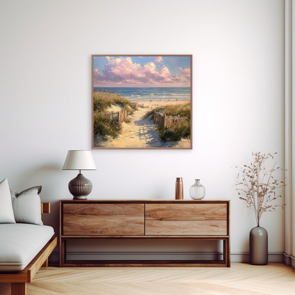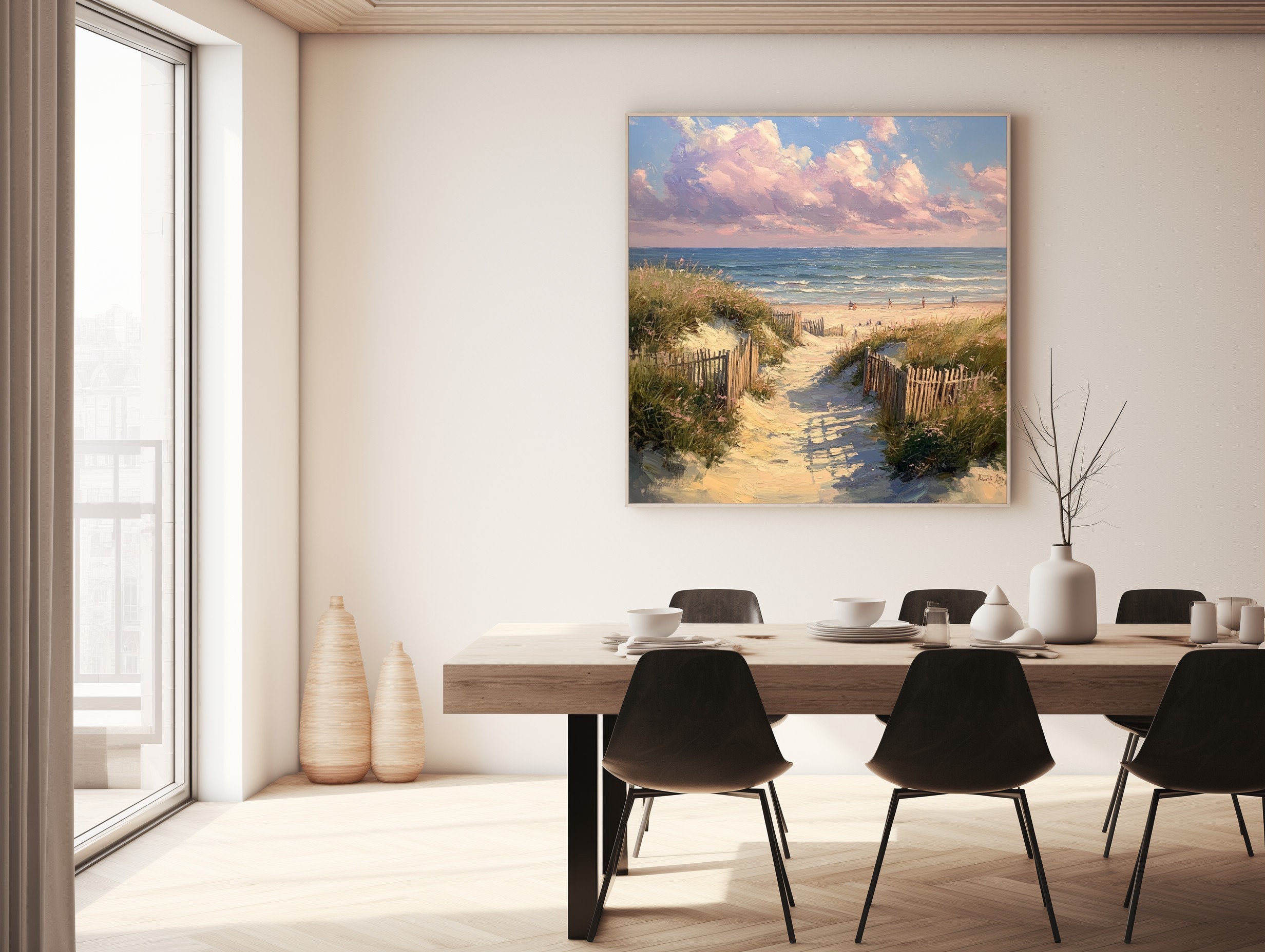 Un'opera che cattura l'essenza dell'estate, trasportando l’osservatore in un paesaggio marino dal fascino senza tempo. Il sentiero sabbioso, incorniciato da staccionate di legno e dune erbose, guida dolcemente verso l’oceano, dove il blu intenso dell’acqua incontra il cielo, punteggiato da nuvole soffici illuminate dal sole.