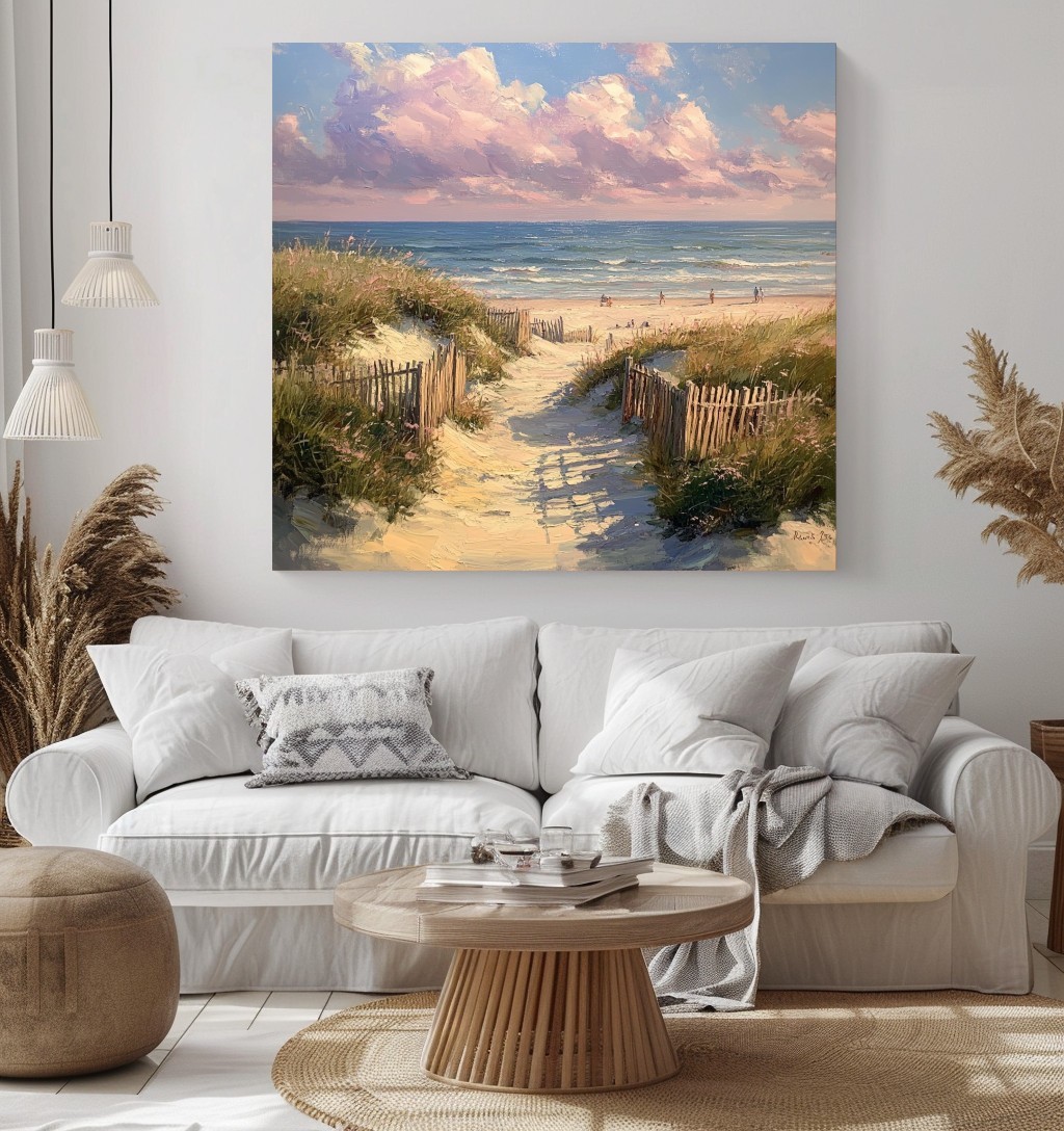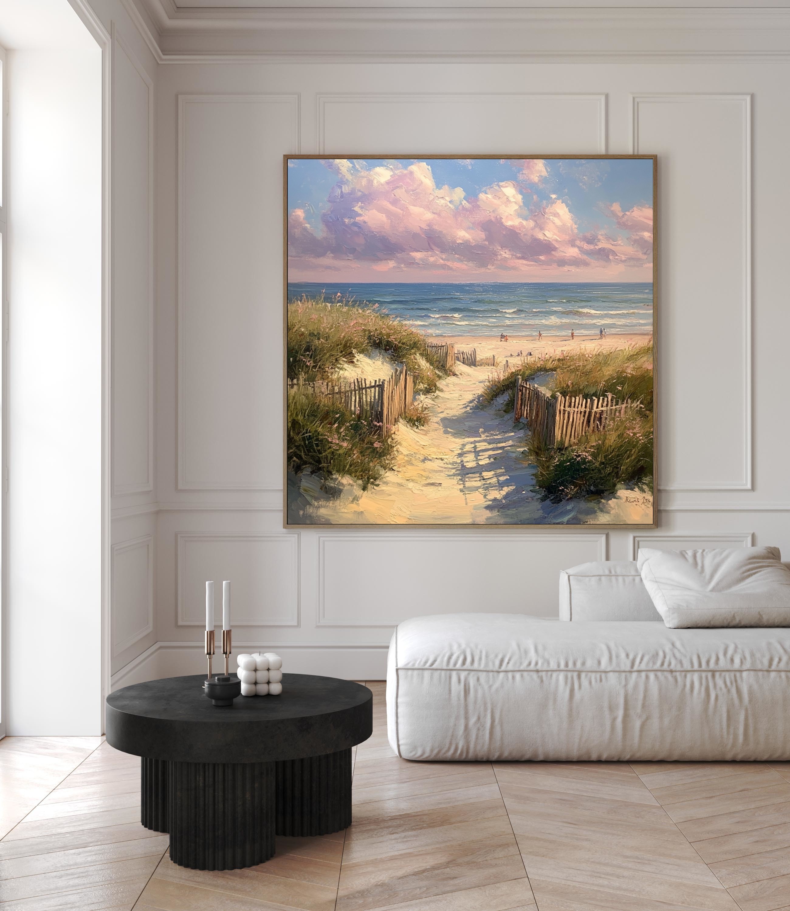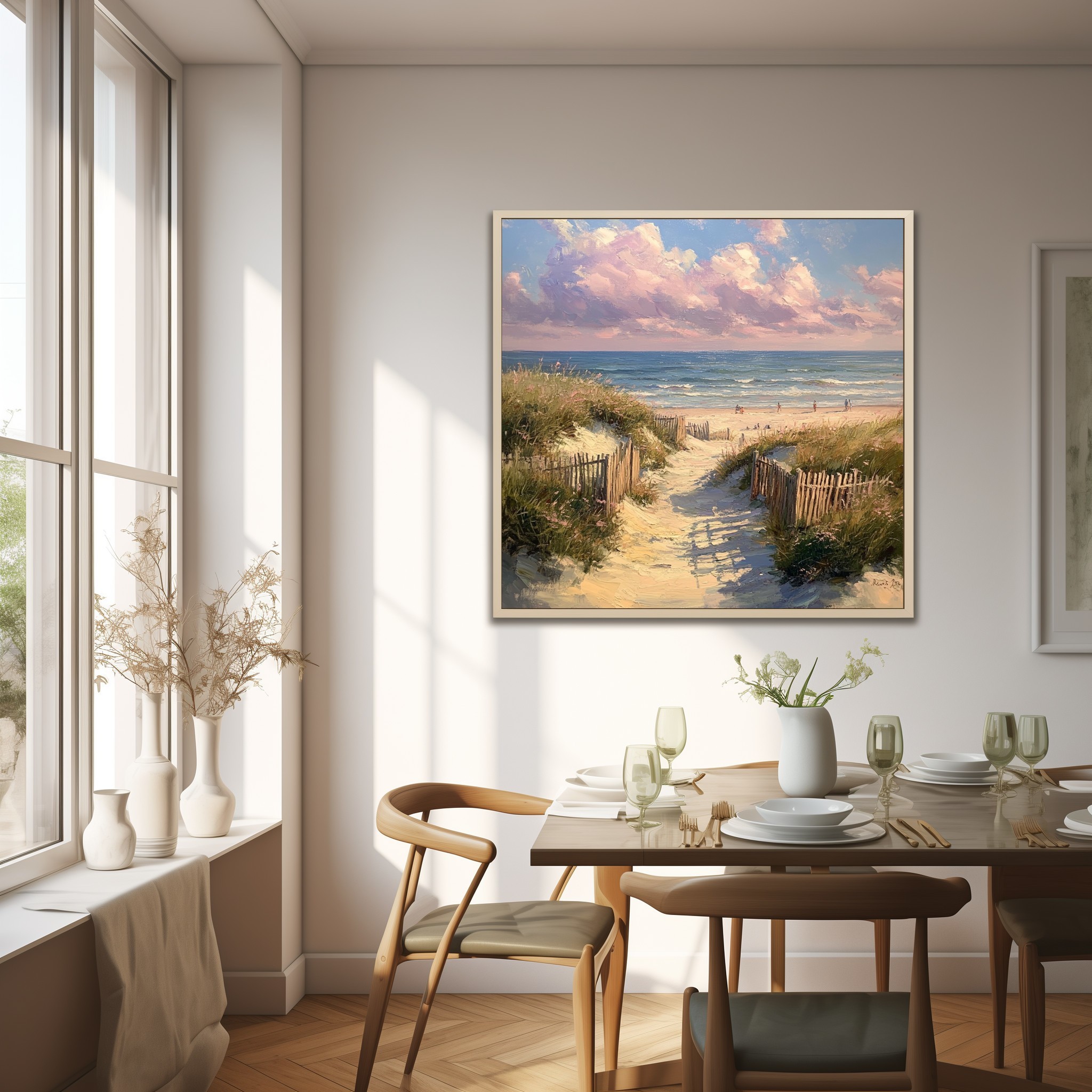 Un'opera che cattura l'essenza dell'estate, trasportando l’osservatore in un paesaggio marino dal fascino senza tempo. Il sentiero sabbioso, incorniciato da staccionate di legno e dune erbose, guida dolcemente verso l’oceano, dove il blu intenso dell’acqua incontra il cielo, punteggiato da nuvole soffici illuminate dal sole.