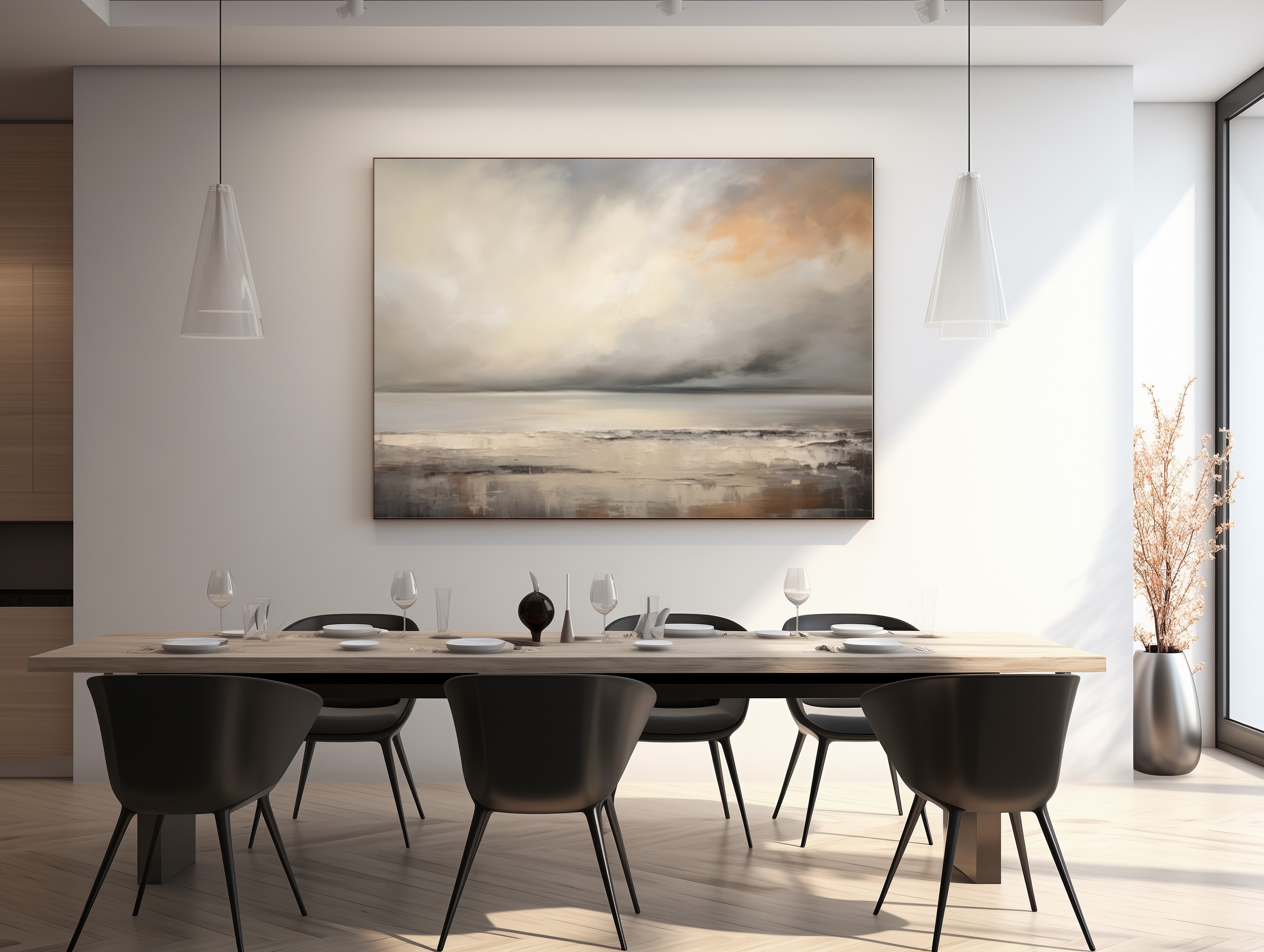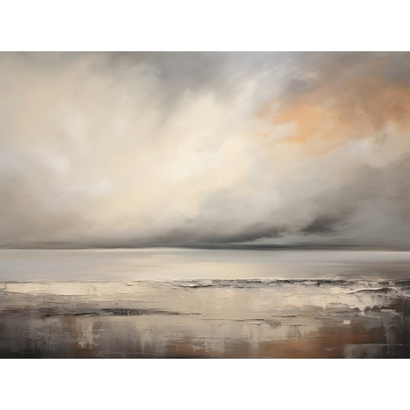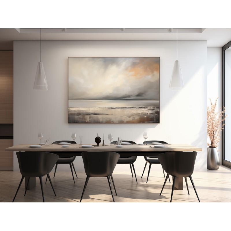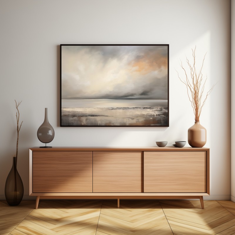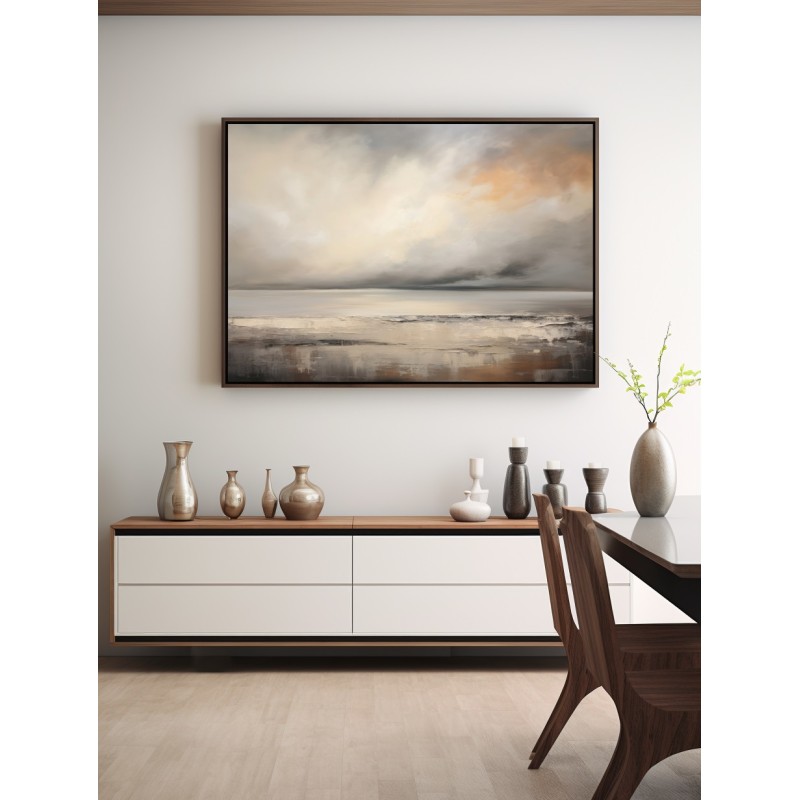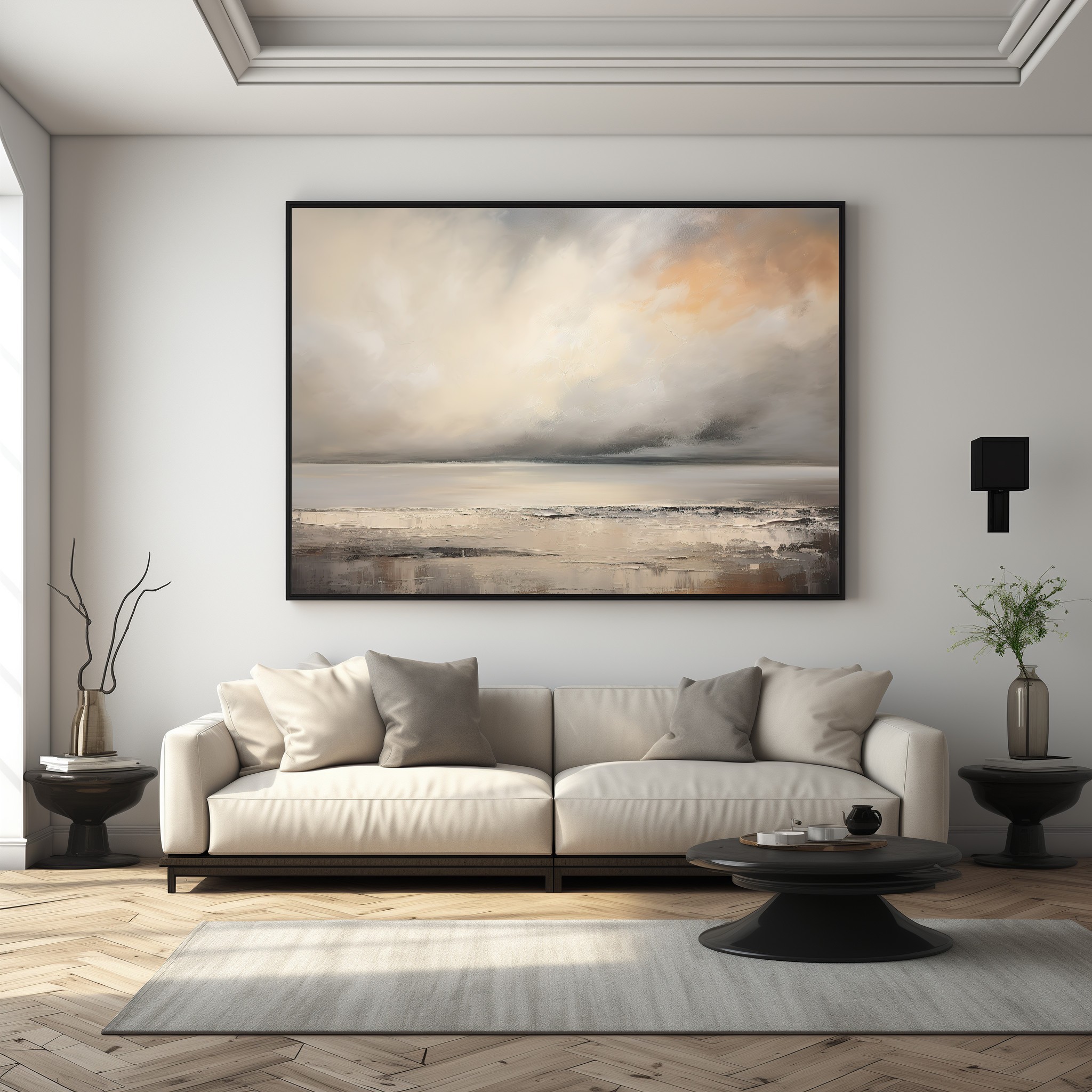 Questo quadro astratto evoca la quiete di un tramonto sul mare, con una tavolozza neutra e calda di beige, grigio e accenni dorati. Le sfumature morbide e i riflessi sull’acqua creano un’atmosfera di profonda serenità e introspezione. Perfetto per ambienti moderni, stile minimal o Japandi, dona eleganza e armonia visiva. Ideale per soggiorni, camere da letto o spazi di relax, questo paesaggio contemporaneo unisce arte e calma, diventando un punto focale raffinato e senza tempo.