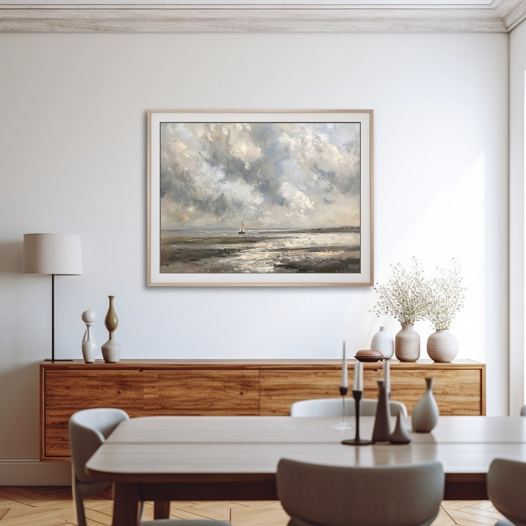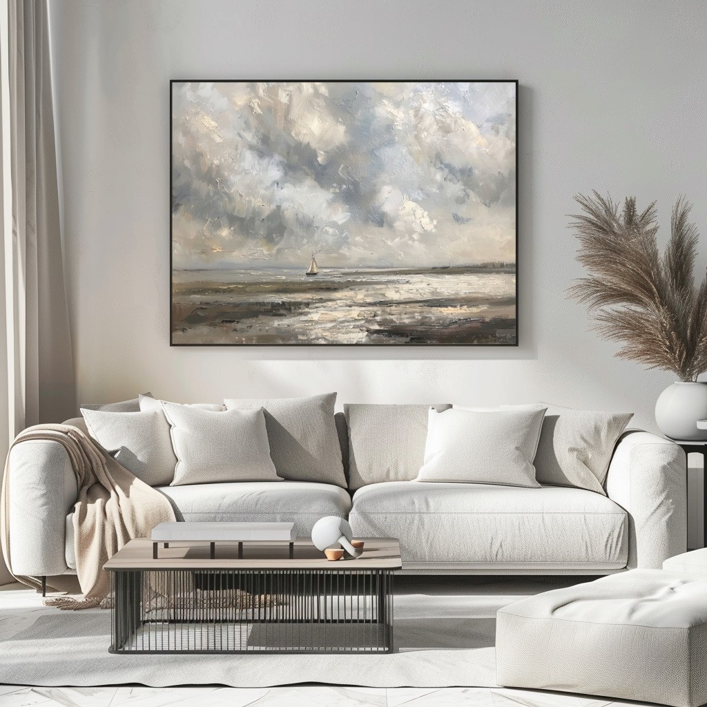 Le tonalità neutre di grigio, beige e bianco aggiungono un tocco di eleganza e raffinatezza, rendendolo perfetto per interni classici, moderni o in stile coastal. Ideale per soggiorni, studi o spazi di meditazione, questo quadro è un’opera d’arte senza tempo che porta la potenza del mare nella tua casa.