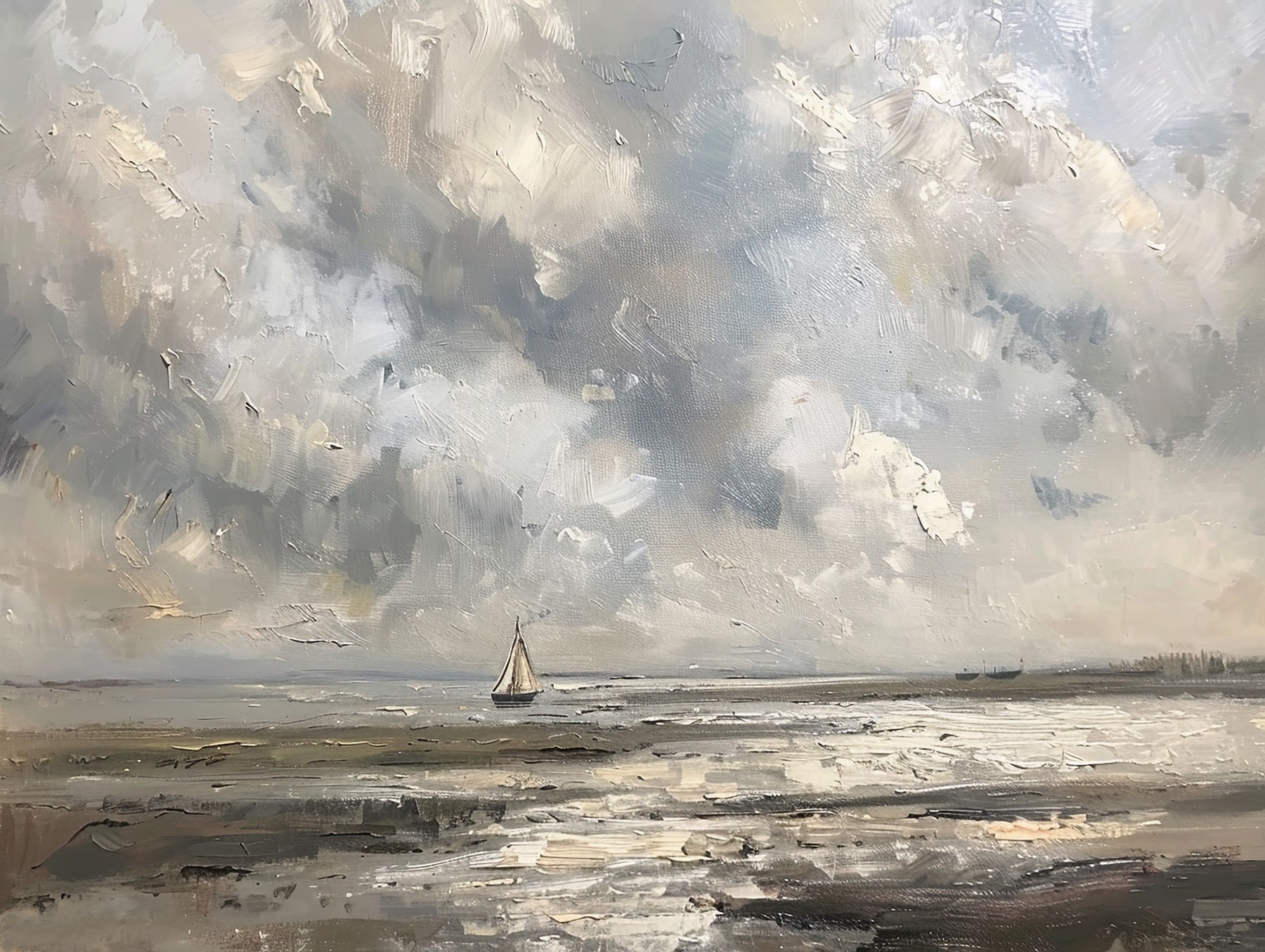 Questo suggestivo dipinto marino esprime la forza e la bellezza del mare con un’interpretazione artistica ricca di texture e profondità. Le pennellate materiche e dinamiche creano un cielo tempestoso carico di emozione, mentre un’unica barca a vela solitaria naviga attraverso le onde, evocando un senso di avventura e introspezione.