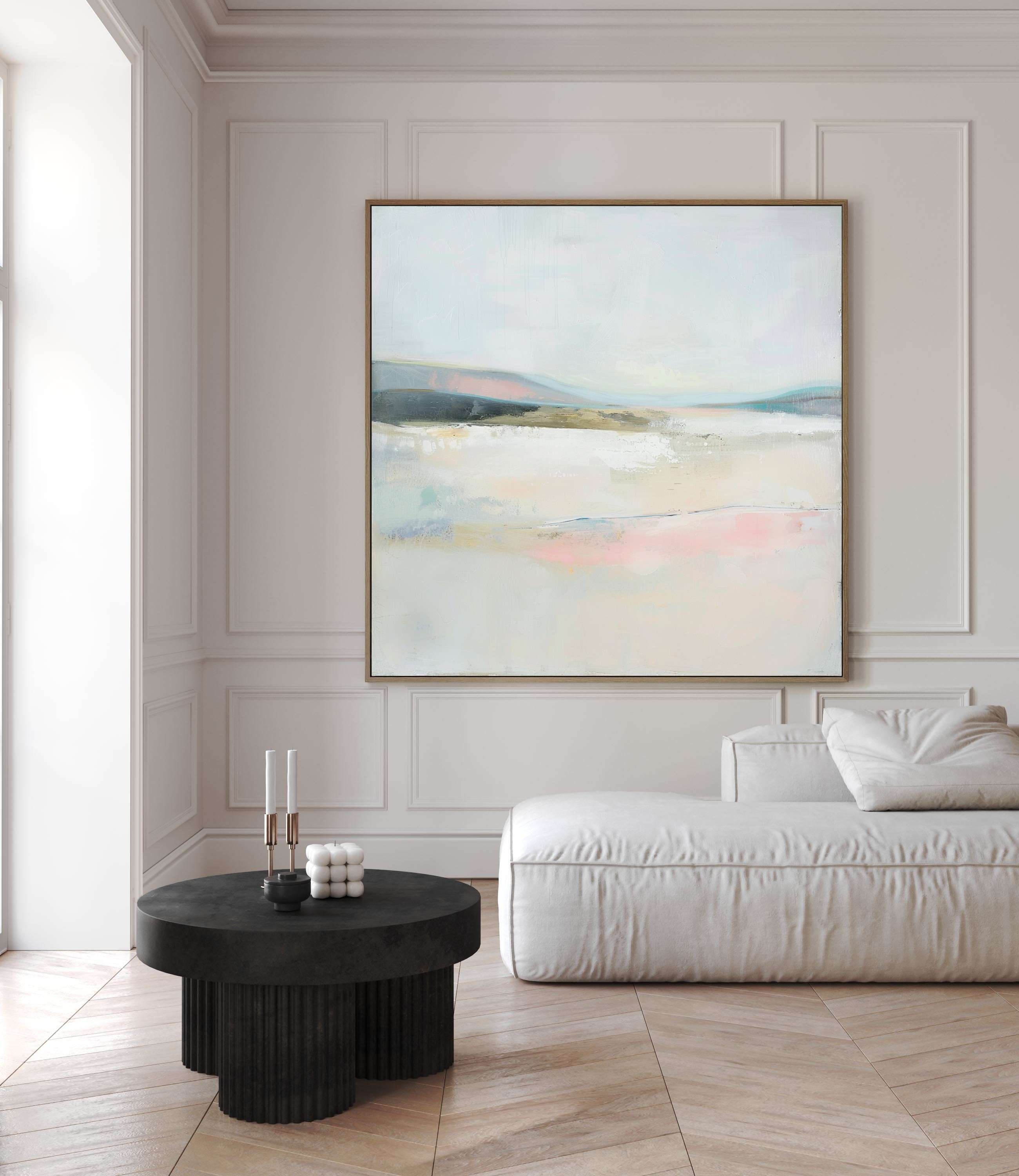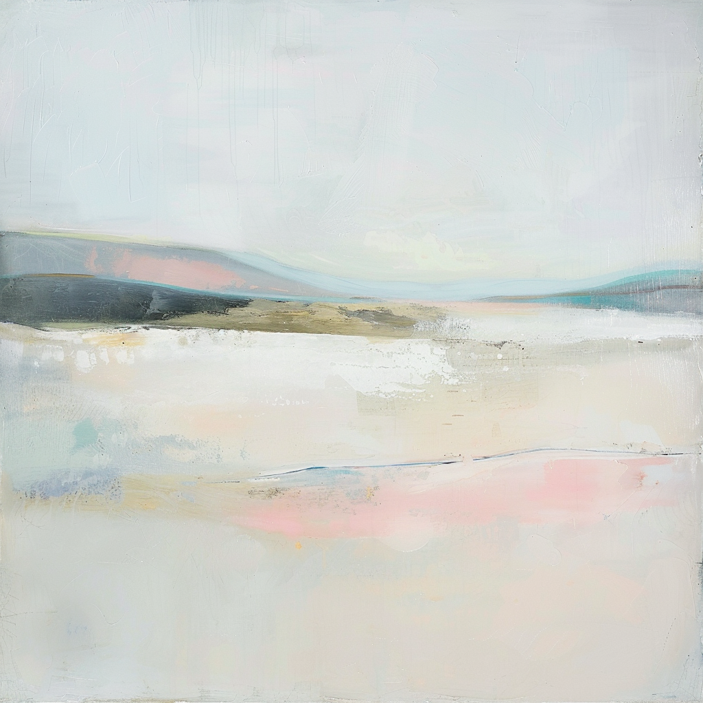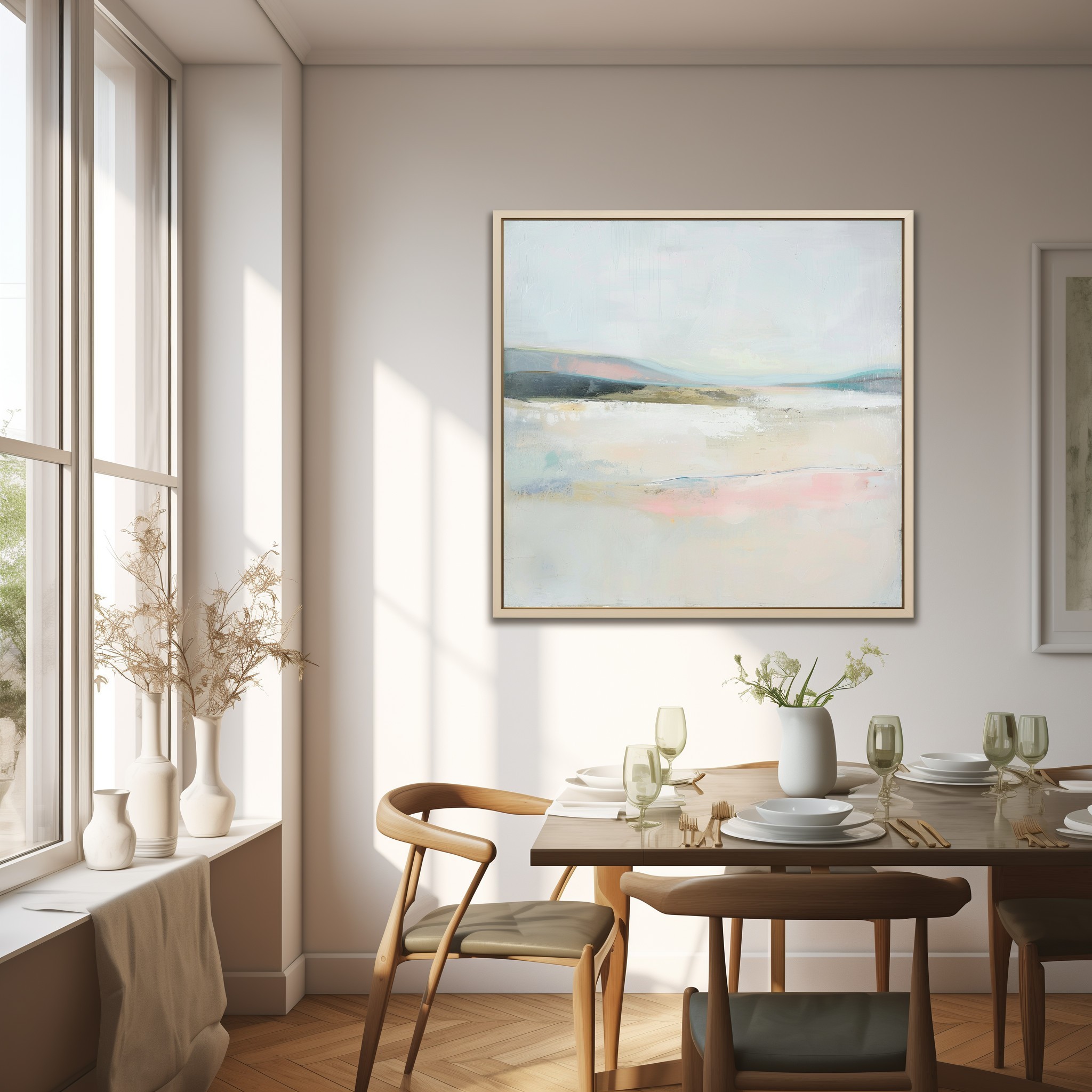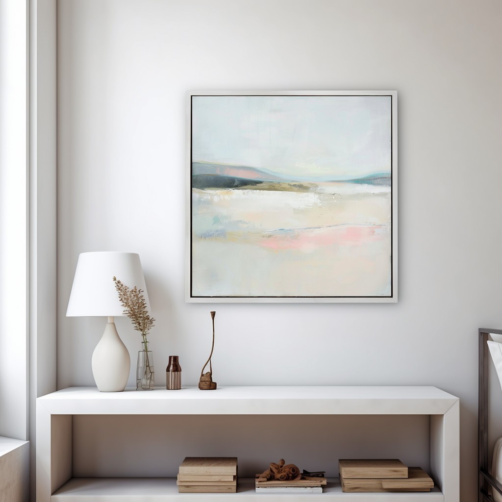 Questo raffinato dipinto astratto paesaggistico trasmette un senso di pace e minimalismo attraverso una palette di colori delicati e armoniosi. Le sfumature di bianco, beige, rosa cipria e azzurro si fondono in una composizione eterea, evocando un paesaggio costiero immerso nella luce soffusa del mattino. Le pennellate morbide e stratificate creano profondità e movimento, rendendo l’opera perfetta per ambienti moderni, minimalisti o scandinavi.