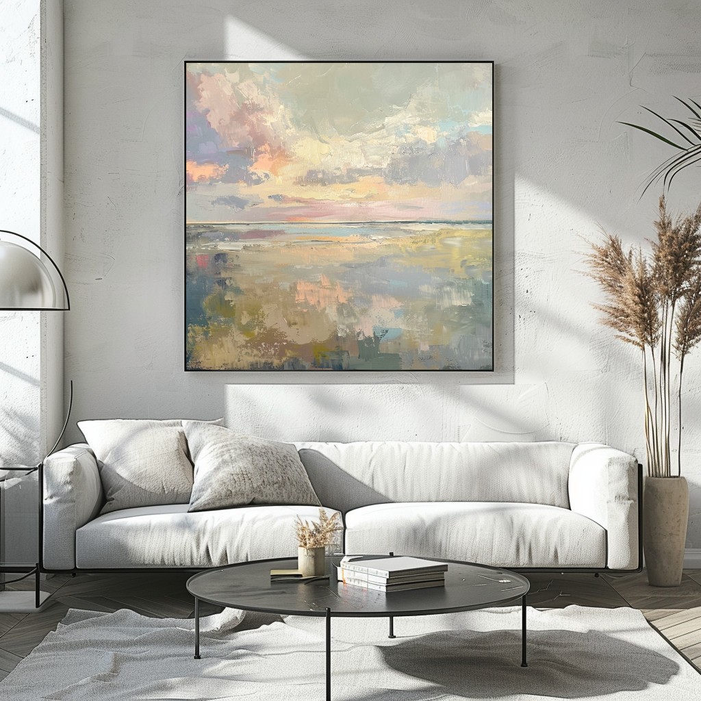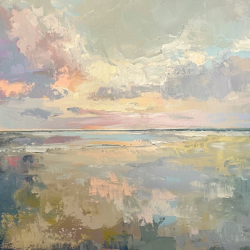 Questo suggestivo dipinto astratto cattura la magia di un tramonto sulla costa con pennellate morbide e una palette di colori sofisticata. Le tonalità pastello di rosa, arancione, lavanda e azzurro si mescolano delicatamente, creando un cielo riflesso nelle acque calme. La texture materica aggiunge profondità e movimento, evocando la serenità di un paesaggio marino immerso nella luce dorata della sera.