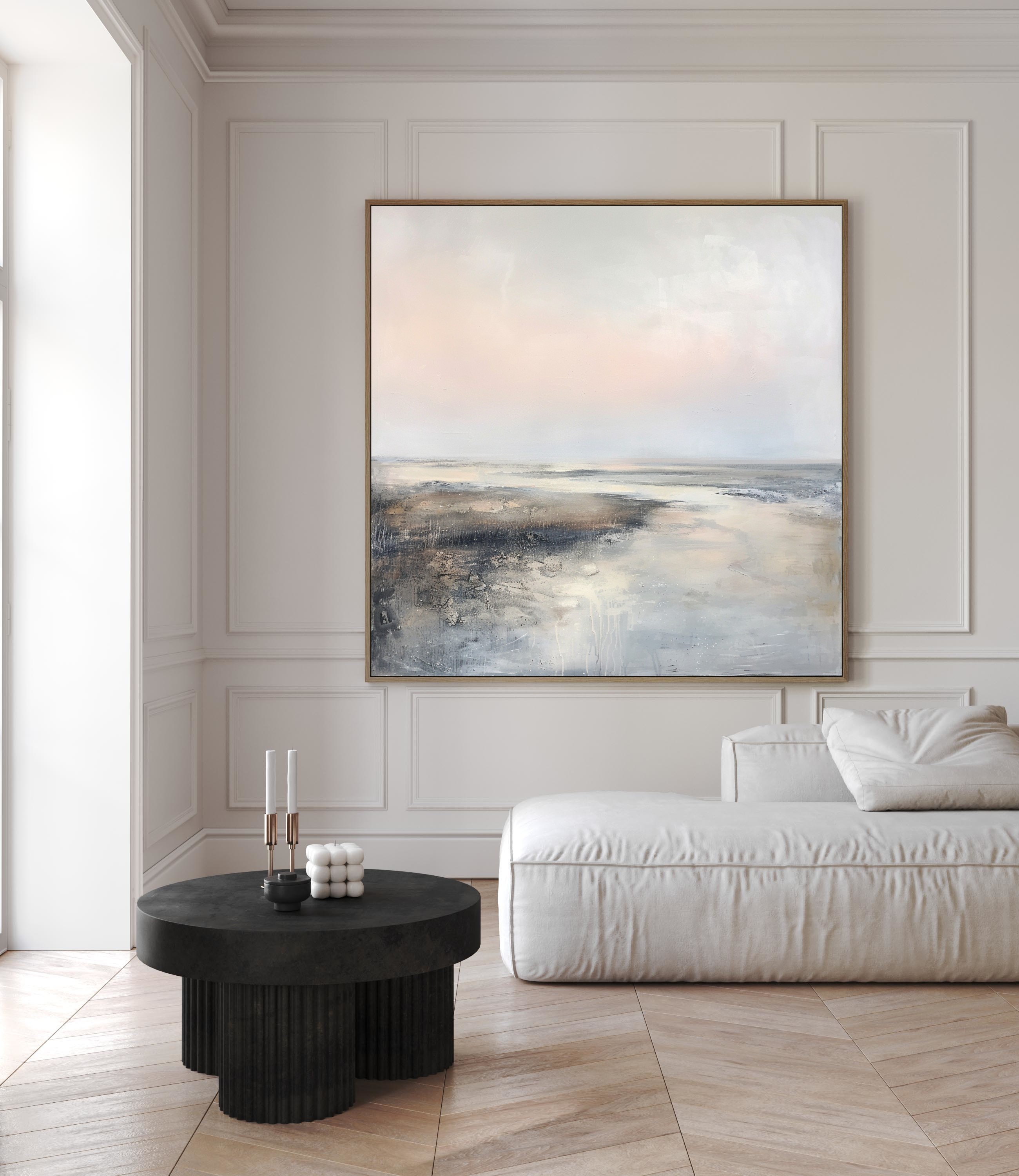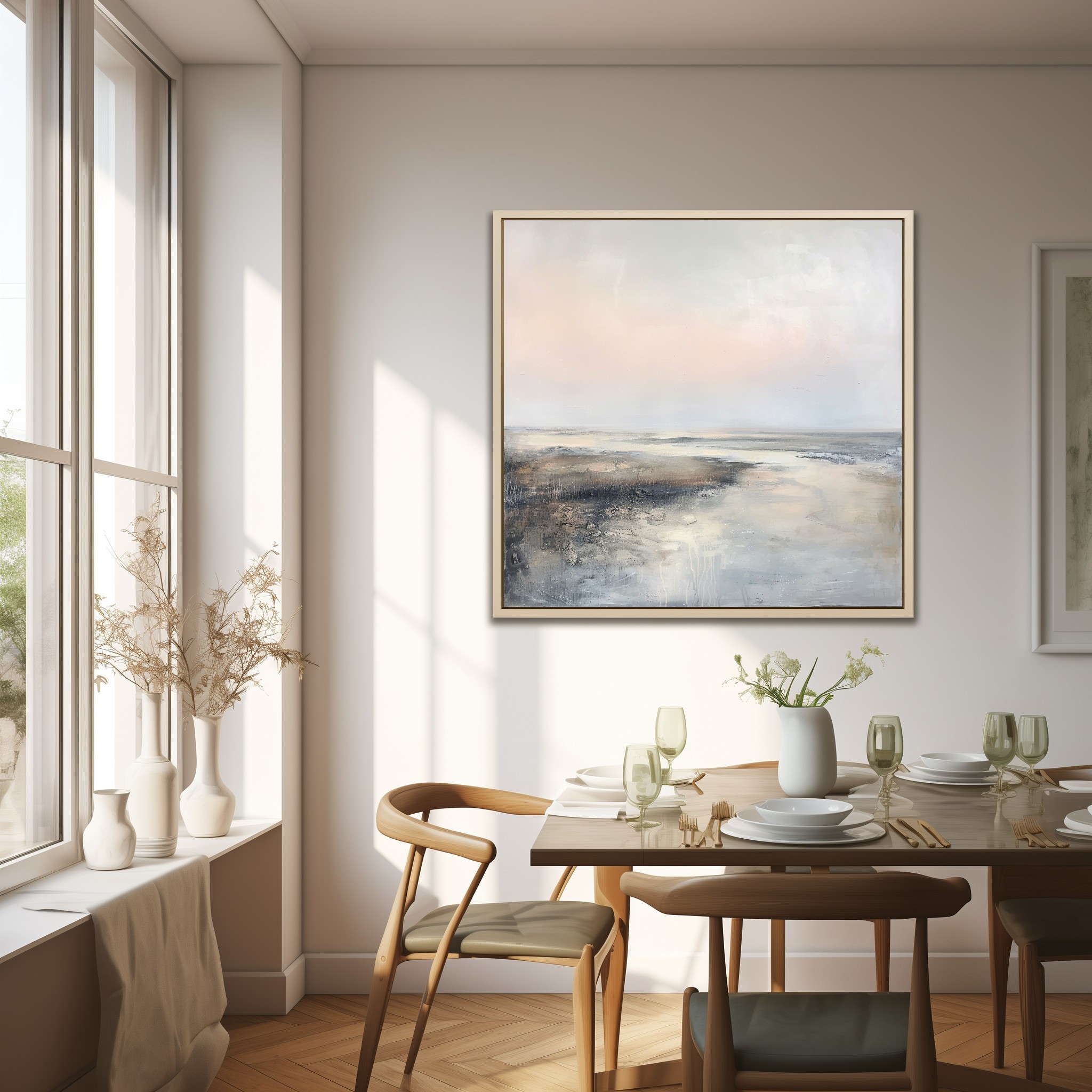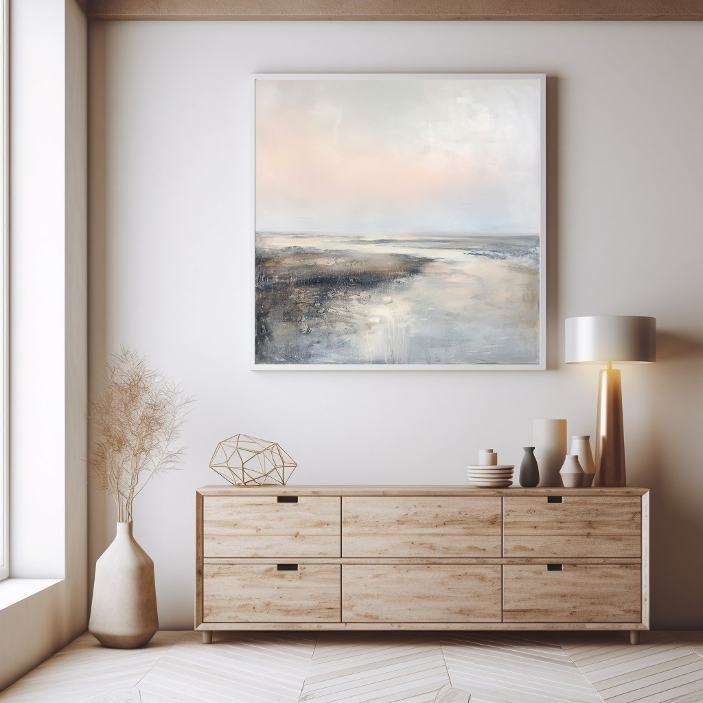 Raffinato quadro astratto moderno, perfetto per chi cerca un tocco di eleganza e serenità negli ambienti domestici. Le delicate sfumature di beige, grigio e rosa pastello evocano un paesaggio marino minimalista, con un gioco di luce morbida che trasmette calma e profondità. Questa opera d’arte si adatta perfettamente a salotti, camere da letto e uffici dal design moderno e scandinavo. Ideale per chi desidera decorazioni murali raffinate e di tendenza.