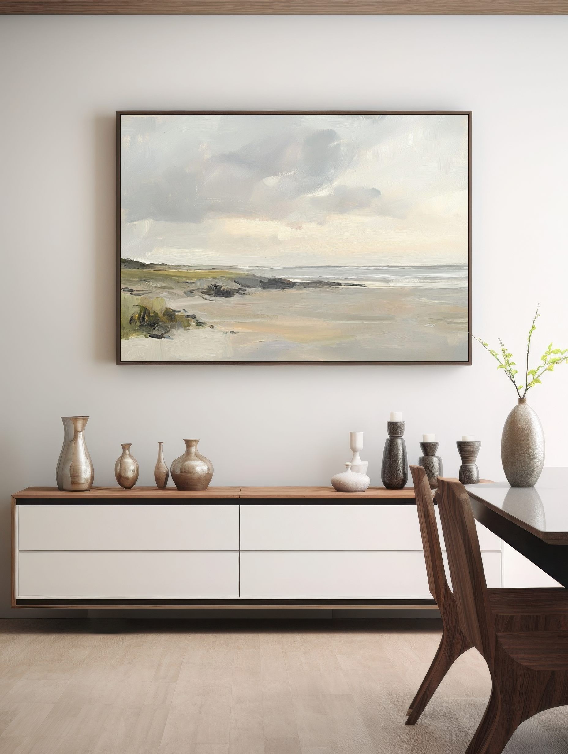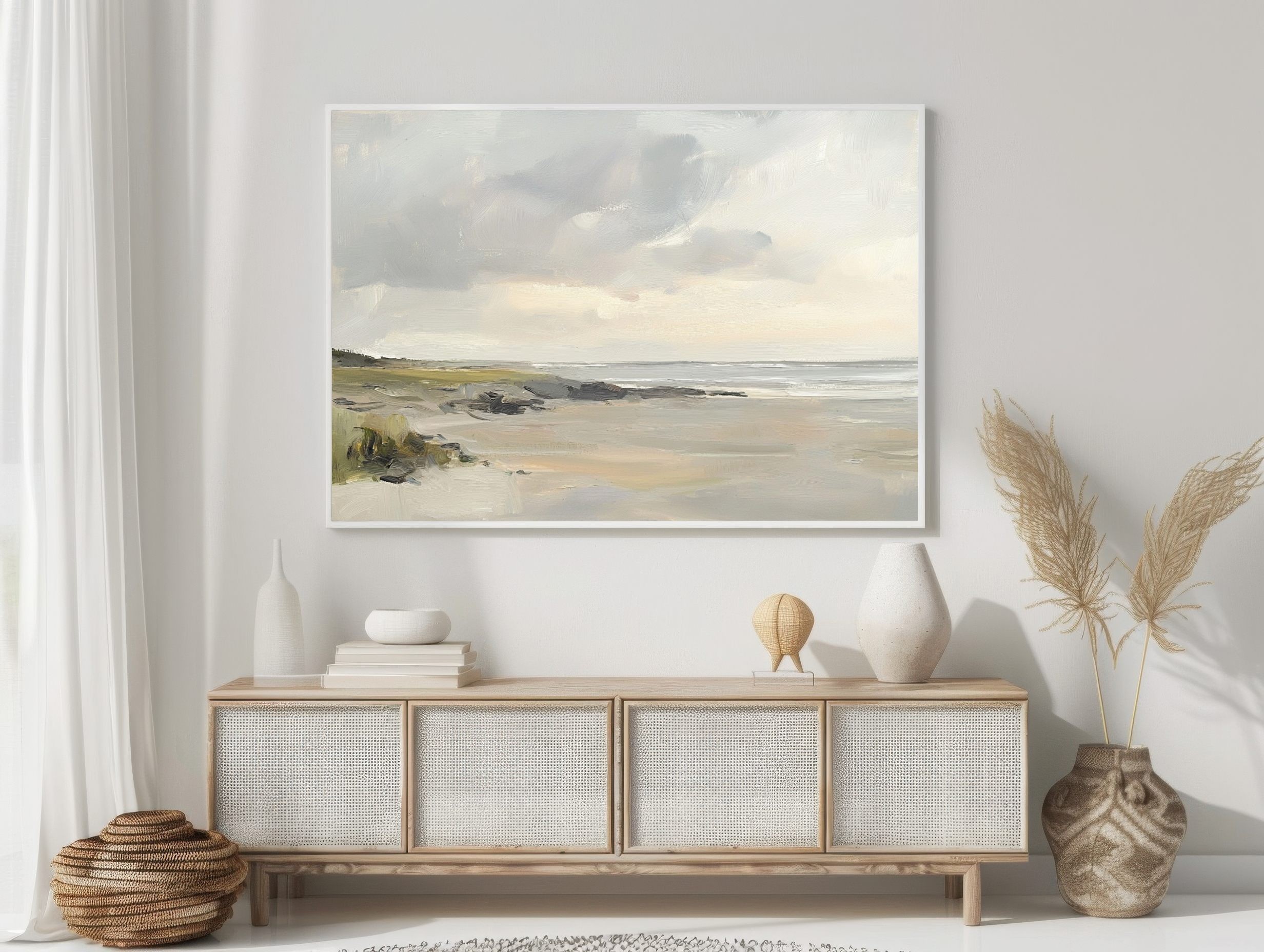 Questo dipinto ad olio di paesaggio costiero si distingue per la sua estetica minimalista e i delicati toni neutri. Il cielo nuvoloso e la spiaggia deserta evocano una profonda sensazione di calma e di spazio. Ideale come arte murale in stile scandinavo, questa opera serena è perfetta per interni moderni che ricercano uno stile rilassato ed elegante. Aggiungi profondità e naturalezza alla tua casa con questa scena di spiaggia dipinta a mano, che riflette una bellezza sottile e una connessione con la natura nella sua forma più pura.