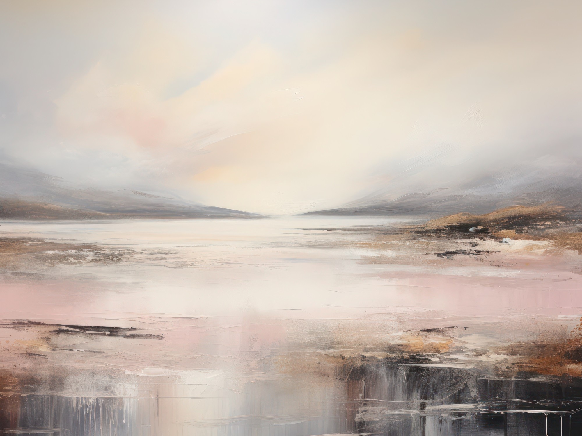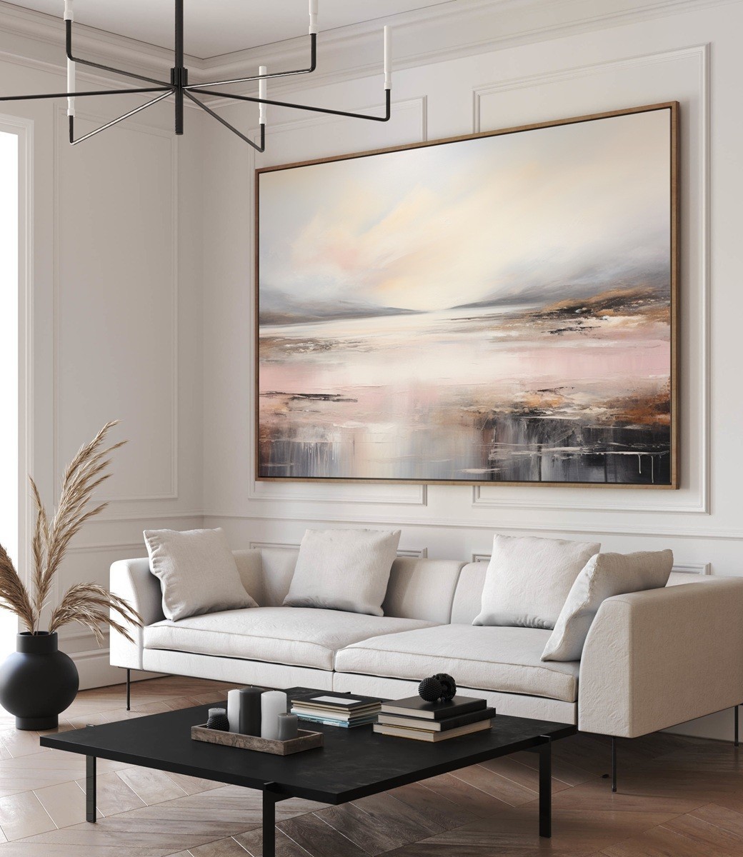 Questo quadro astratto rappresenta una delicata alba rosata che si riflette su un paesaggio silenzioso e avvolgente. Le sfumature di rosa cipria, beige e grigio perla creano un equilibrio perfetto tra calma e luminosità, evocando la serenità del mattino. Realizzato in stile minimal e contemporaneo, si adatta perfettamente a interni Japandi o nordici, aggiungendo eleganza e calore. Ideale per salotti, camere o uffici, questo paesaggio astratto trasmette una sensazione di pace e armonia visiva senza tempo.