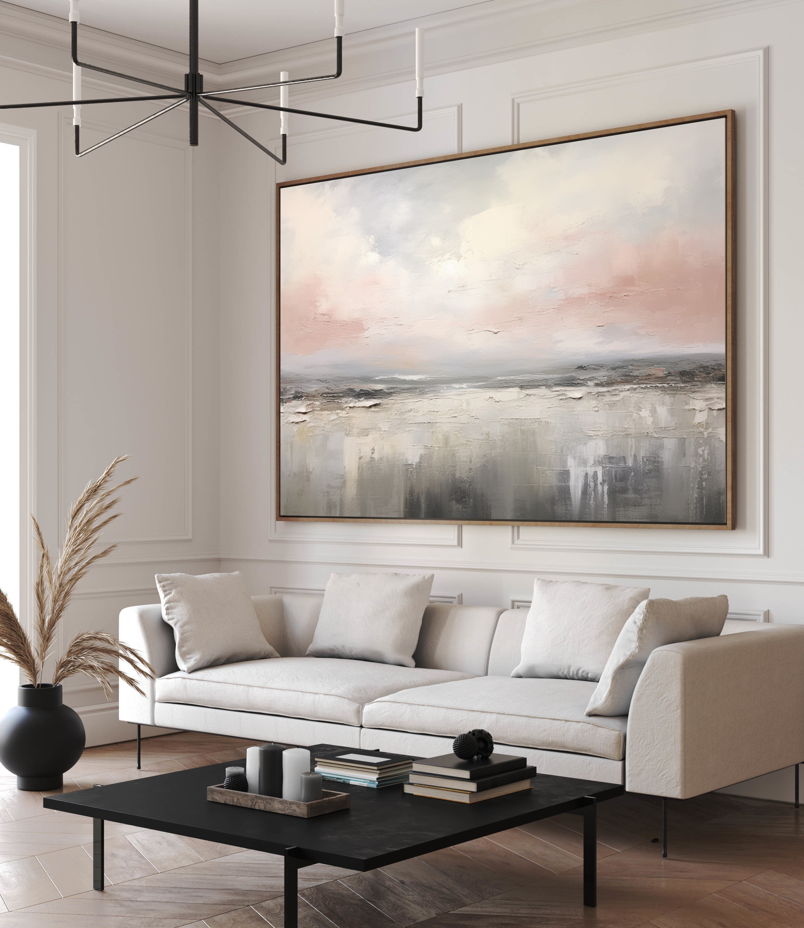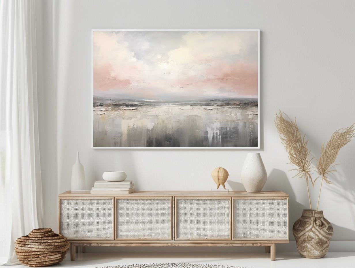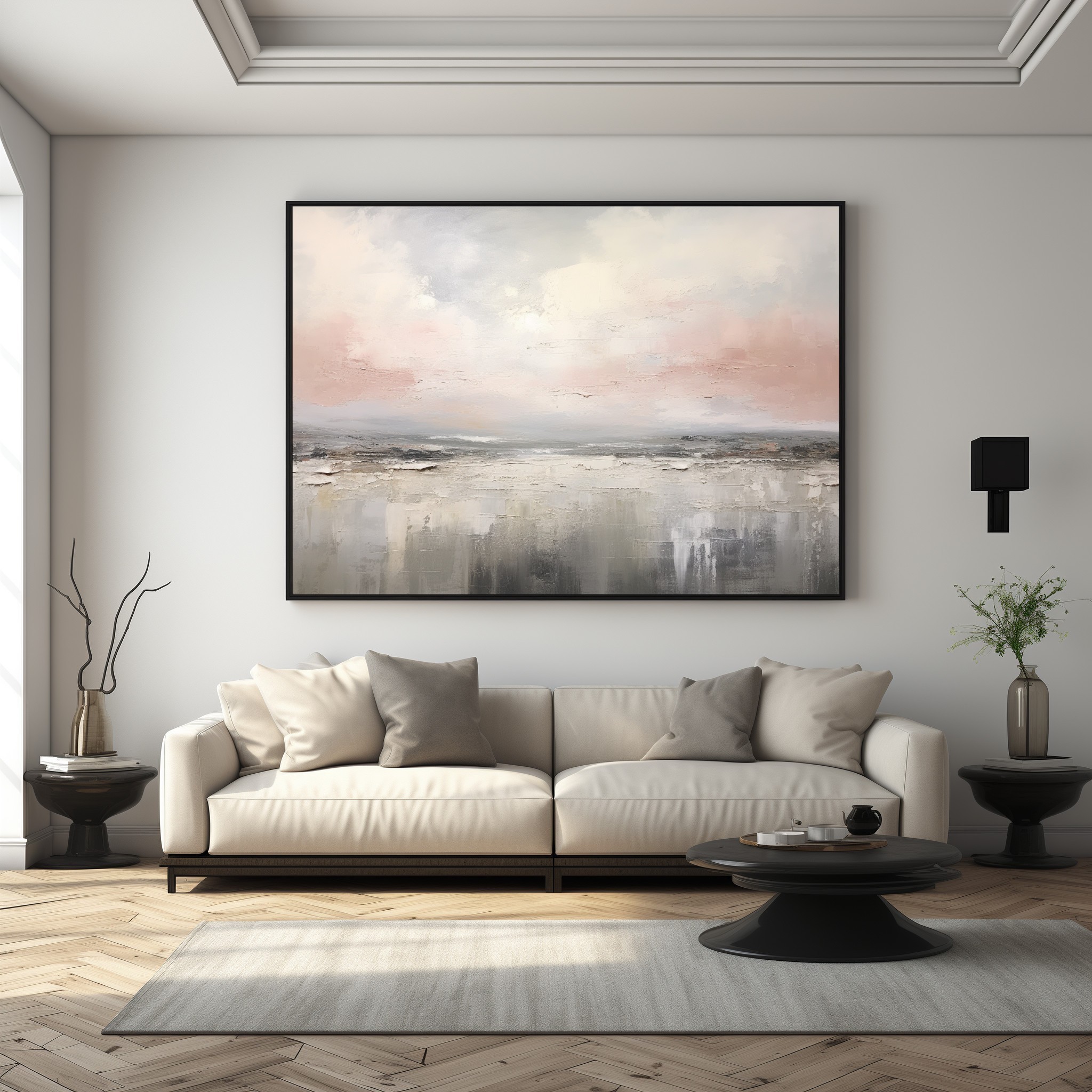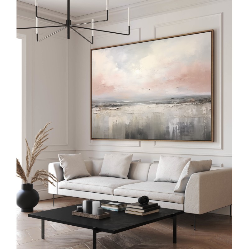 “Horizon” è un quadro astratto moderno che cattura la delicatezza di un paesaggio al tramonto, con sfumature di rosa cipria, grigio perla e bianco caldo. Le texture materiche e la luce diffusa creano un effetto di profondità e calma, ideale per ambienti eleganti e rilassanti. Perfetto per interni minimal, Japandi o contemporanei, questo dipinto trasmette equilibrio e poesia visiva. Un’opera raffinata che unisce arte e serenità, valorizzando soggiorni, camere o spazi di design con un tocco di dolcezza.