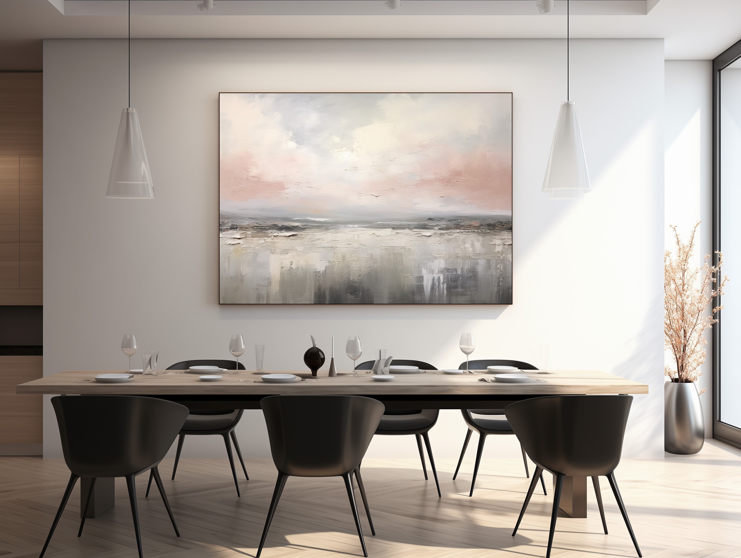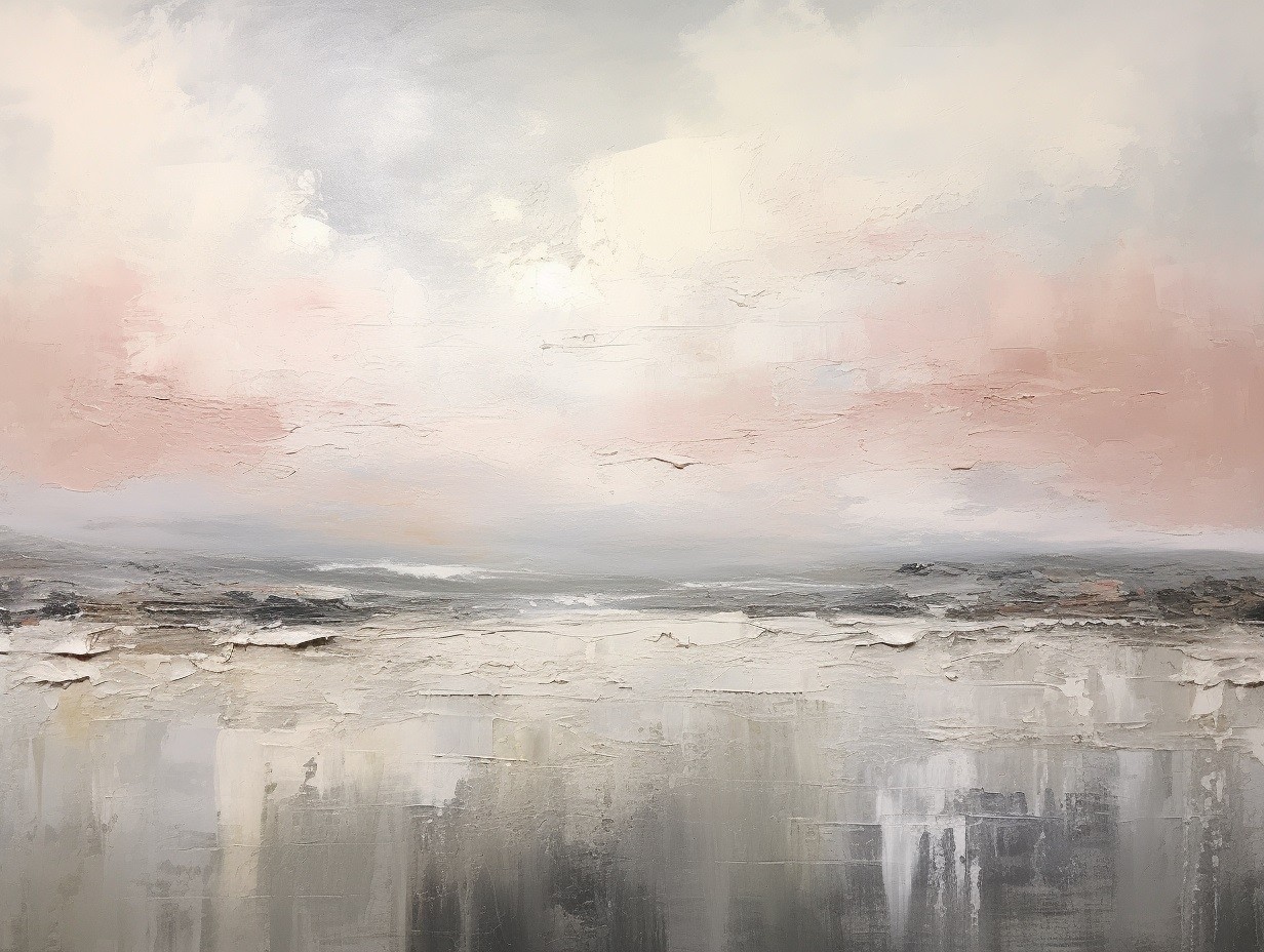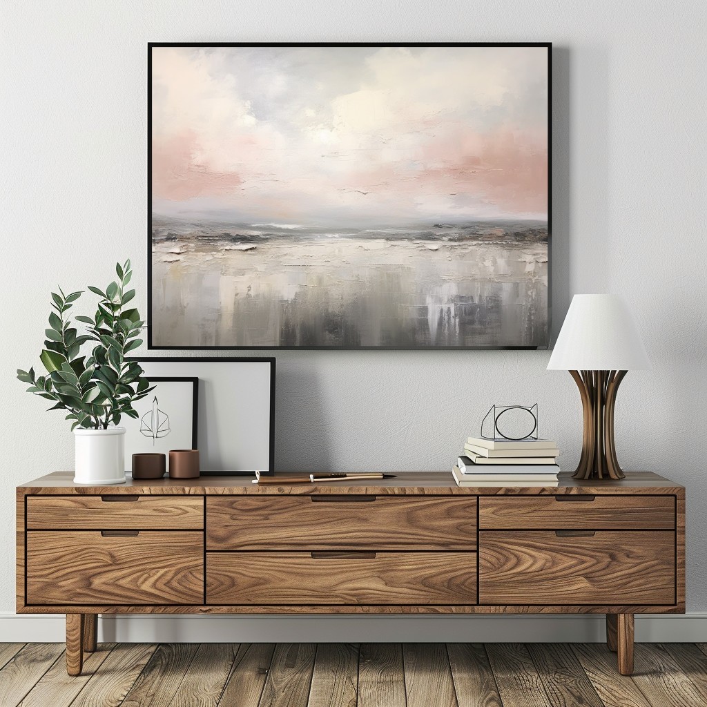 “Horizon” è un quadro astratto moderno che cattura la delicatezza di un paesaggio al tramonto, con sfumature di rosa cipria, grigio perla e bianco caldo. Le texture materiche e la luce diffusa creano un effetto di profondità e calma, ideale per ambienti eleganti e rilassanti. Perfetto per interni minimal, Japandi o contemporanei, questo dipinto trasmette equilibrio e poesia visiva. Un’opera raffinata che unisce arte e serenità, valorizzando soggiorni, camere o spazi di design con un tocco di dolcezza.