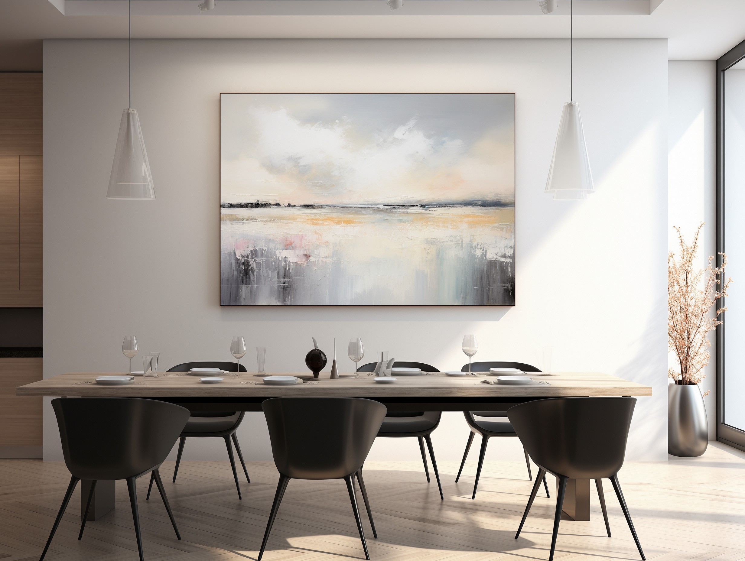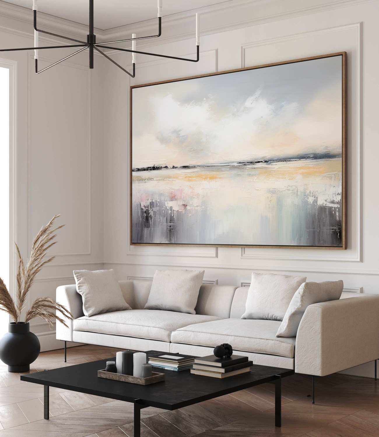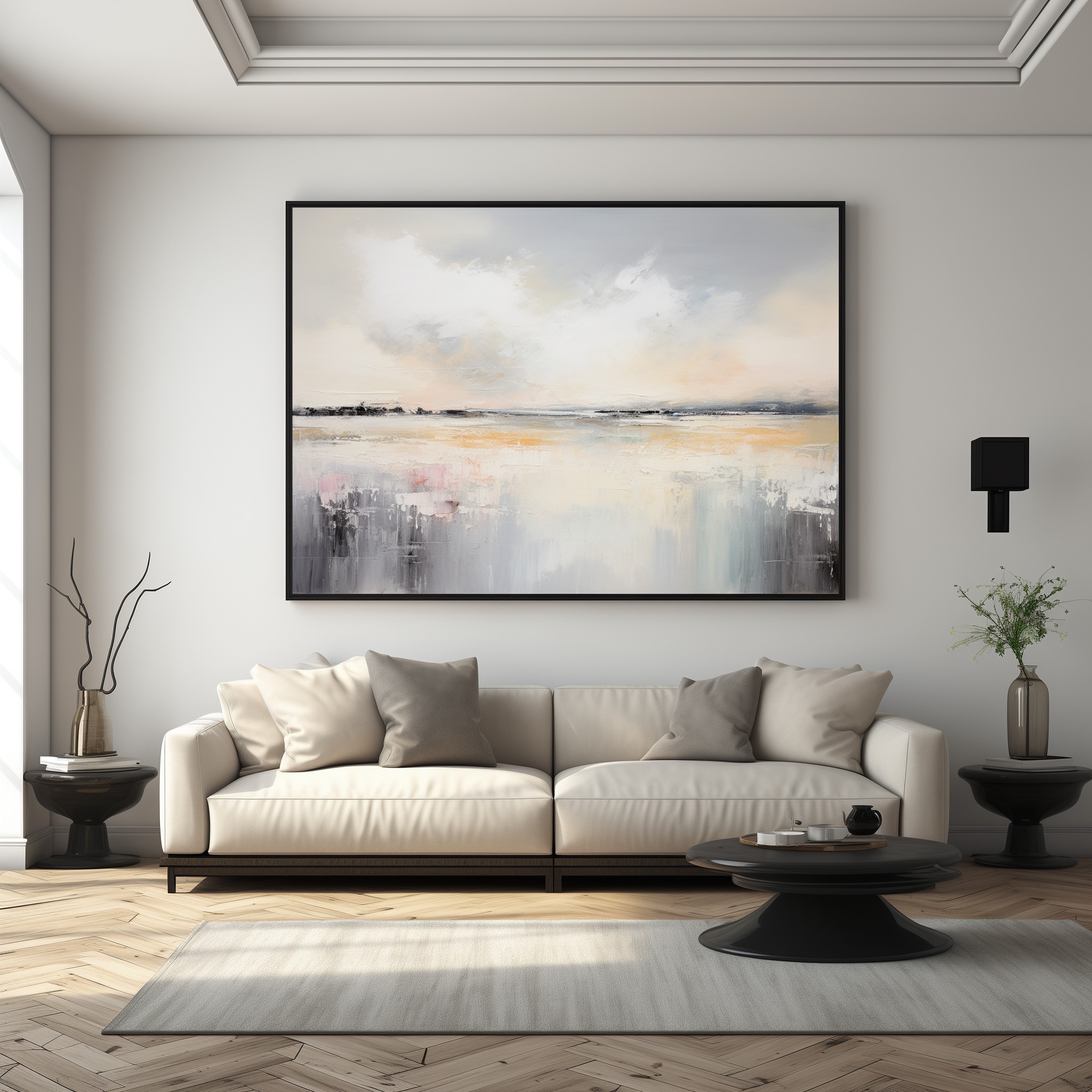 “Maritime Melodies” è un quadro astratto contemporaneo ispirato ai paesaggi costieri e alla luce del mattino. Le sfumature di grigio perla, beige dorato e tocchi rosati creano un’atmosfera delicata e armoniosa, ideale per chi cerca un’opera che trasmetta equilibrio e serenità. Le pennellate materiche e fluide evocano la calma delle acque e il respiro dell’orizzonte. Perfetto per ambienti moderni, minimal o Japandi, aggiunge luminosità e calore raffinato a soggiorni, camere o spazi di design.