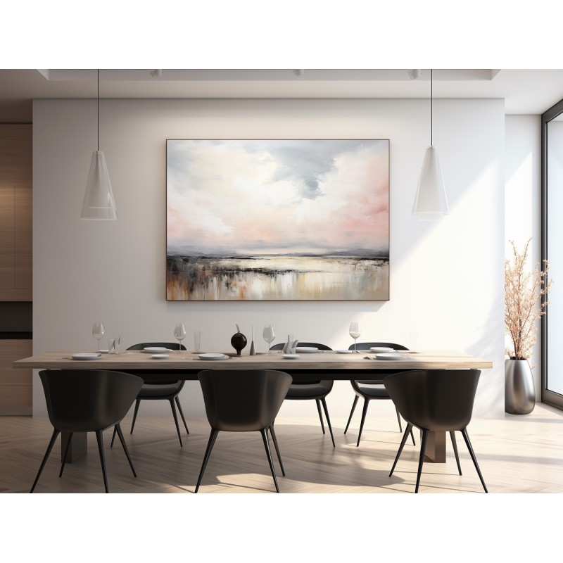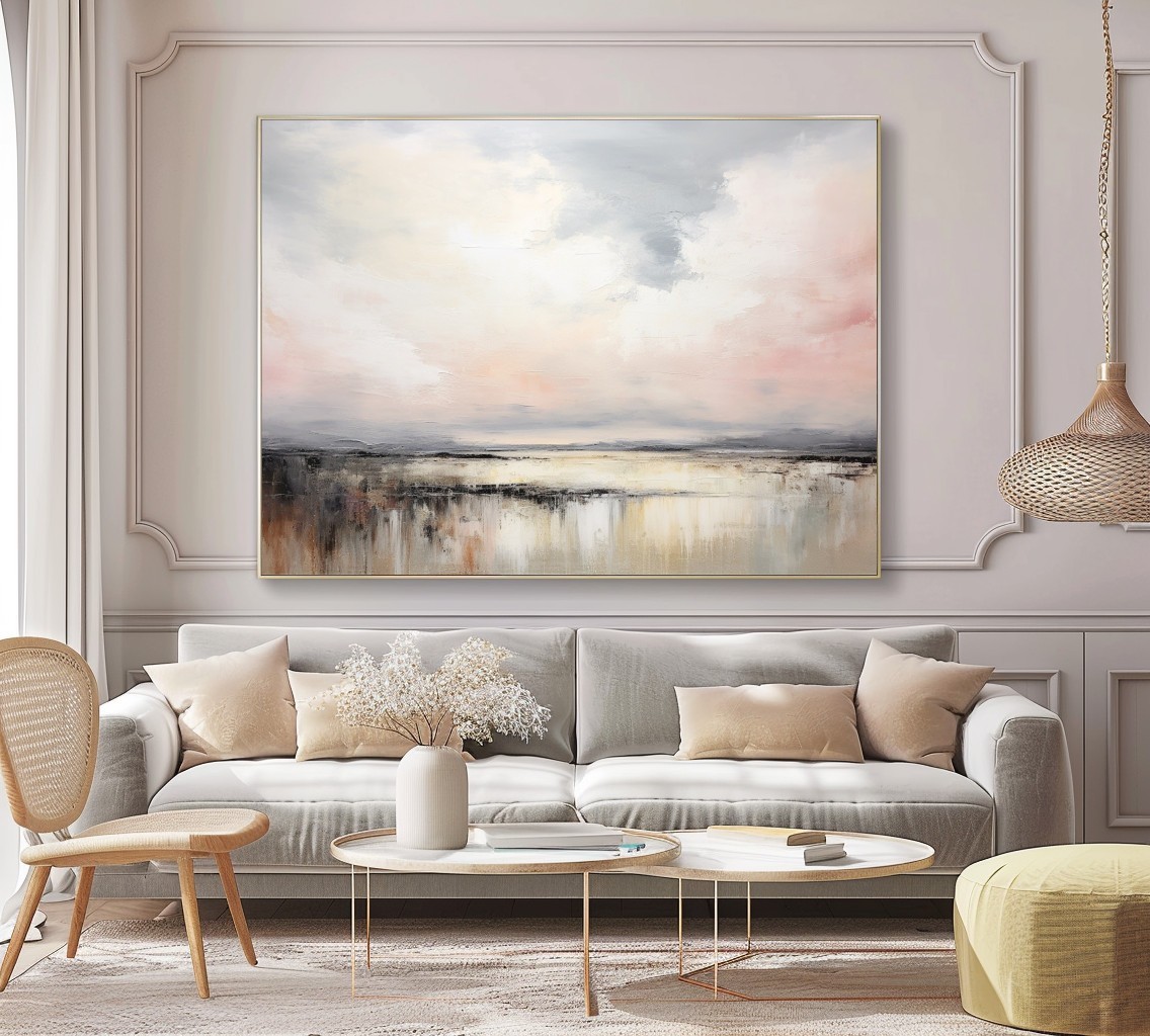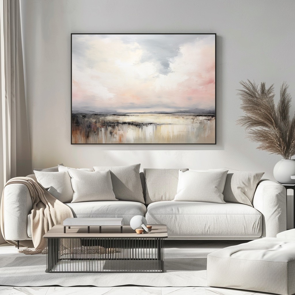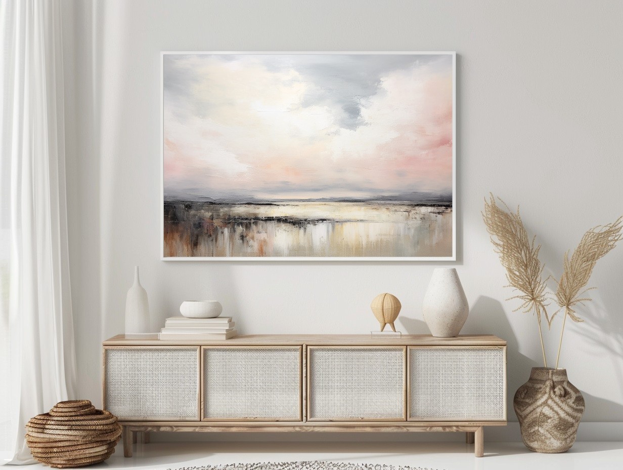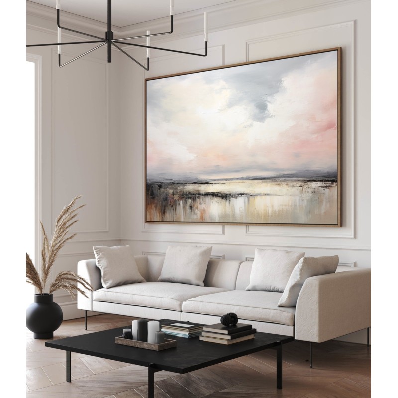 “Coastal Chorus” è un quadro astratto rilassante ispirato alla calma del mare al tramonto. Le sfumature di rosa cipria, crema, grigio perla e beige dorato si fondono in un’armonia visiva che evoca luce, silenzio e serenità. Le pennellate morbide e materiche donano profondità e movimento, rendendolo perfetto per interni moderni, minimal o Japandi. Un’opera elegante e raffinata che aggiunge calore e equilibrio a soggiorni, camere o spazi di meditazione.