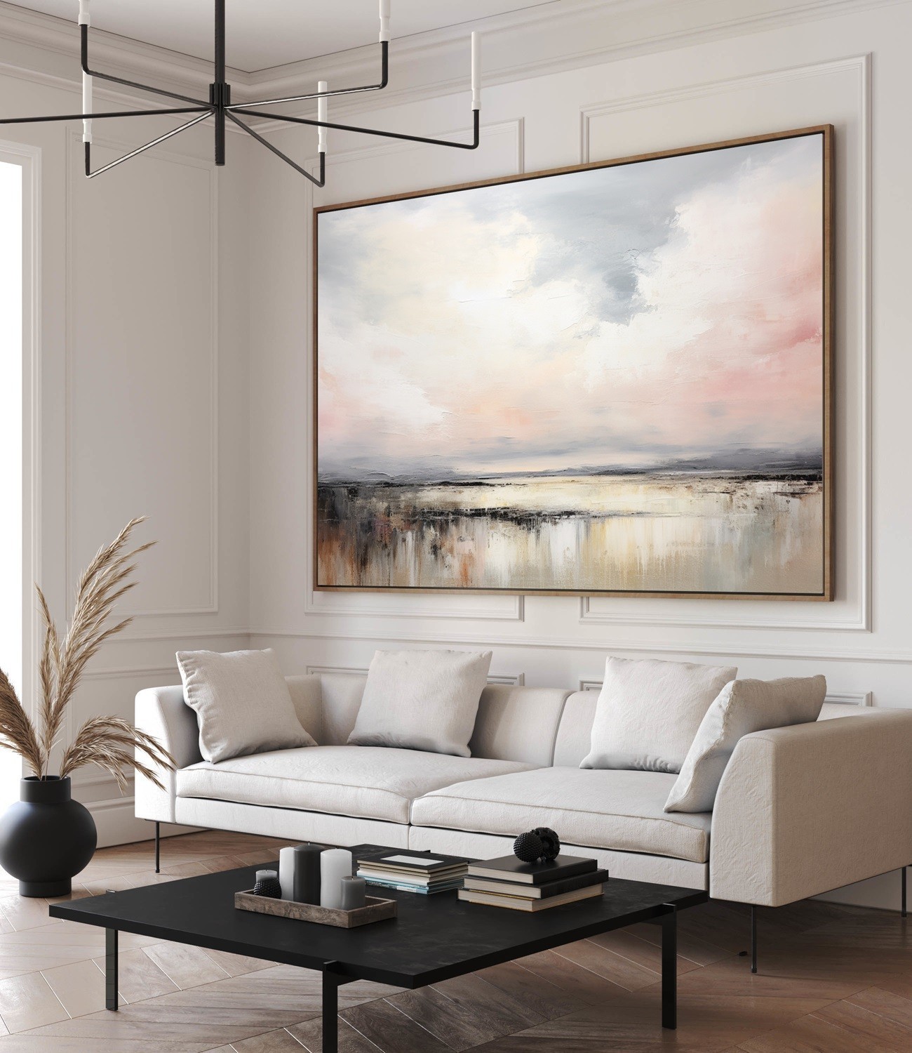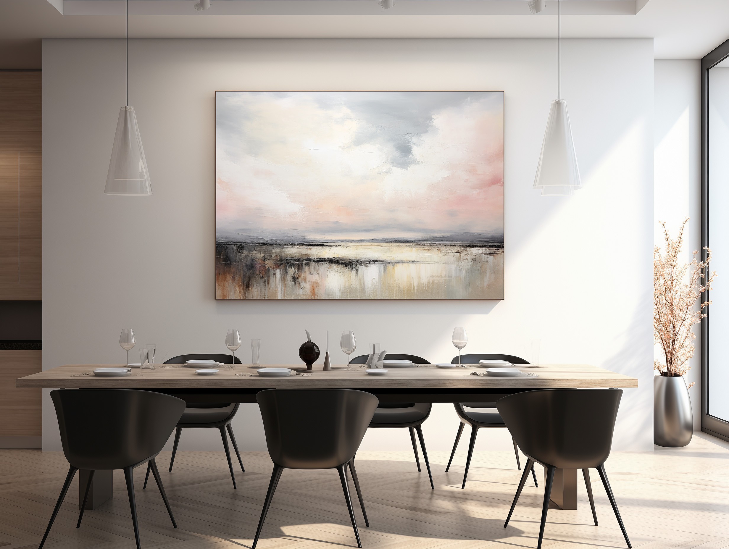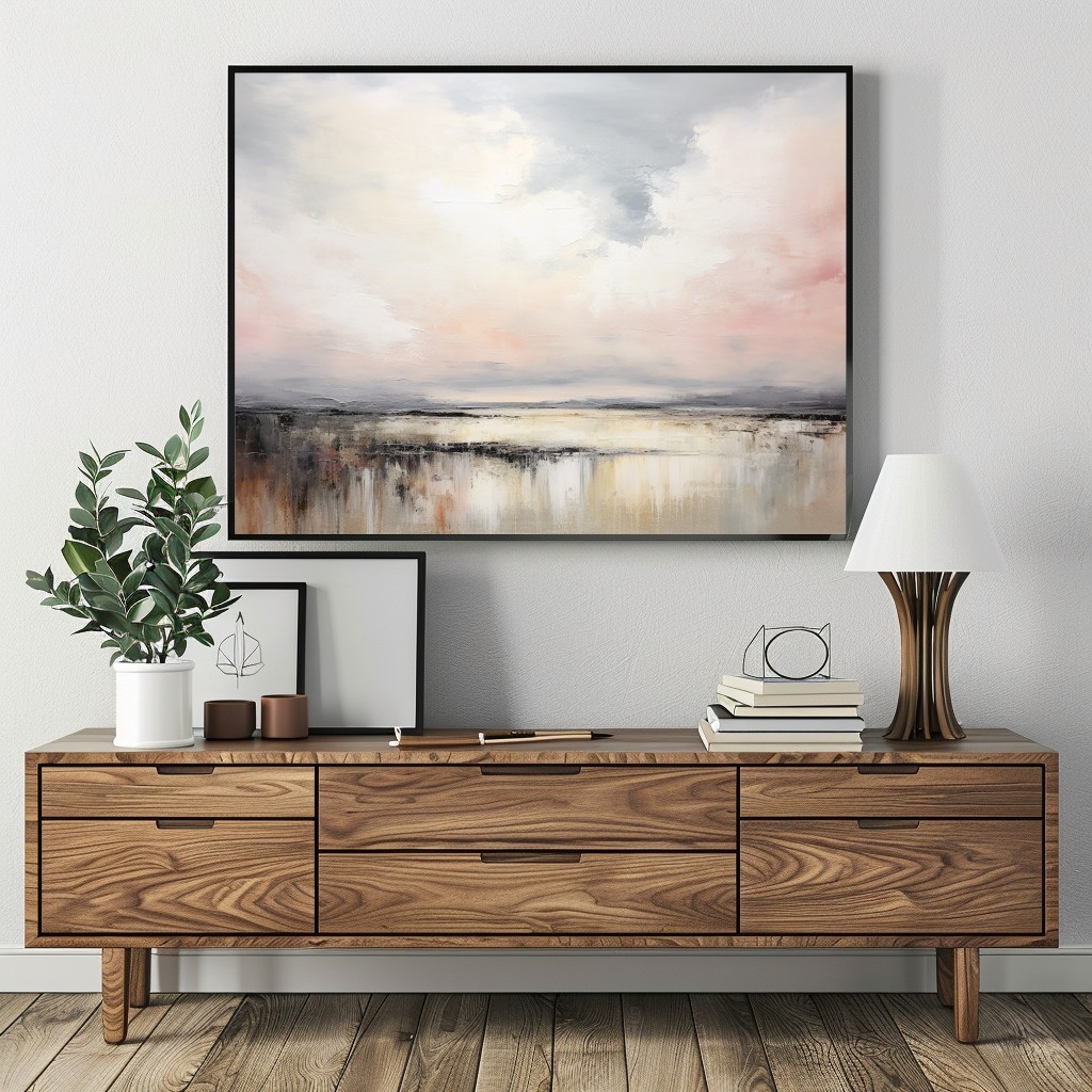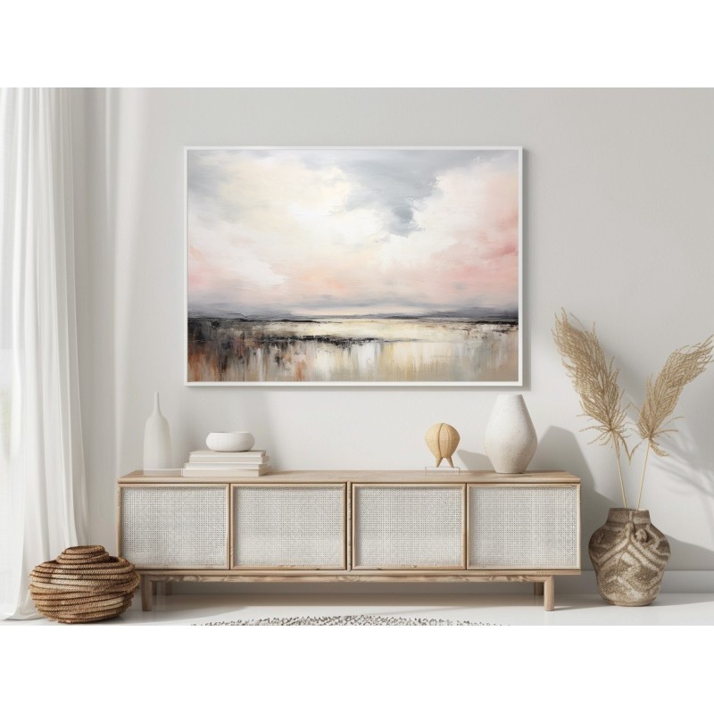 “Coastal Chorus” è un quadro astratto rilassante ispirato alla calma del mare al tramonto. Le sfumature di rosa cipria, crema, grigio perla e beige dorato si fondono in un’armonia visiva che evoca luce, silenzio e serenità. Le pennellate morbide e materiche donano profondità e movimento, rendendolo perfetto per interni moderni, minimal o Japandi. Un’opera elegante e raffinata che aggiunge calore e equilibrio a soggiorni, camere o spazi di meditazione.