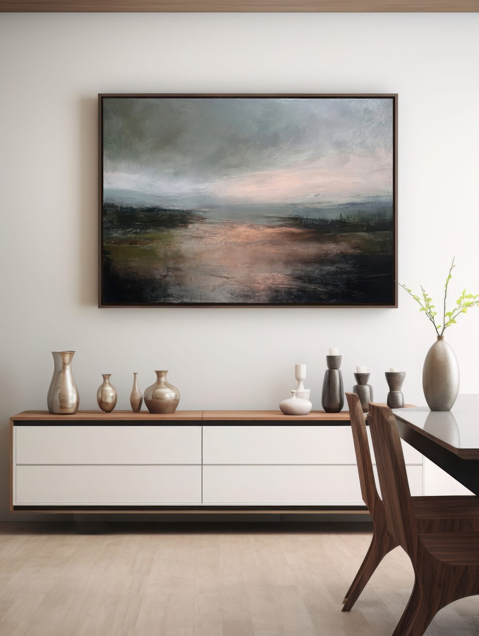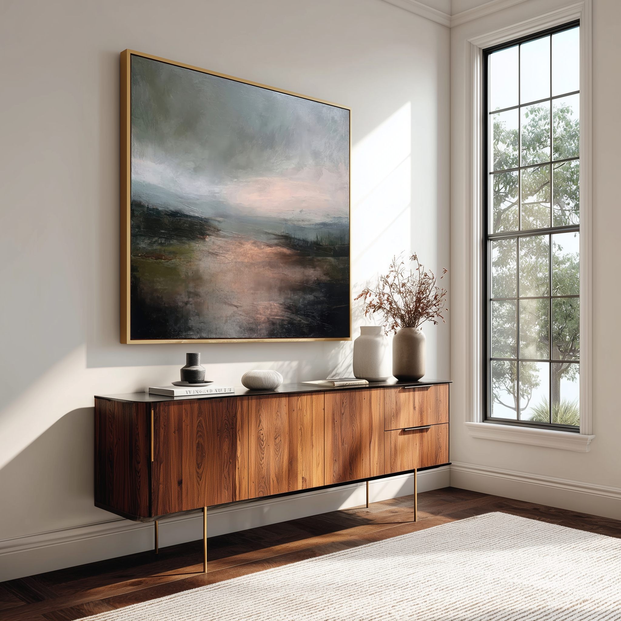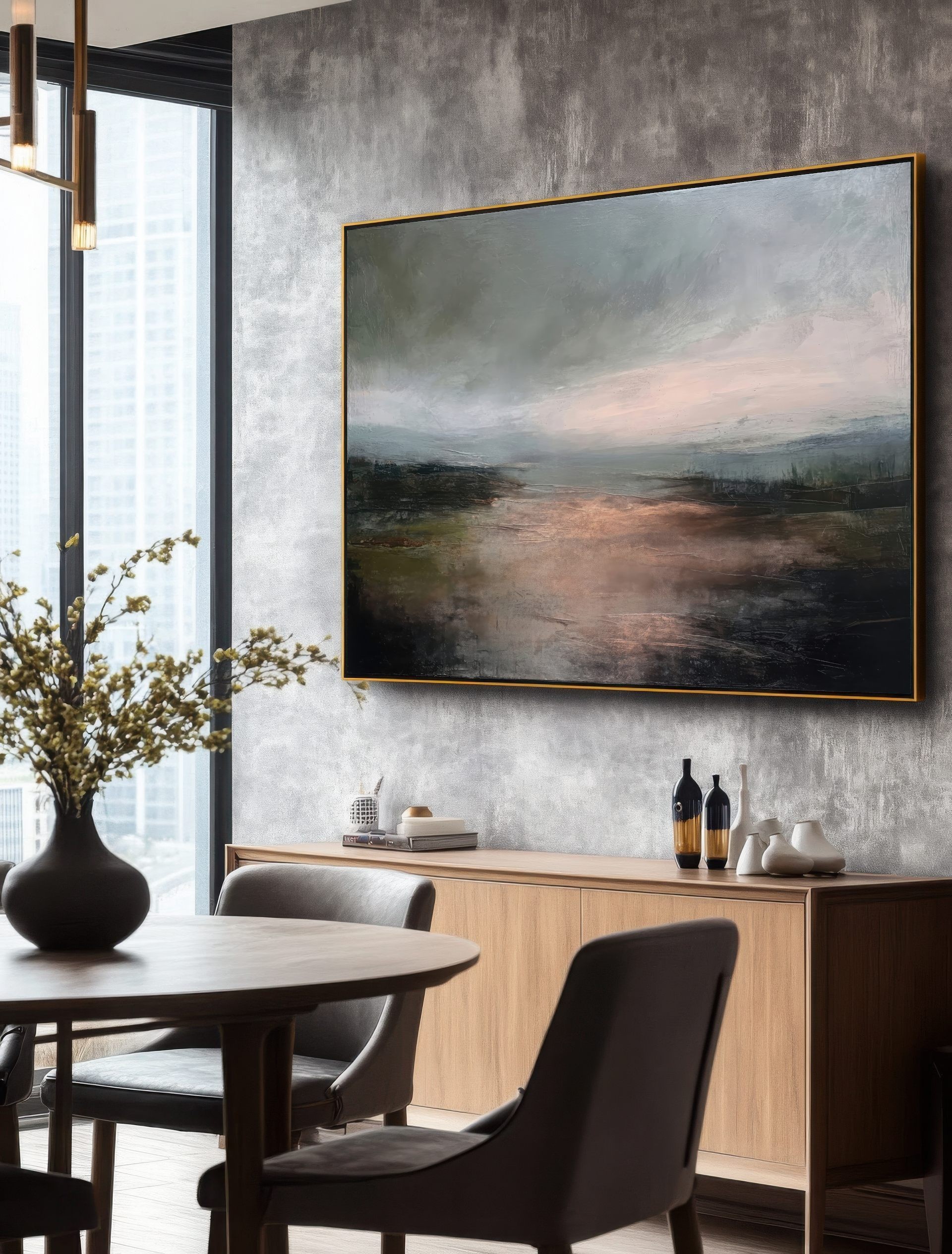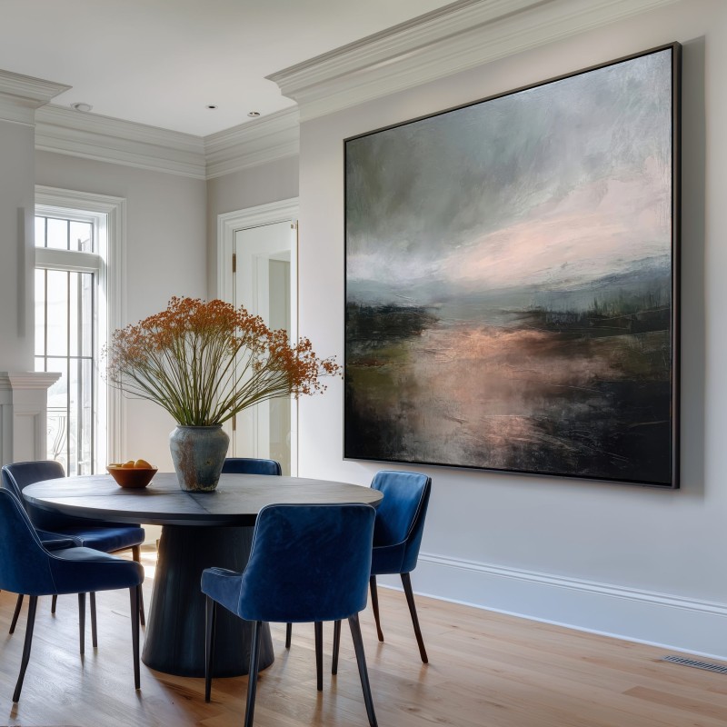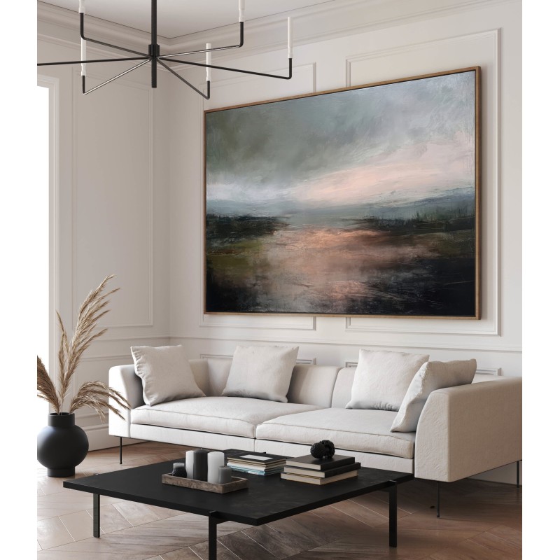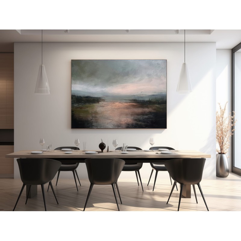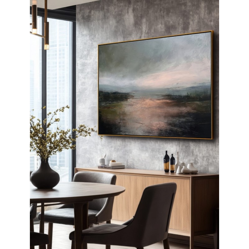 Questo quadro astratto contemporaneo interpreta un paesaggio emozionale dai toni neutri e profondi, dove grigi, verdi scuri e calde sfumature ramate creano un’atmosfera intima e sofisticata. La pittura materica e le transizioni cromatiche delicate donano carattere e movimento, rendendolo ideale per arredamento moderno, stile minimal e interni Japandi. Perfetto come quadro decorativo per soggiorno, camera da letto o studio, valorizza ambienti eleganti, pareti neutre e spazi dal design ricercato.