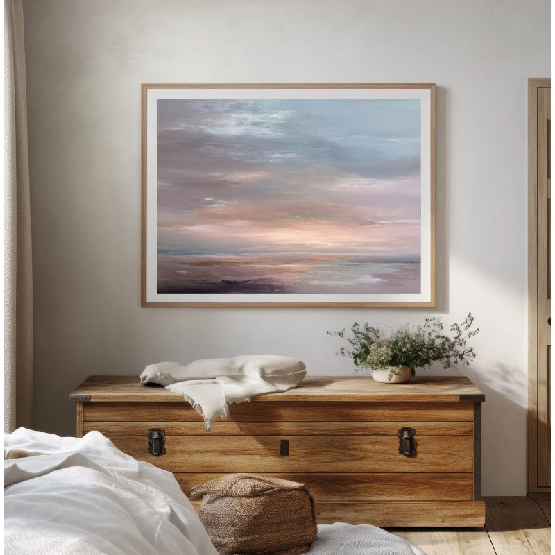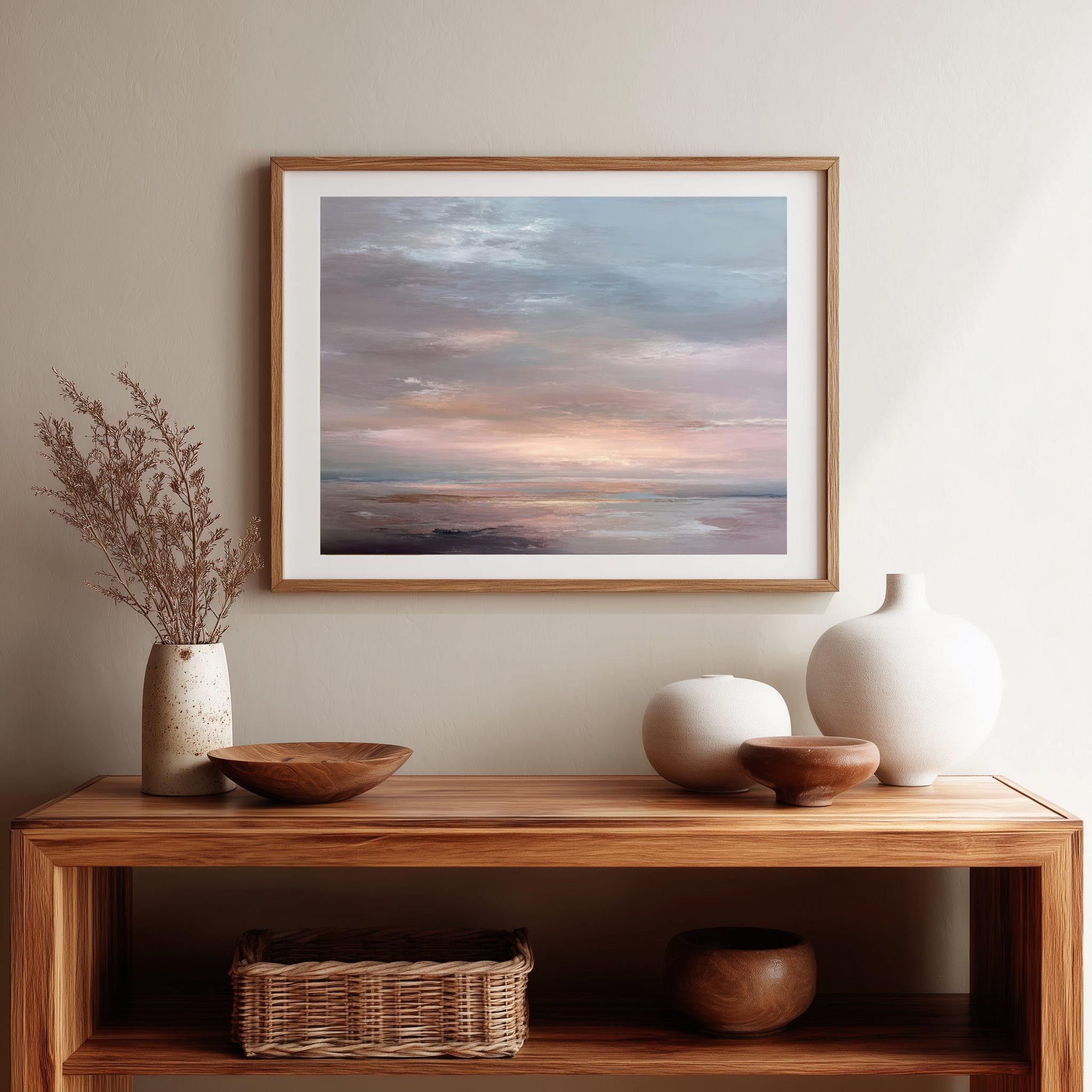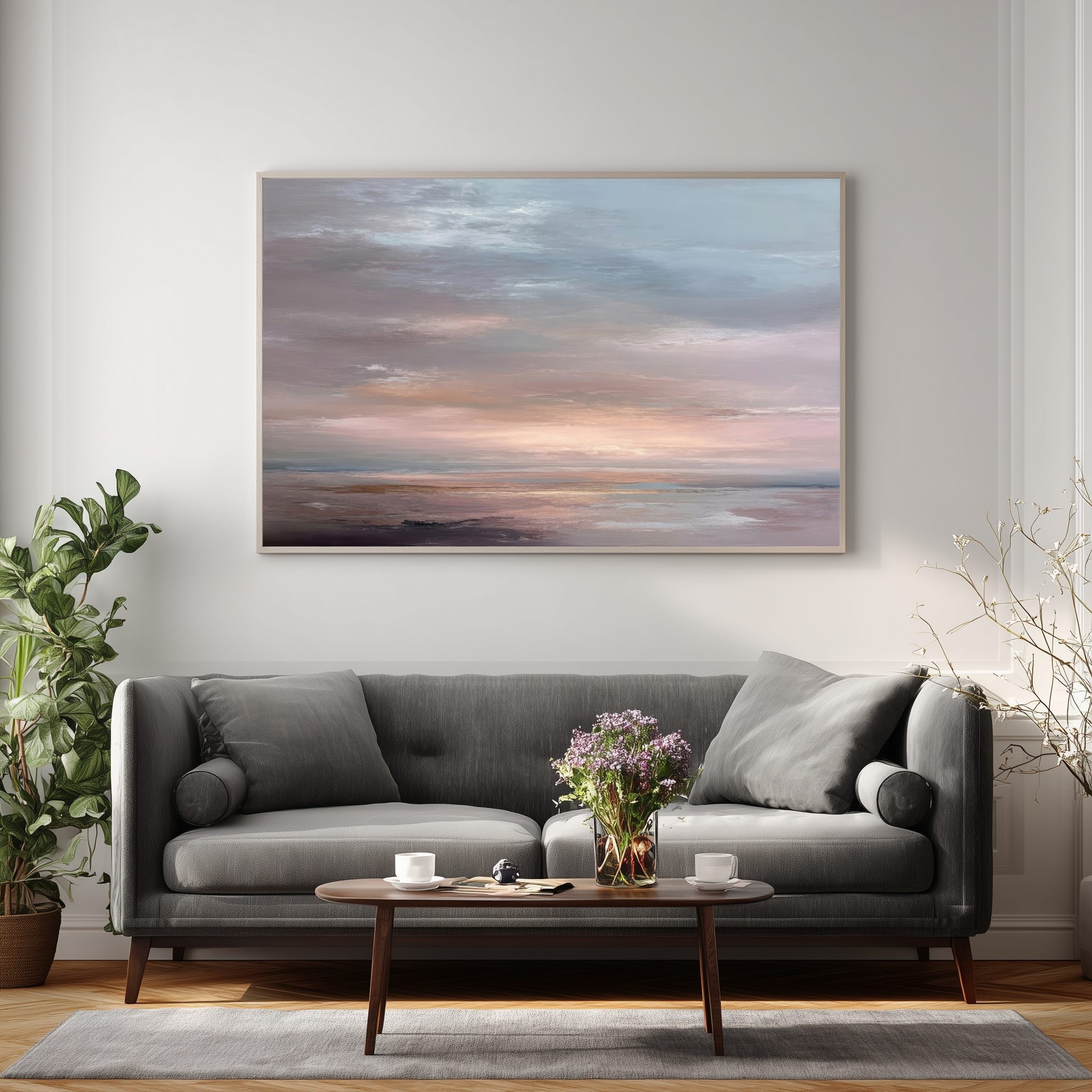 Questo quadro astratto minimalista raffigura un paesaggio etereo caratterizzato da toni pastello delicati e da una luce soffusa che trasmette calma e armonia. Le sfumature di rosa cipria, grigio perla e azzurro creano un’atmosfera rilassante e raffinata, perfetta per arredamento moderno, stile Japandi e interni contemporanei. La composizione orizzontale e la texture pittorica leggera donano profondità visiva senza appesantire l’ambiente. Ideale come quadro decorativo per soggiorno, camera da letto o zona relax, valorizza spazi luminosi e minimal.