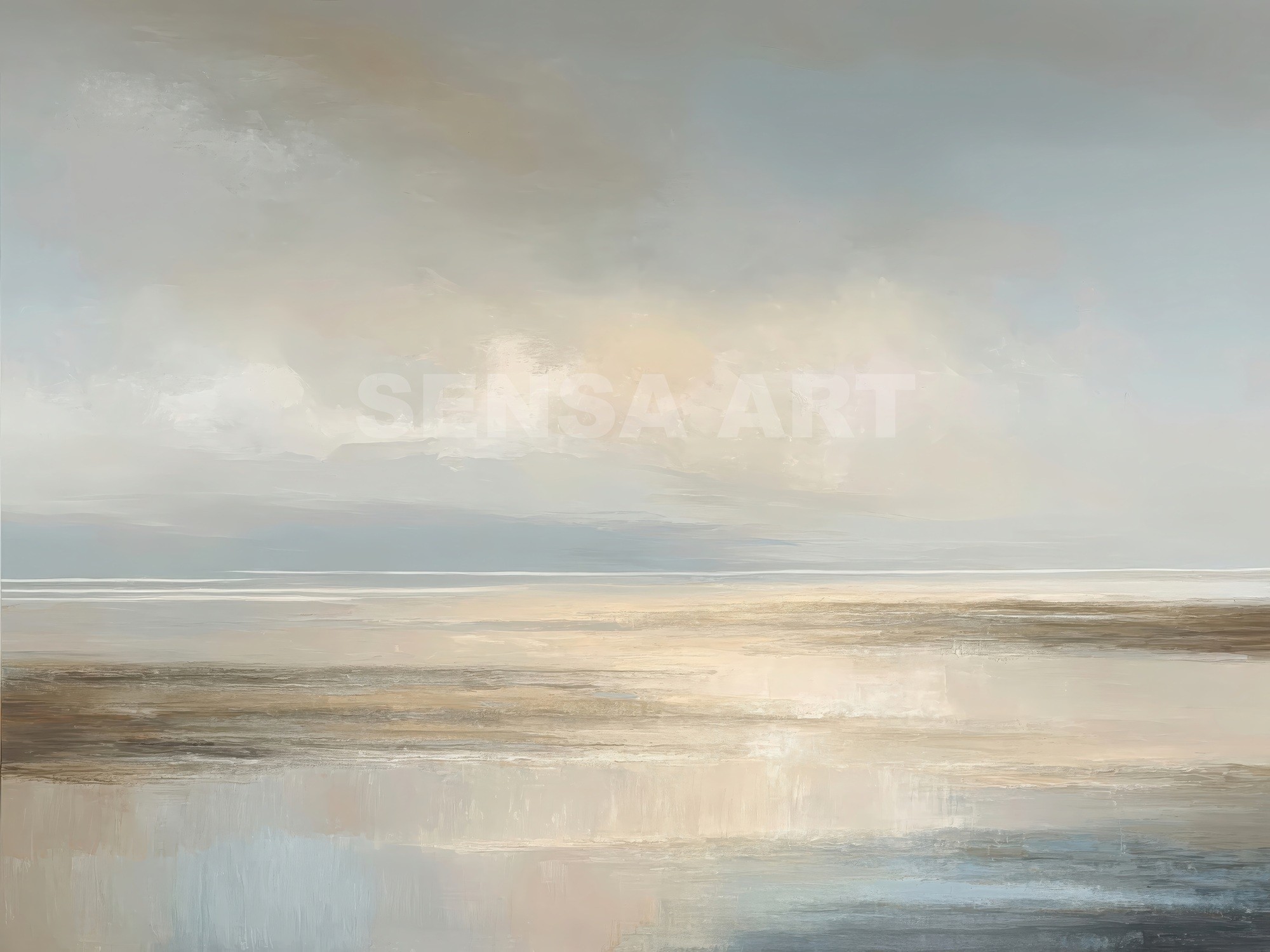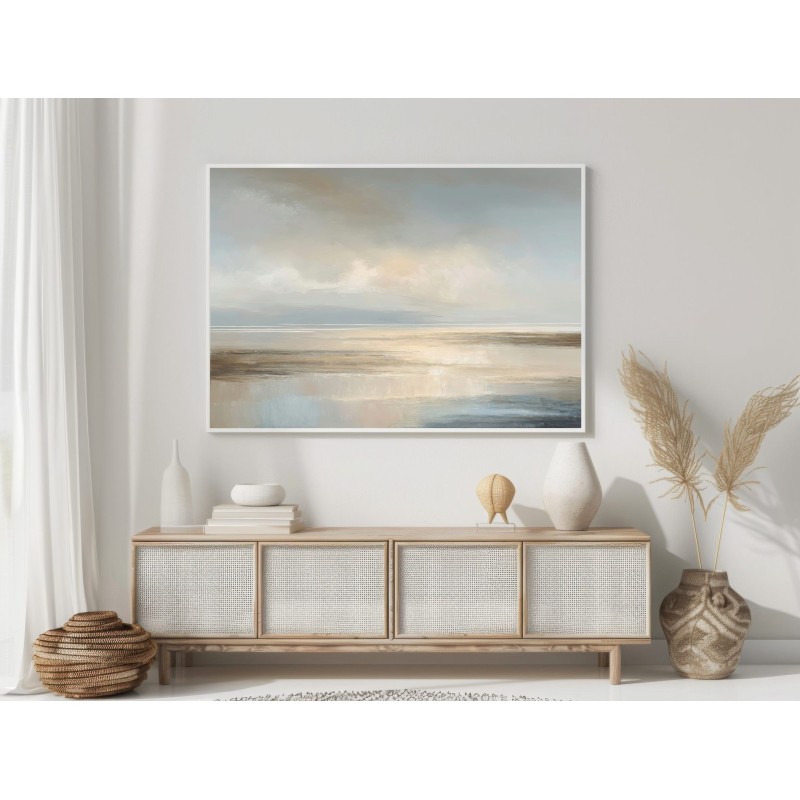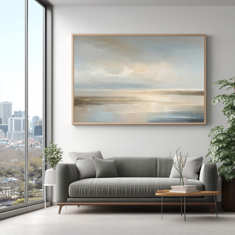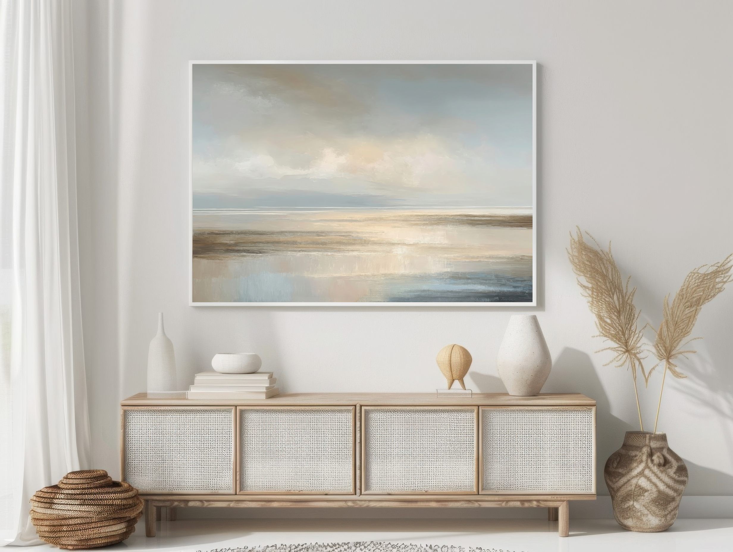Questo quadro astratto minimalista per soggiorno raffigura un paesaggio luminoso e armonioso, caratterizzato da toni neutri e delicate sfumature sabbia, beige e azzurro chiaro. L’atmosfera è calma ed elegante, perfetta per arredamento moderno, stile Japandi e interni contemporanei. La composizione orizzontale amplia visivamente lo spazio e riflette la luce naturale, creando equilibrio e leggerezza. Ideale come quadro decorativo da parete per soggiorno, valorizza ambienti raffinati, open space e zone living dal design essenziale.