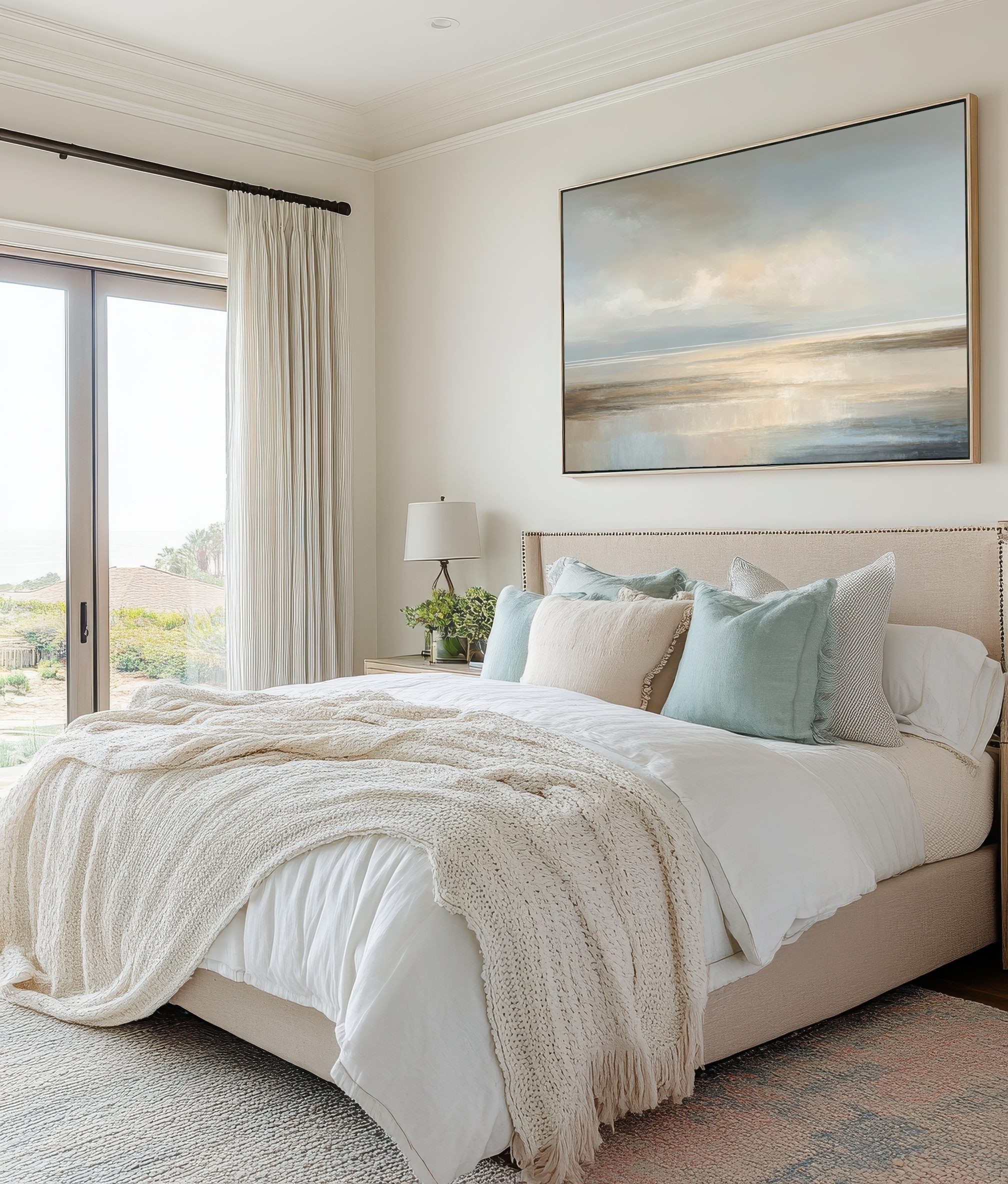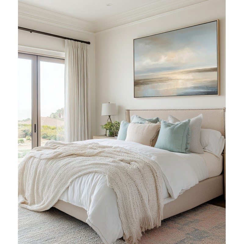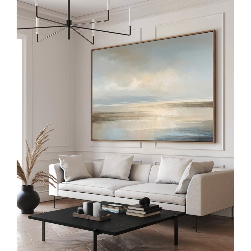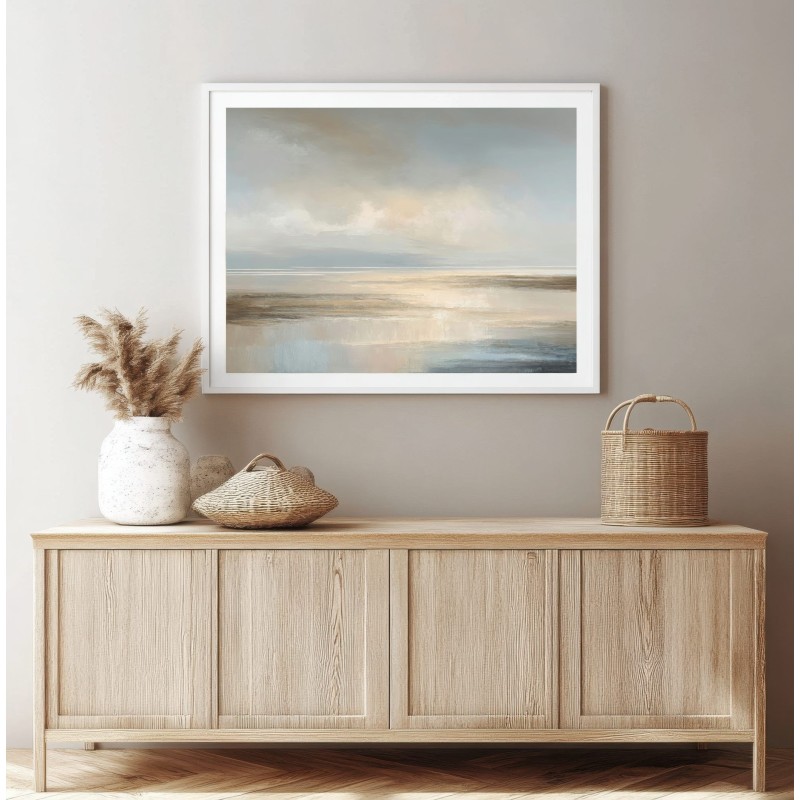 Questo quadro astratto minimalista per soggiorno raffigura un paesaggio luminoso e armonioso, caratterizzato da toni neutri e delicate sfumature sabbia, beige e azzurro chiaro. L’atmosfera è calma ed elegante, perfetta per arredamento moderno, stile Japandi e interni contemporanei. La composizione orizzontale amplia visivamente lo spazio e riflette la luce naturale, creando equilibrio e leggerezza. Ideale come quadro decorativo da parete per soggiorno, valorizza ambienti raffinati, open space e zone living dal design essenziale.
