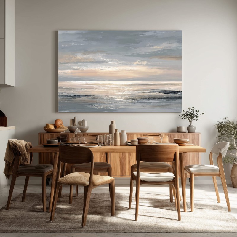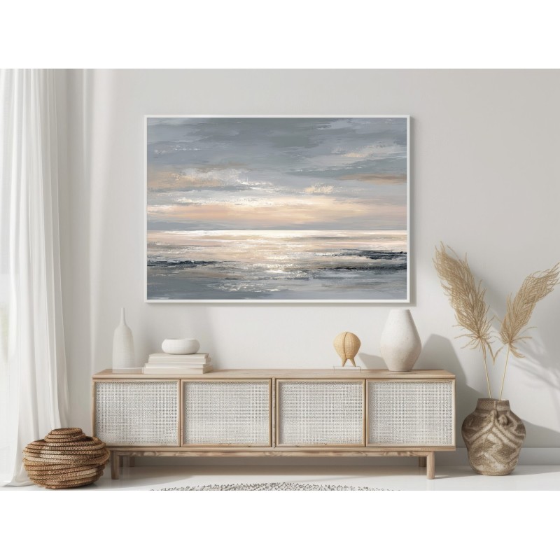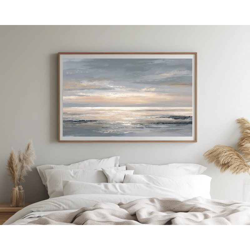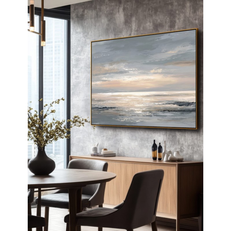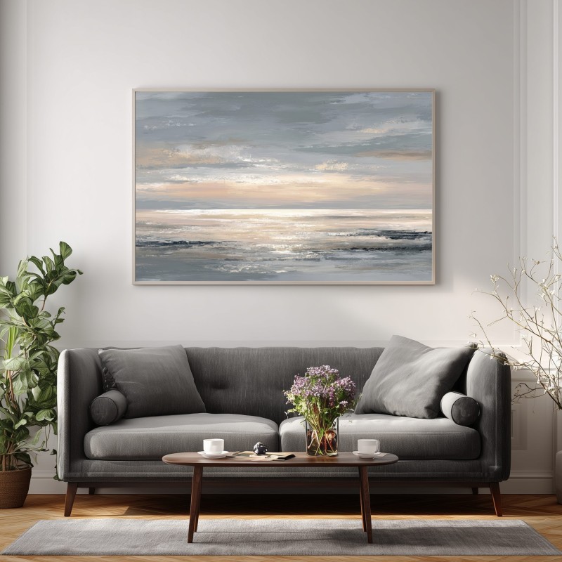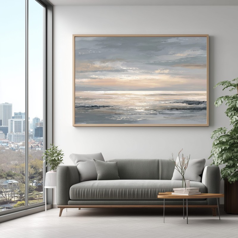 Questo quadro moderno grande raffigura un mare astratto con orizzonte luminoso e toni neutri caldi che spaziano dal beige sabbia al grigio perla, con delicati riflessi dorati. La composizione ampia e orizzontale è studiata per pareti grandi, dove l’opera diventa protagonista senza risultare invadente. Ideale per soggiorni moderni, sale da pranzo spaziose, open space e ambienti dallo stile minimal, Japandi o contemporaneo, questo quadro decorativo di grande formato dona luce, profondità ed equilibrio allo spazio.