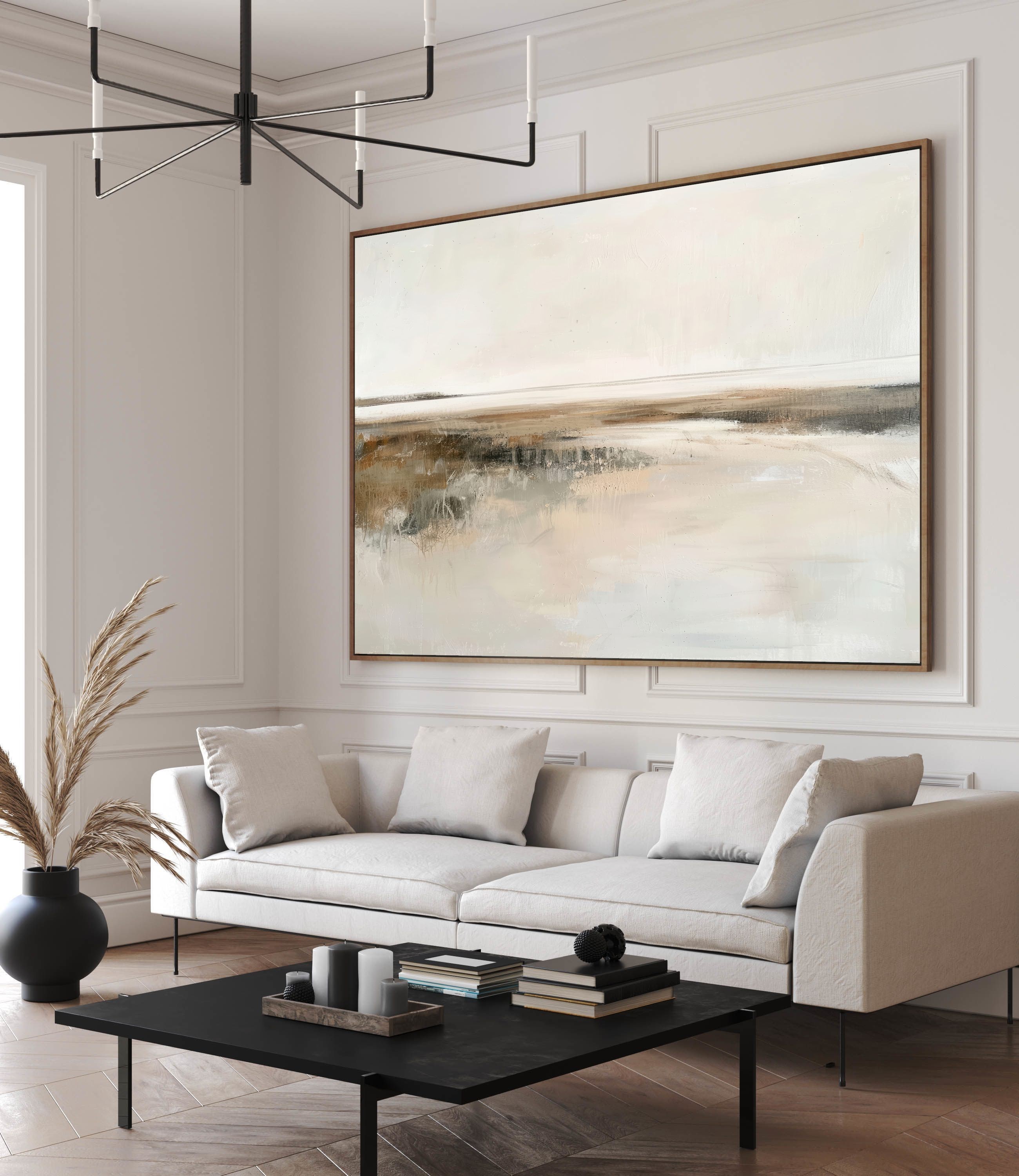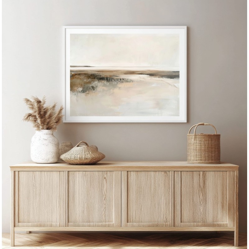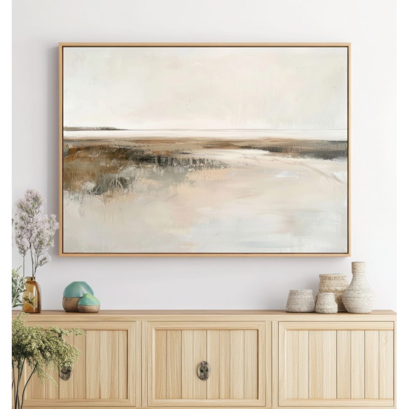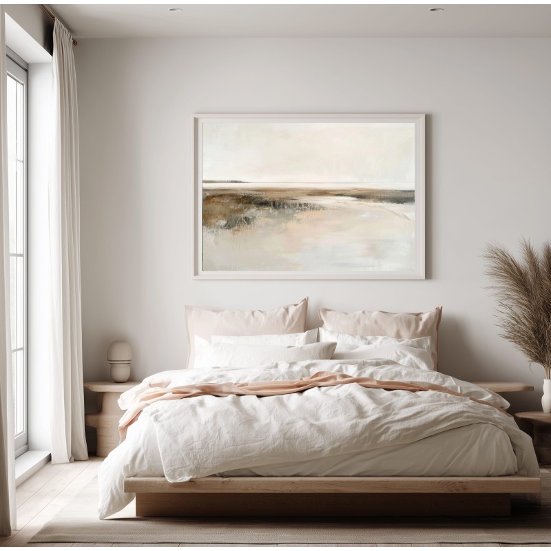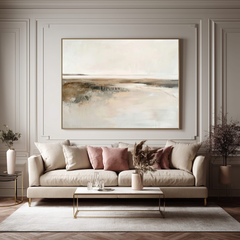 Questo quadro moderno grande interpreta un paesaggio astratto minimalista caratterizzato da un orizzonte delicato e da superfici morbide, quasi eteree. Le sfumature calde di beige, avorio, sabbia e grigio chiaro si fondono in una composizione equilibrata e luminosa, arricchita da leggere texture materiche che donano profondità senza appesantire l’insieme. Ideale per pareti ampie, questo quadro astratto contemporaneo è perfetto per soggiorni moderni, camere da letto raffinate, studi professionali e ambienti arredati in stile Japandi, minimal, wabi-sabi o moderno elegante, creando un’atmosfera rilassante e sofisticata.