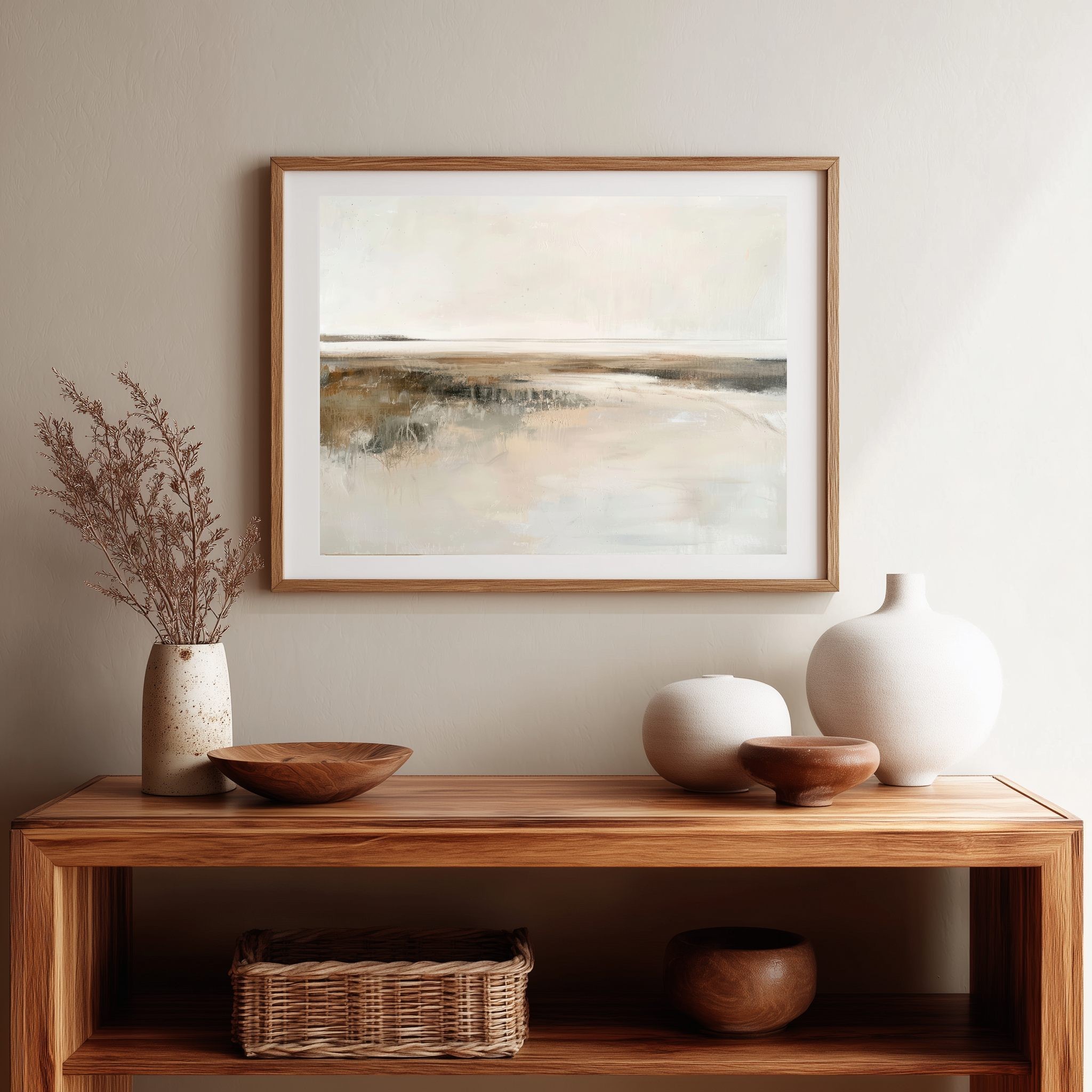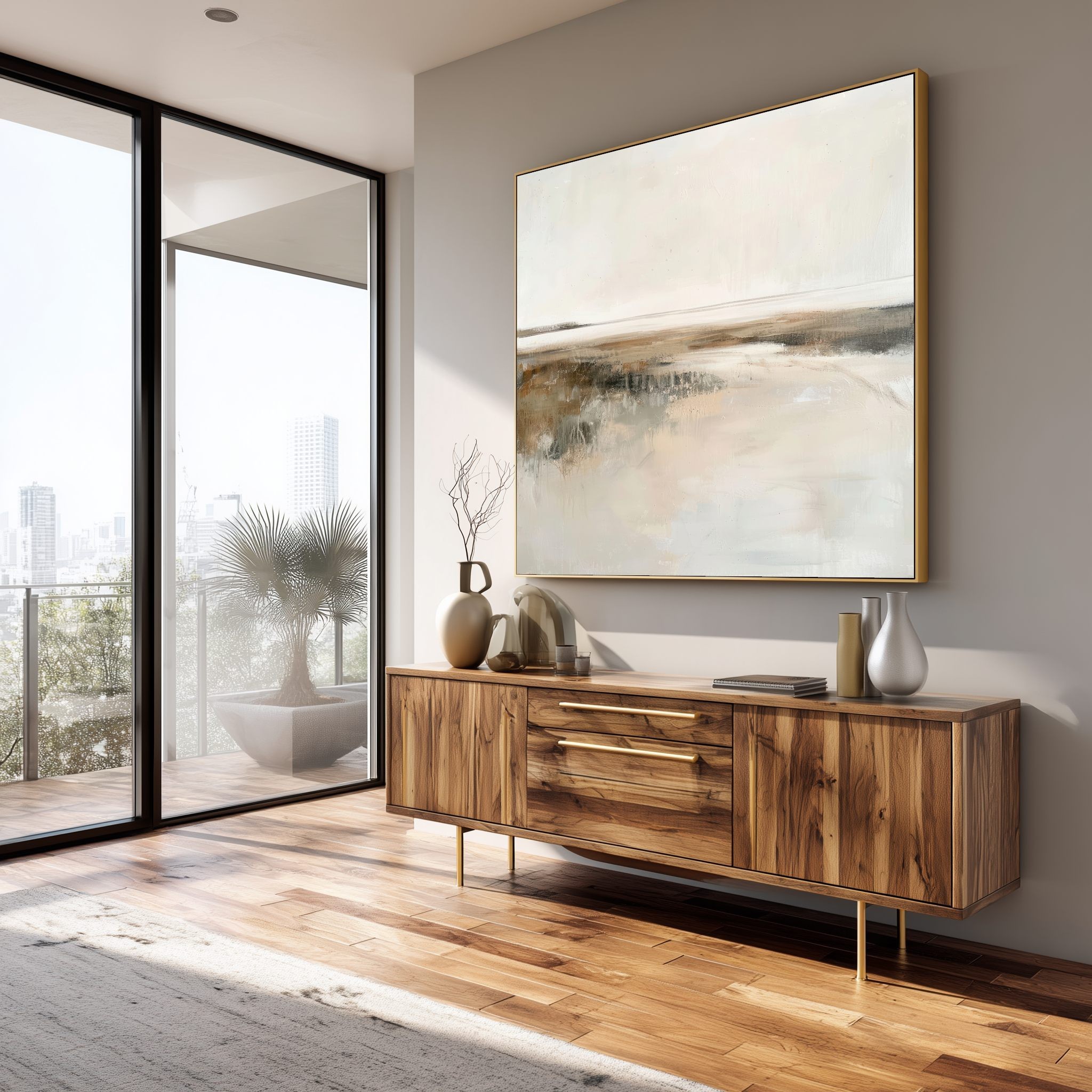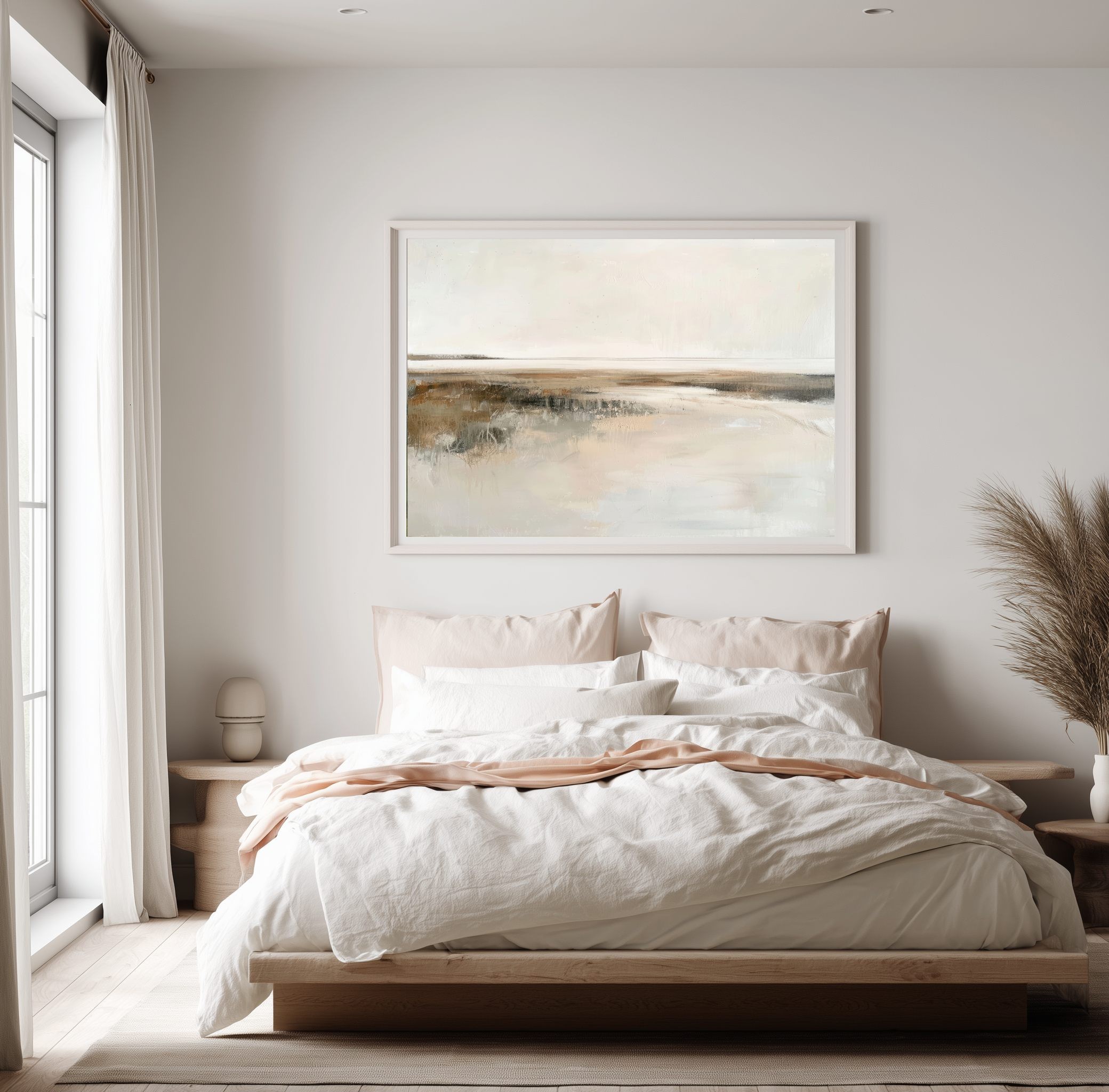 Questo quadro moderno grande interpreta un paesaggio astratto minimalista caratterizzato da un orizzonte delicato e da superfici morbide, quasi eteree. Le sfumature calde di beige, avorio, sabbia e grigio chiaro si fondono in una composizione equilibrata e luminosa, arricchita da leggere texture materiche che donano profondità senza appesantire l’insieme. Ideale per pareti ampie, questo quadro astratto contemporaneo è perfetto per soggiorni moderni, camere da letto raffinate, studi professionali e ambienti arredati in stile Japandi, minimal, wabi-sabi o moderno elegante, creando un’atmosfera rilassante e sofisticata.