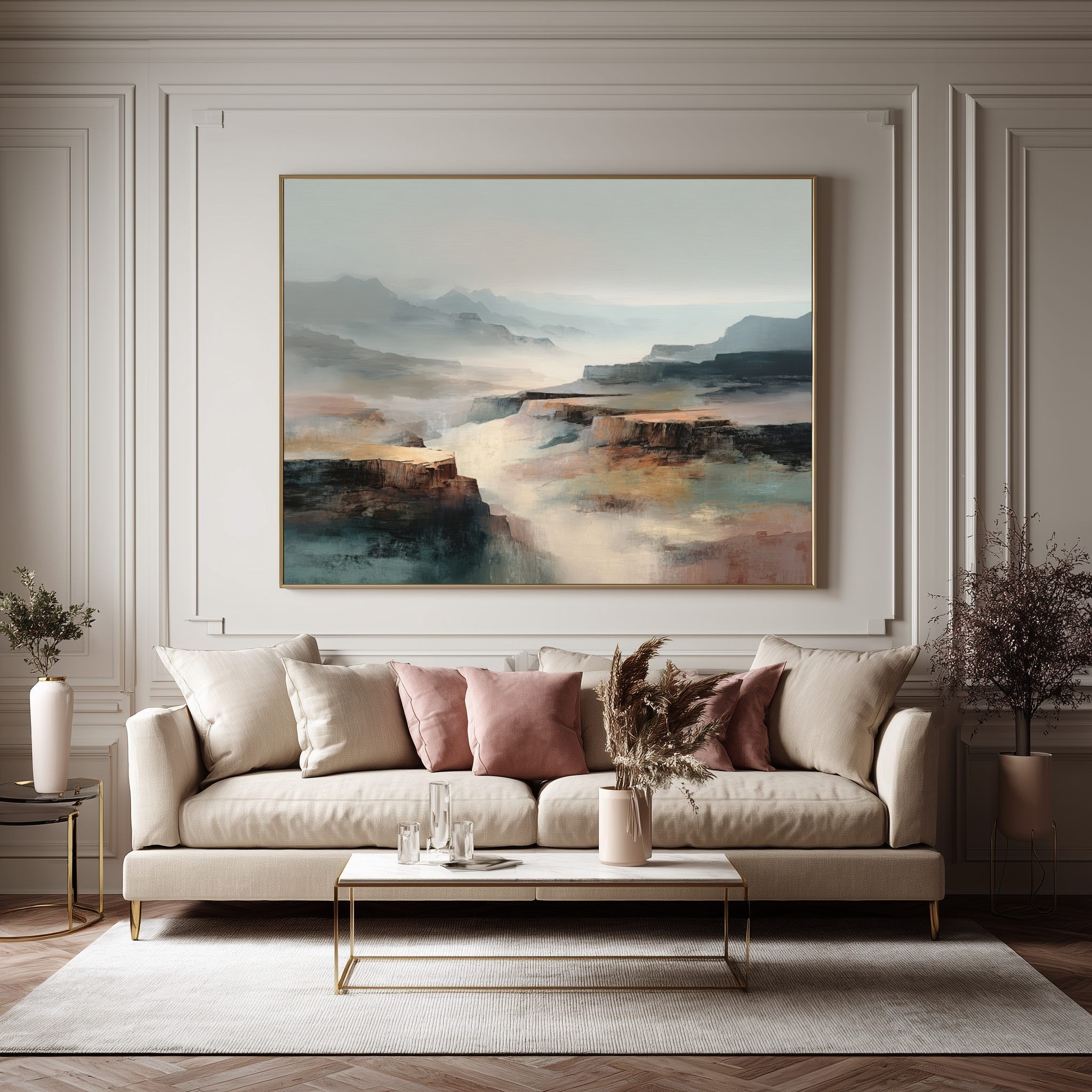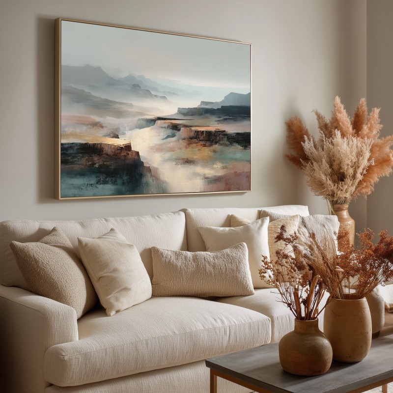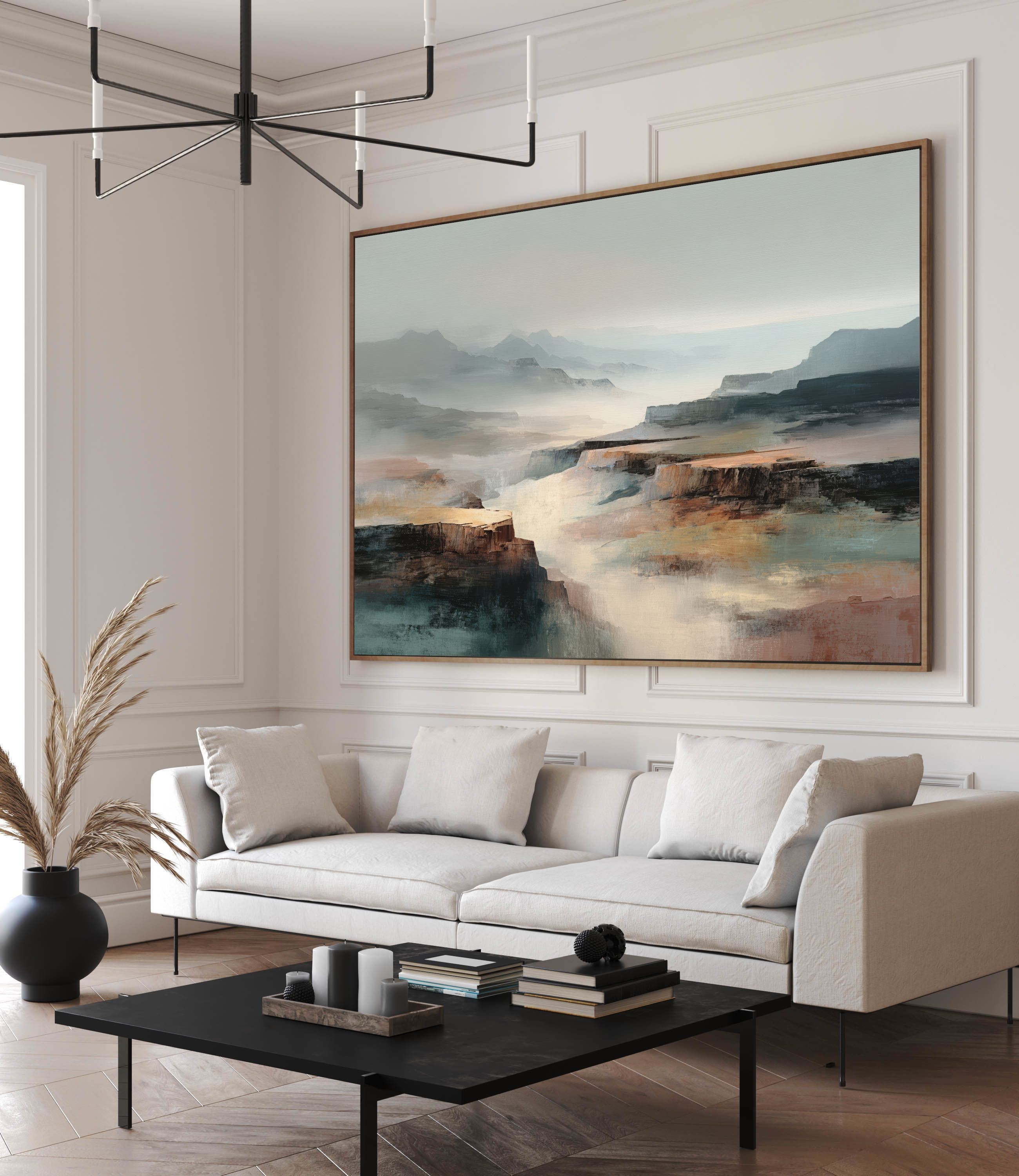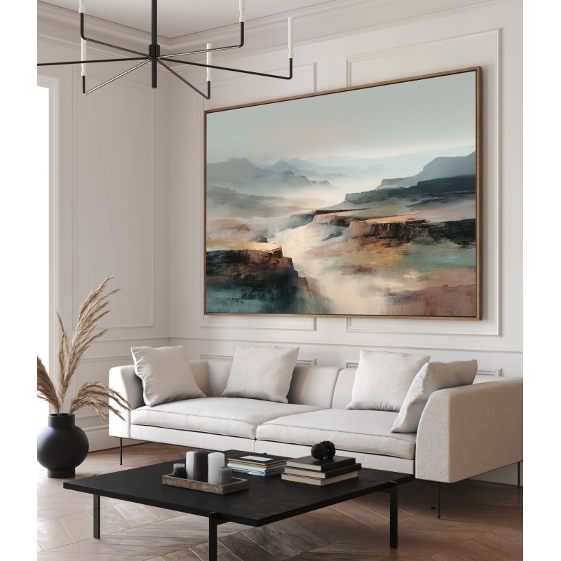 Questo quadro moderno grande raffigura un paesaggio astratto contemporaneo ispirato a canyon e altopiani naturali, interpretati in chiave minimalista. Le stratificazioni materiche e le sfumature calde nei toni terra, sabbia, ocra, beige e grigio polvere creano profondità e movimento, evocando una sensazione di silenzio e vastità. La composizione orizzontale e l’uso equilibrato del colore rendono questo quadro astratto di grandi dimensioni ideale per soggiorni moderni, pareti importanti, open space, studi professionali e ambienti arredati in stile contemporaneo, japandi, wabi-sabi o minimal chic.