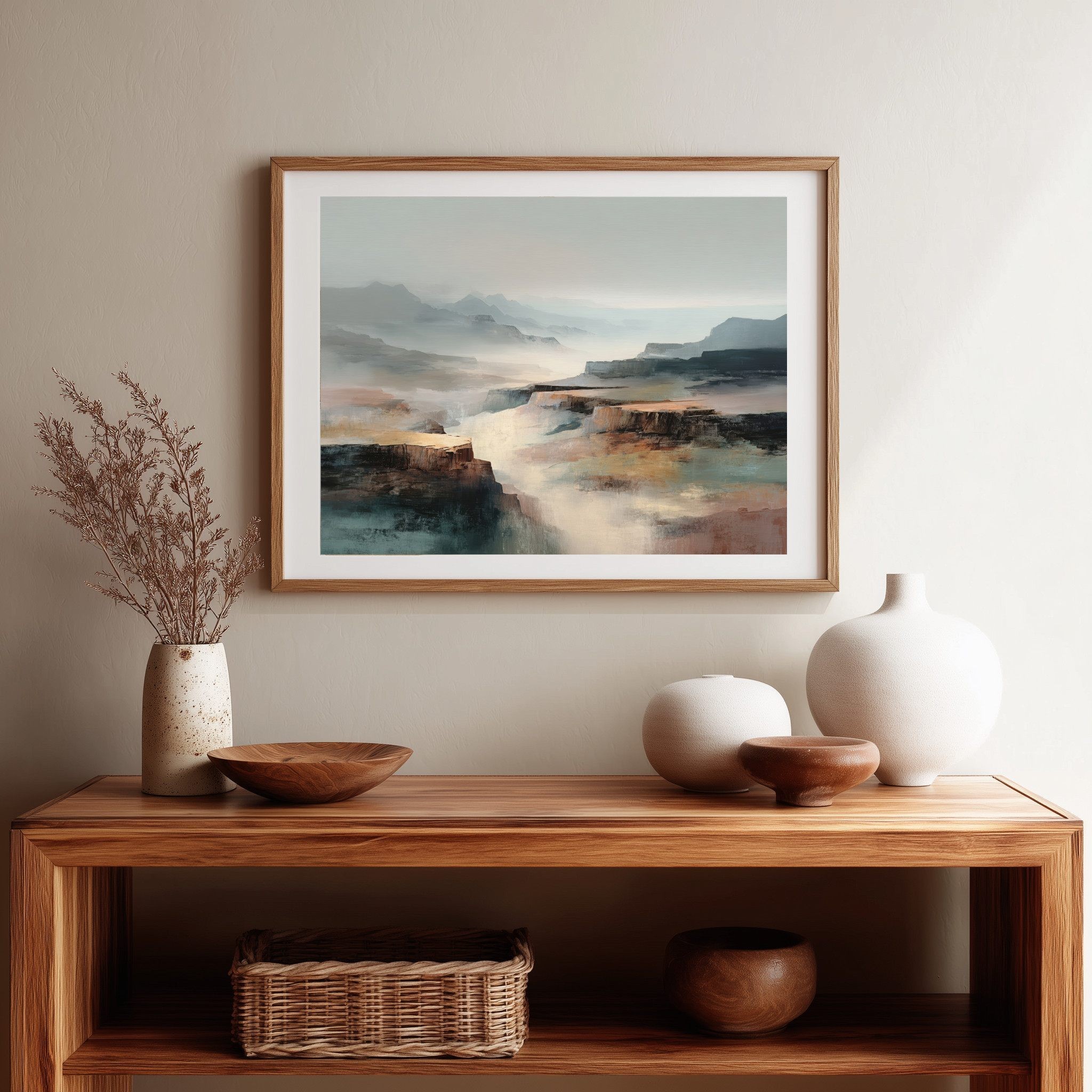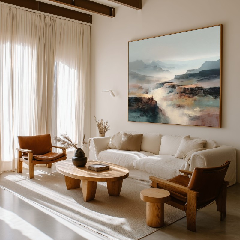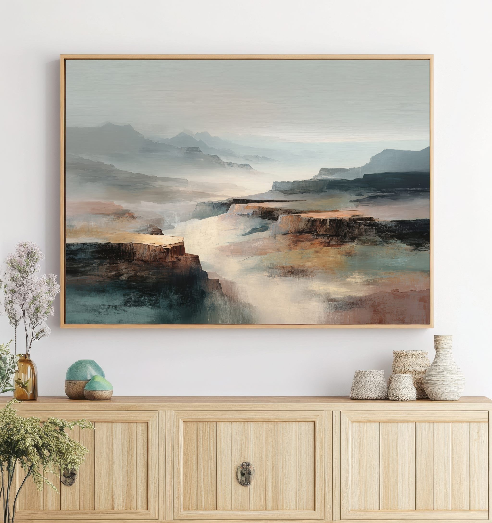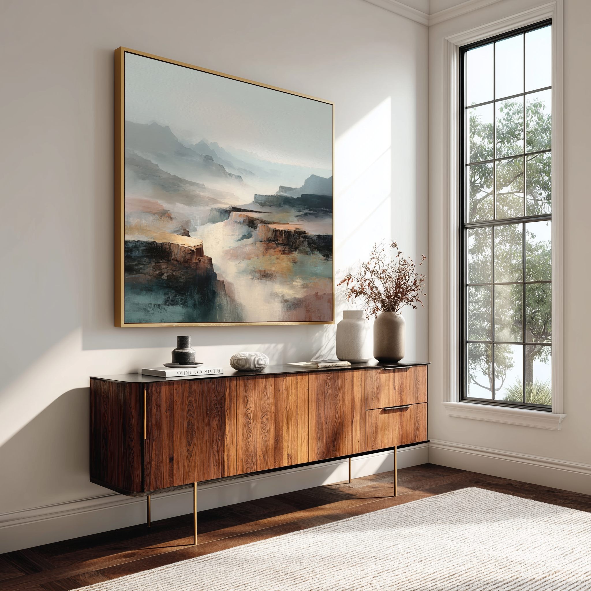 Questo quadro moderno grande raffigura un paesaggio astratto contemporaneo ispirato a canyon e altopiani naturali, interpretati in chiave minimalista. Le stratificazioni materiche e le sfumature calde nei toni terra, sabbia, ocra, beige e grigio polvere creano profondità e movimento, evocando una sensazione di silenzio e vastità. La composizione orizzontale e l’uso equilibrato del colore rendono questo quadro astratto di grandi dimensioni ideale per soggiorni moderni, pareti importanti, open space, studi professionali e ambienti arredati in stile contemporaneo, japandi, wabi-sabi o minimal chic.
