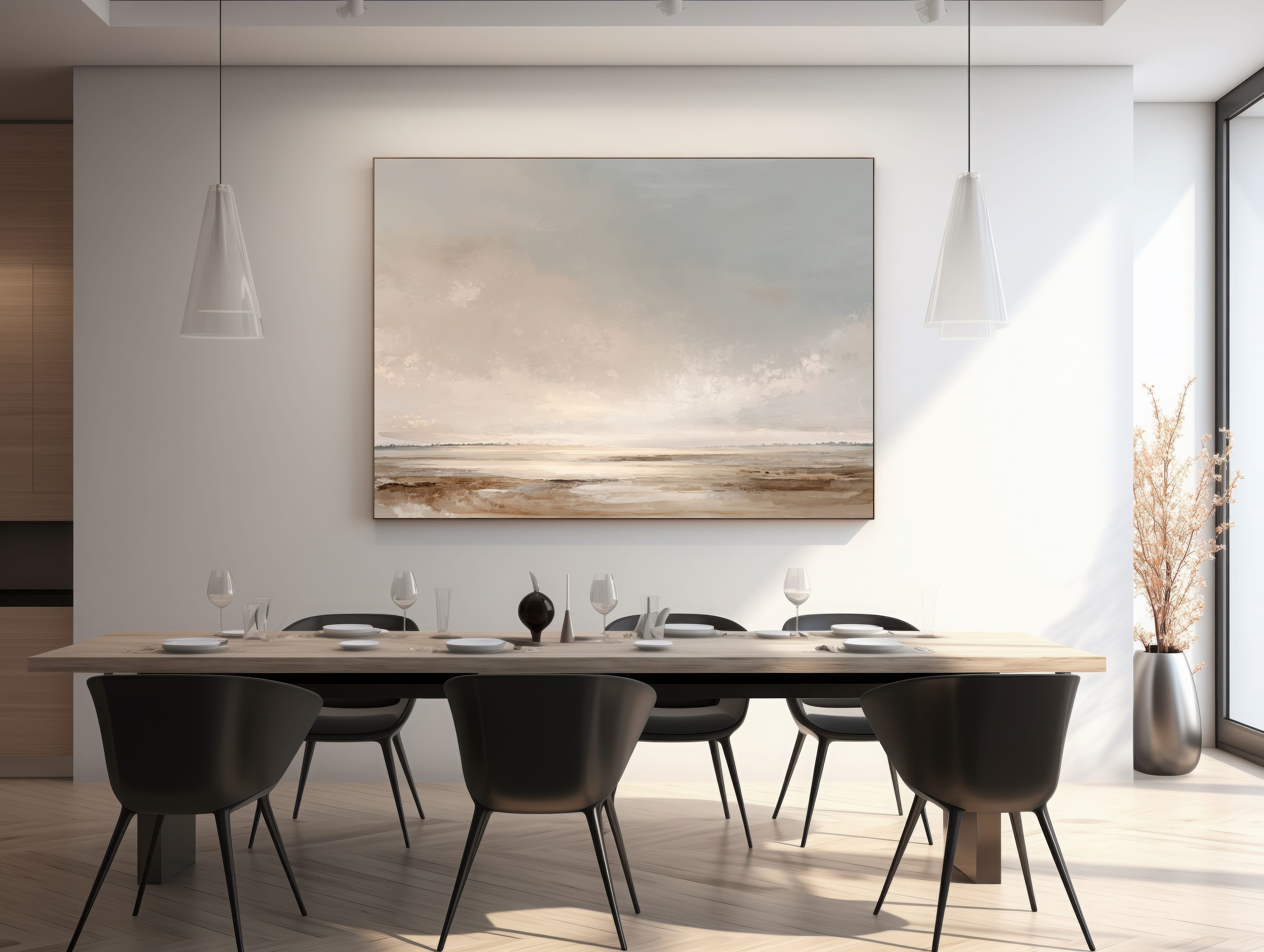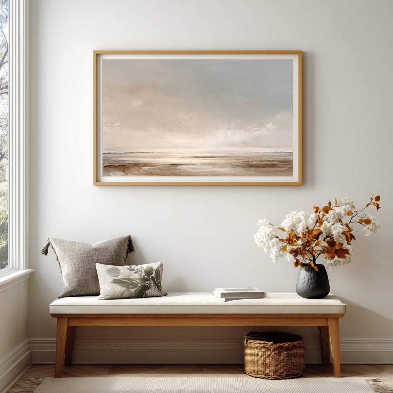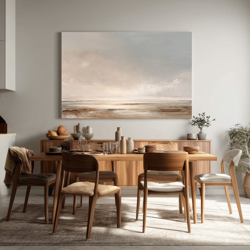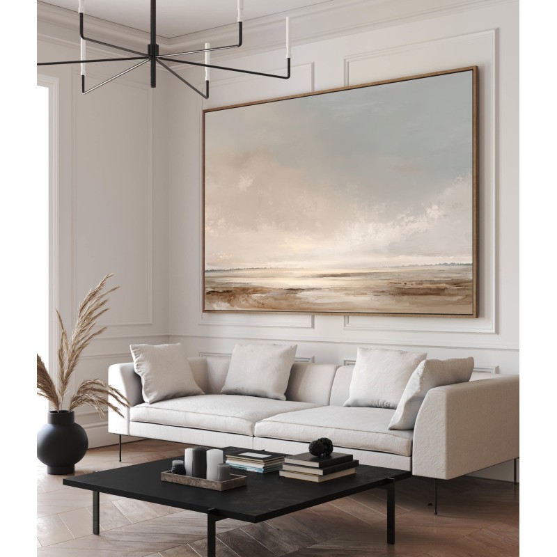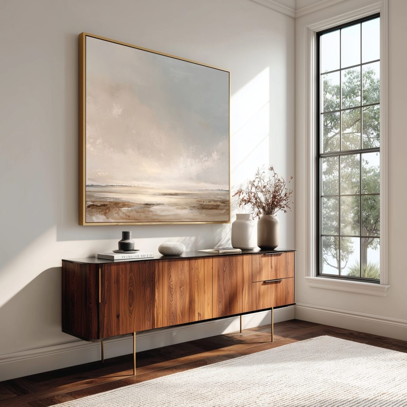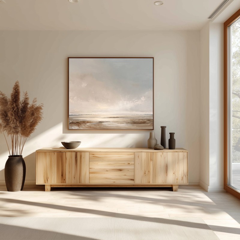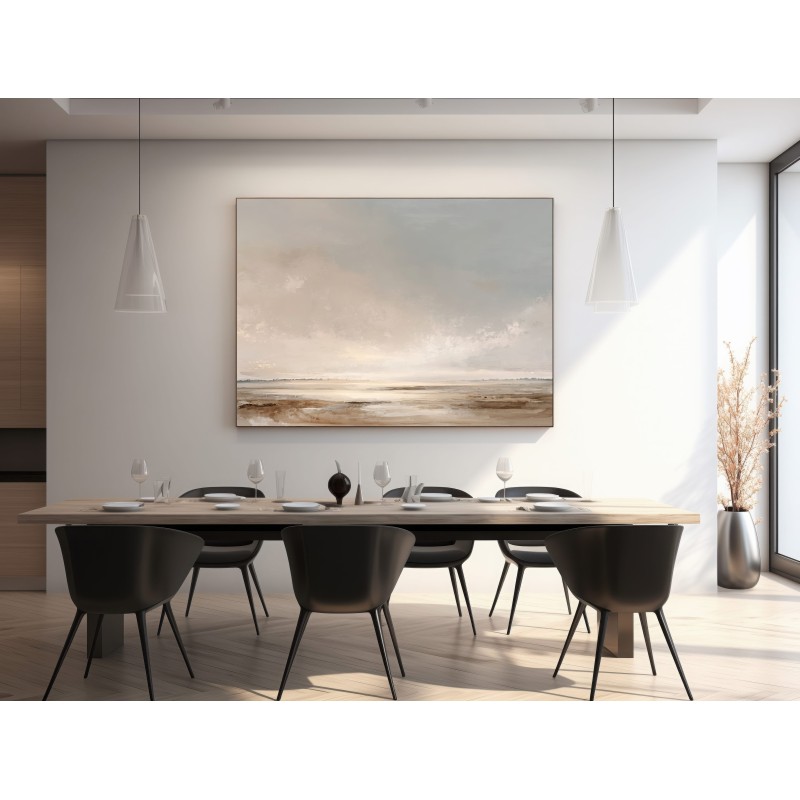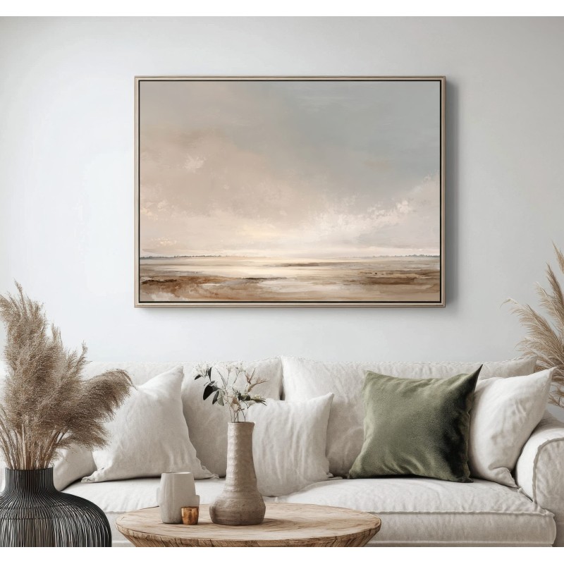 Questo quadro astratto moderno raffigura un paesaggio minimalista ispirato all’orizzonte naturale, realizzato con toni neutri e sabbia che evocano silenzio, luce e profondità. Le sfumature morbide di beige, avorio e grigio caldo creano un’atmosfera rilassante e sofisticata, ideale per ambienti contemporanei. Pensato come quadro moderno grande, è perfetto per soggiorni eleganti, camere da letto moderne e spazi professionali. Un’opera di arte astratta contemporanea che valorizza l’ambiente con equilibrio, armonia e stile senza tempo.