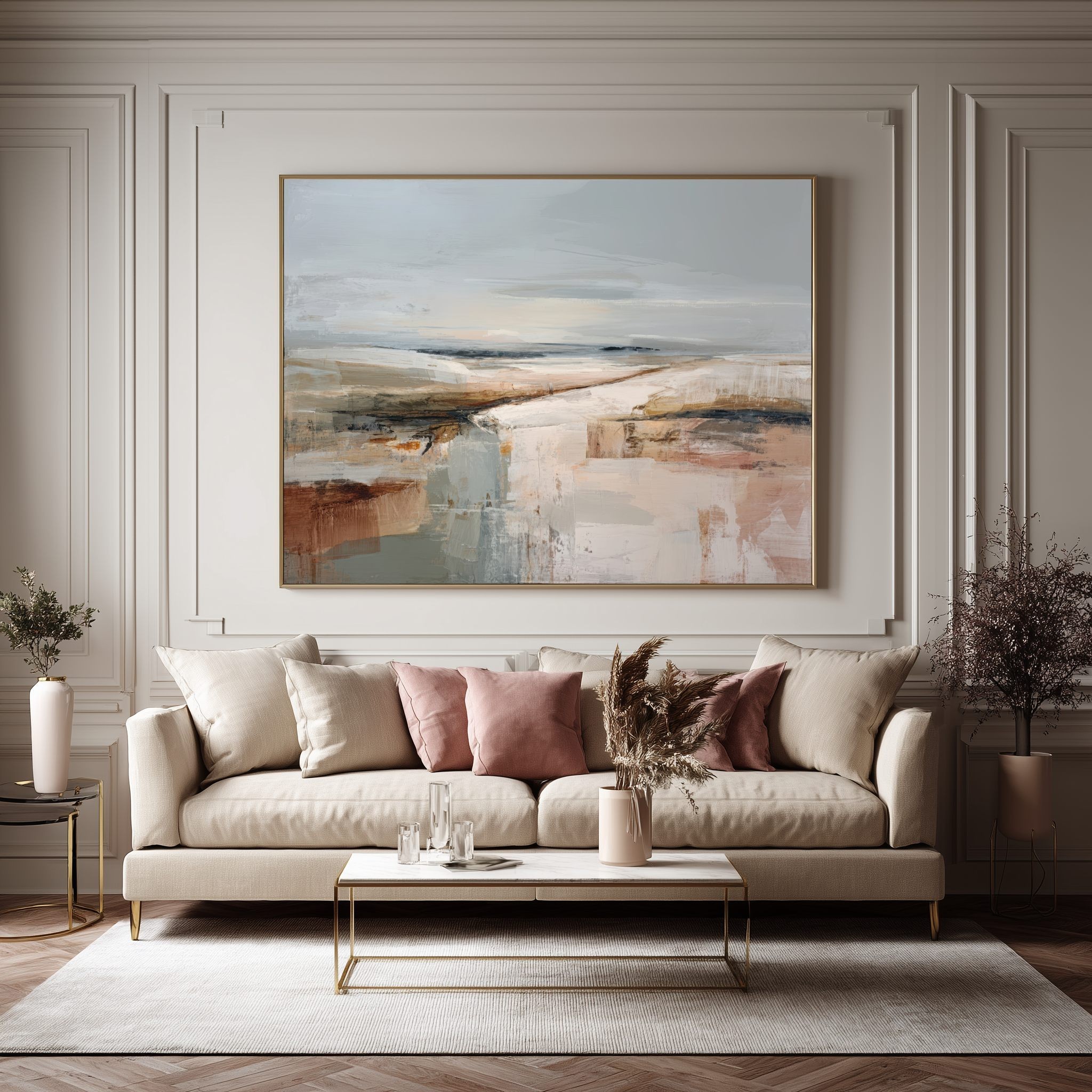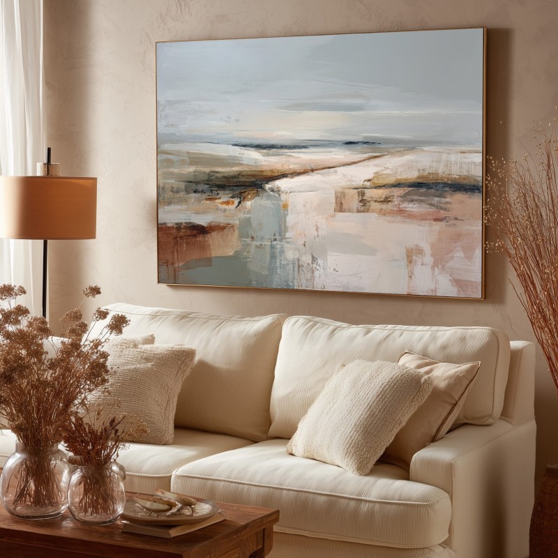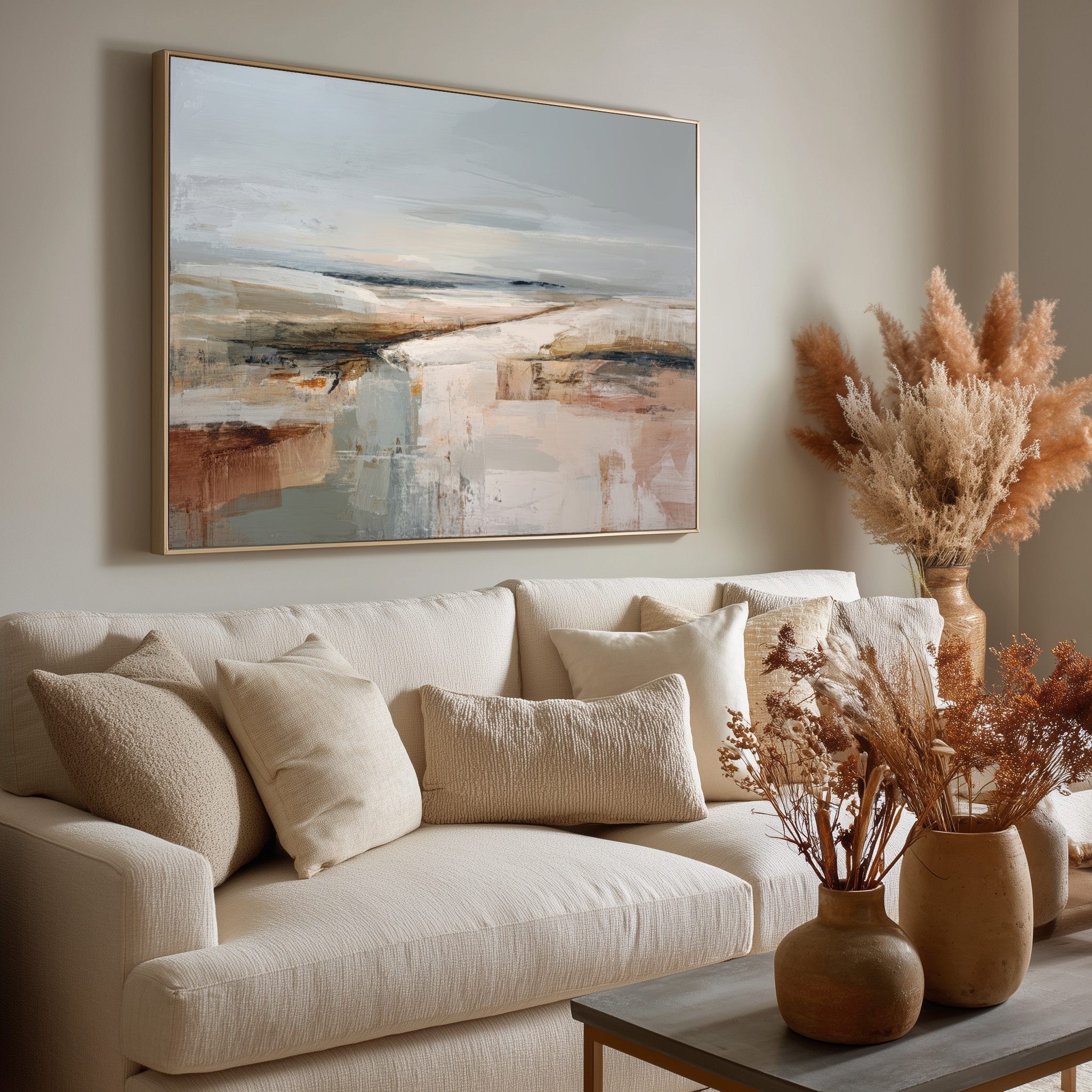 Questo quadro astratto moderno rappresenta un paesaggio contemporaneo delicato e luminoso, caratterizzato da toni chiari, neutri e naturali. Le superfici materiche e le sfumature morbide di beige, grigio e sabbia creano una composizione elegante e rilassante, ideale per ambienti raffinati. Perfetto come quadro moderno grande, valorizza soggiorni minimal, camere da letto e spazi professionali. Un’opera di arte astratta contemporanea pensata per chi cerca equilibrio visivo, luce e design senza tempo.