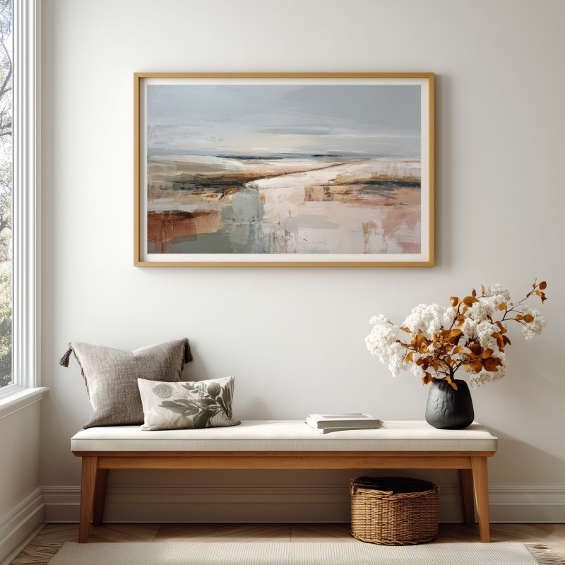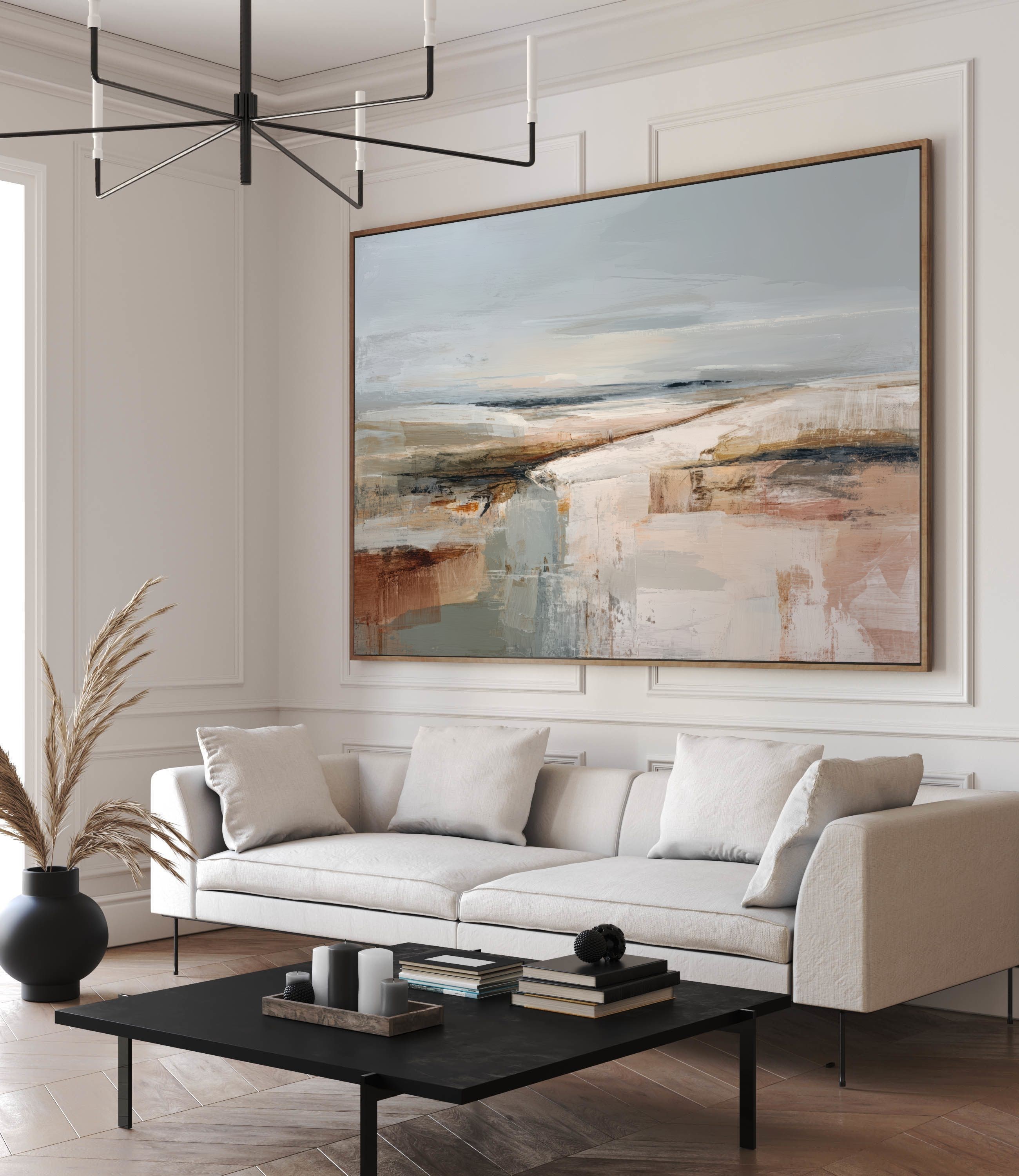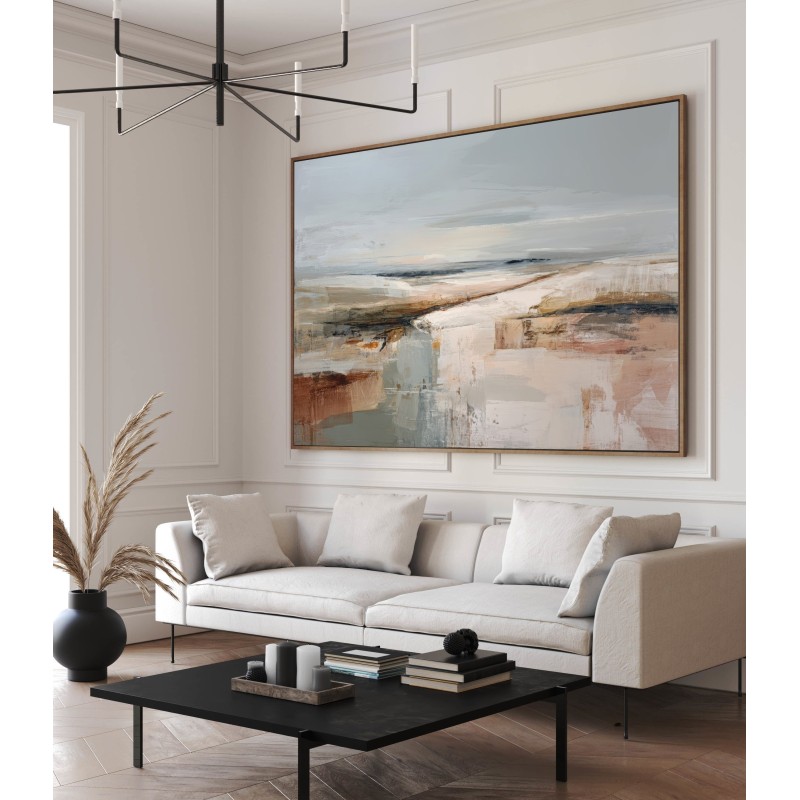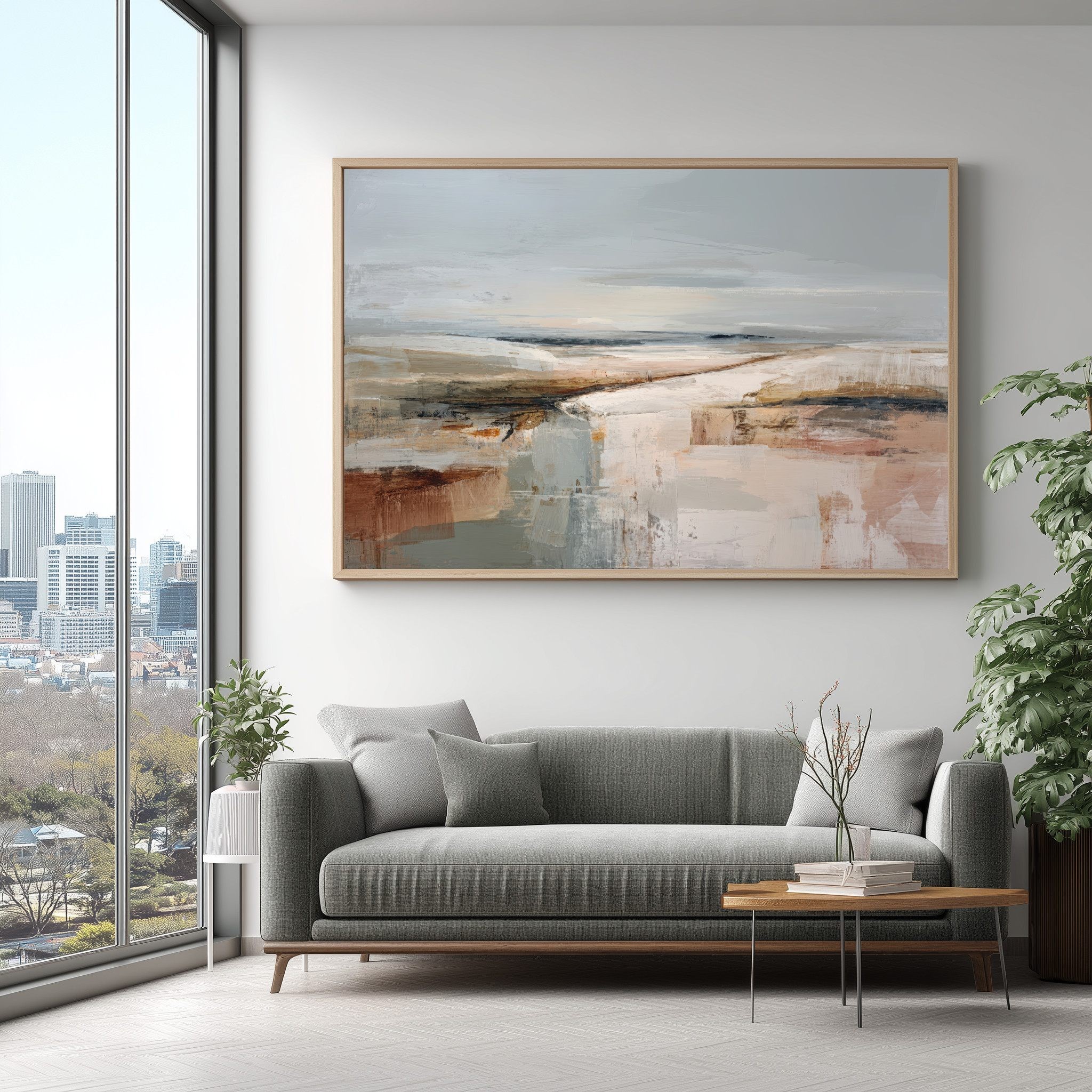 Questo quadro astratto moderno rappresenta un paesaggio contemporaneo delicato e luminoso, caratterizzato da toni chiari, neutri e naturali. Le superfici materiche e le sfumature morbide di beige, grigio e sabbia creano una composizione elegante e rilassante, ideale per ambienti raffinati. Perfetto come quadro moderno grande, valorizza soggiorni minimal, camere da letto e spazi professionali. Un’opera di arte astratta contemporanea pensata per chi cerca equilibrio visivo, luce e design senza tempo.