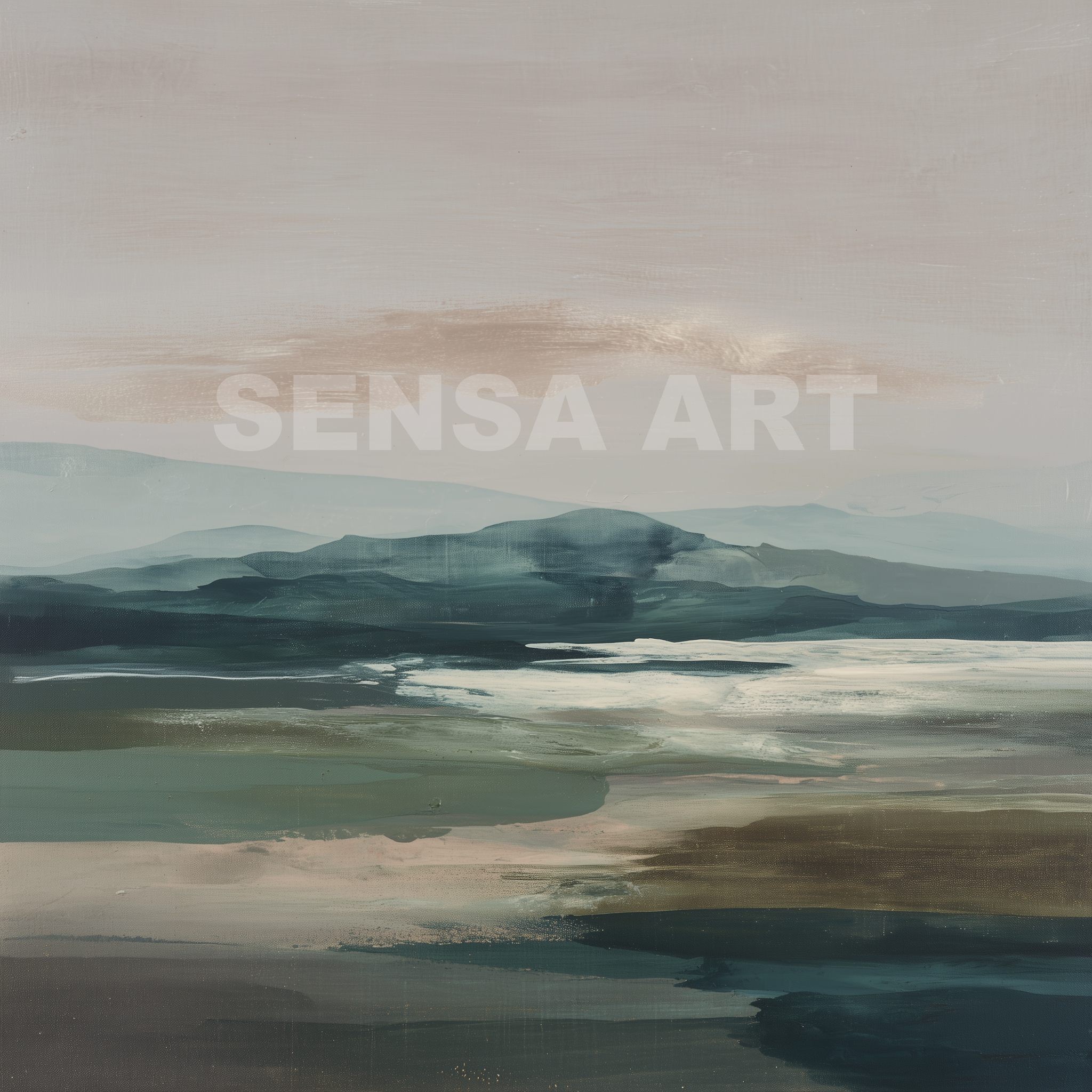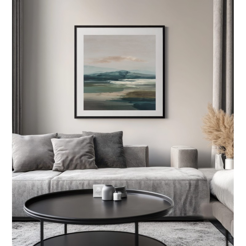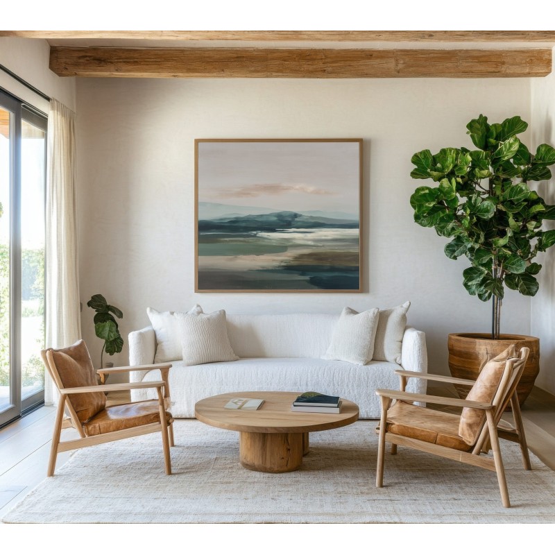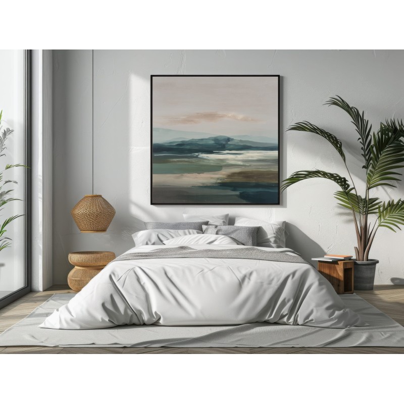Questo quadro astratto moderno raffigura un paesaggio naturale stilizzato, con colline morbide e superfici d’acqua reinterpretate in toni verde, blu polvere e sabbia neutra. La composizione orizzontale e i colori equilibrati trasmettono calma e profondità visiva, rendendo l’opera ideale come quadro moderno grande per soggiorni eleganti, camere da letto o studi contemporanei. Perfetto per interni minimalisti, moderni e ispirati alla natura, dona armonia e raffinatezza agli spazi.