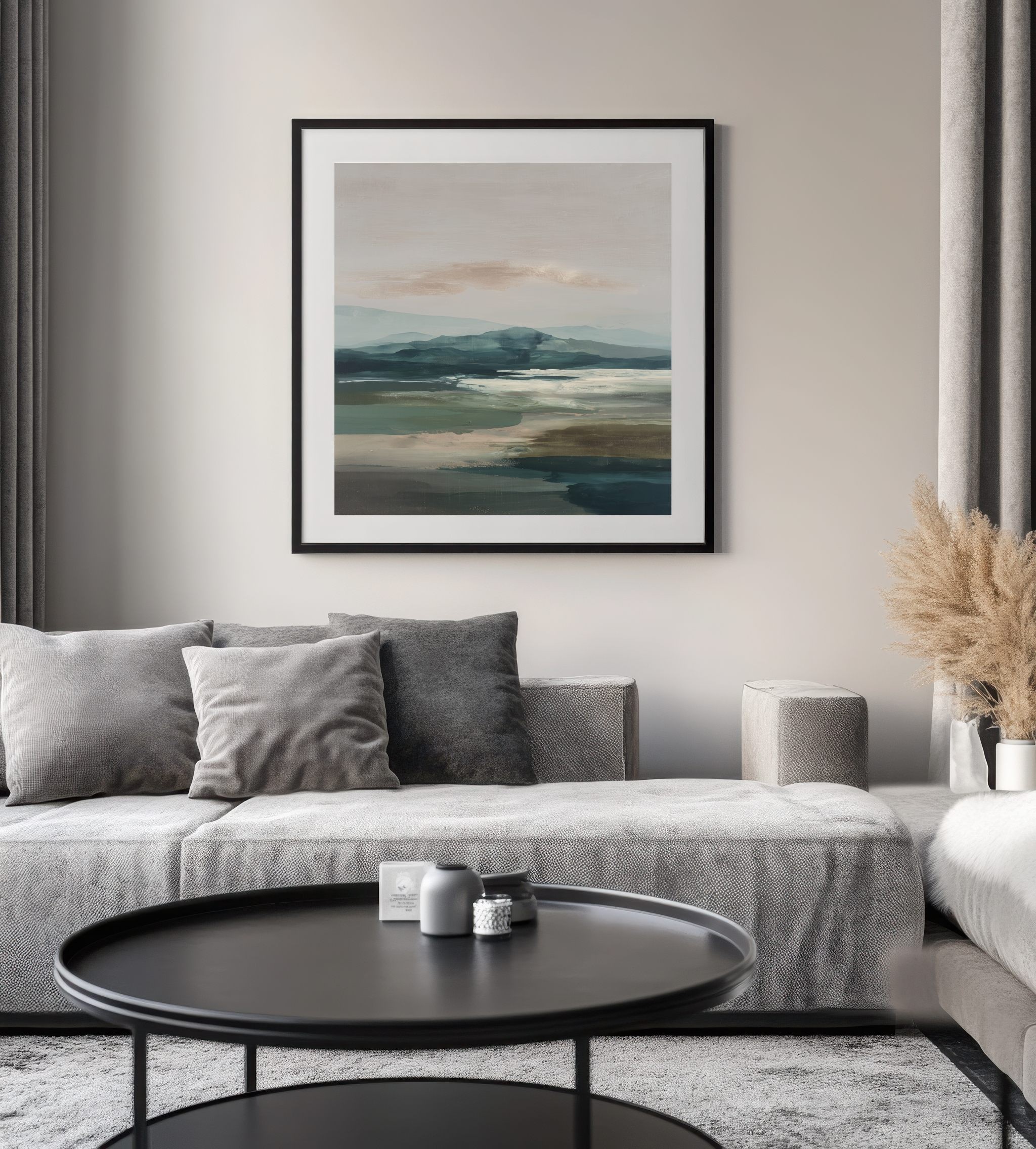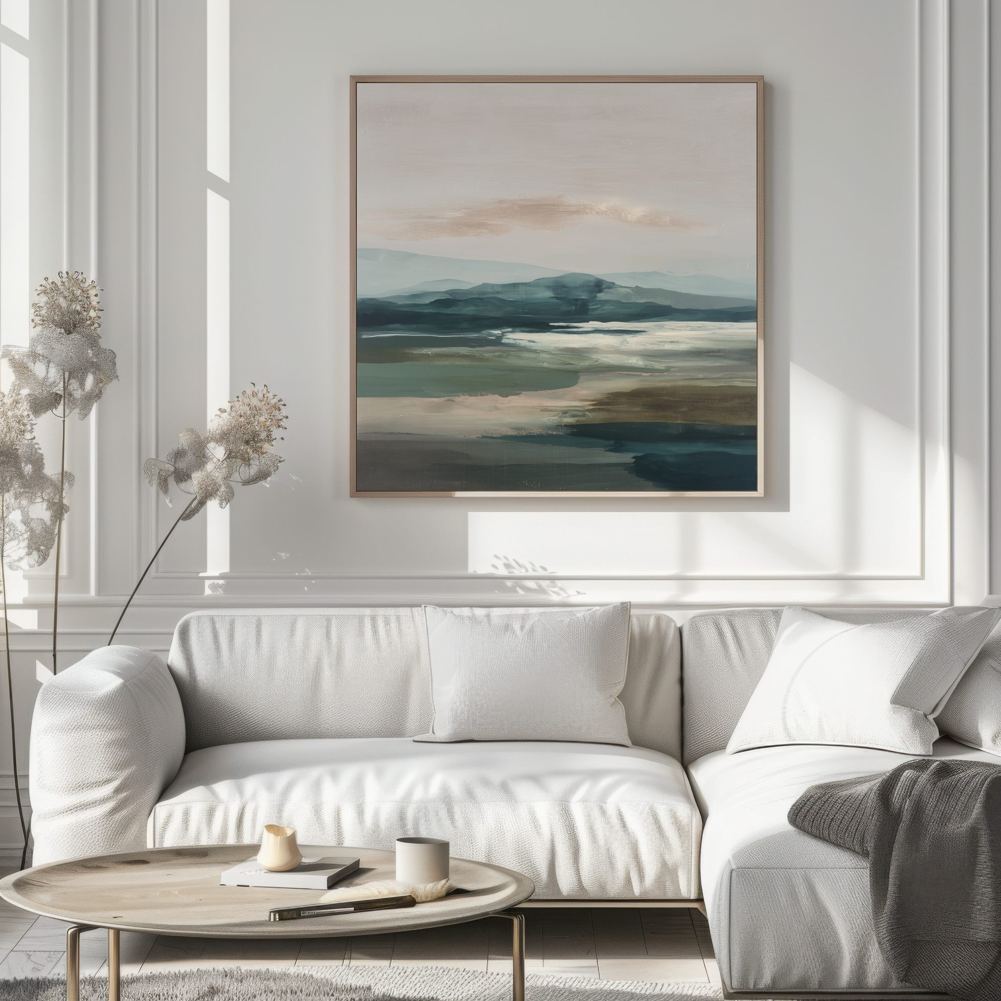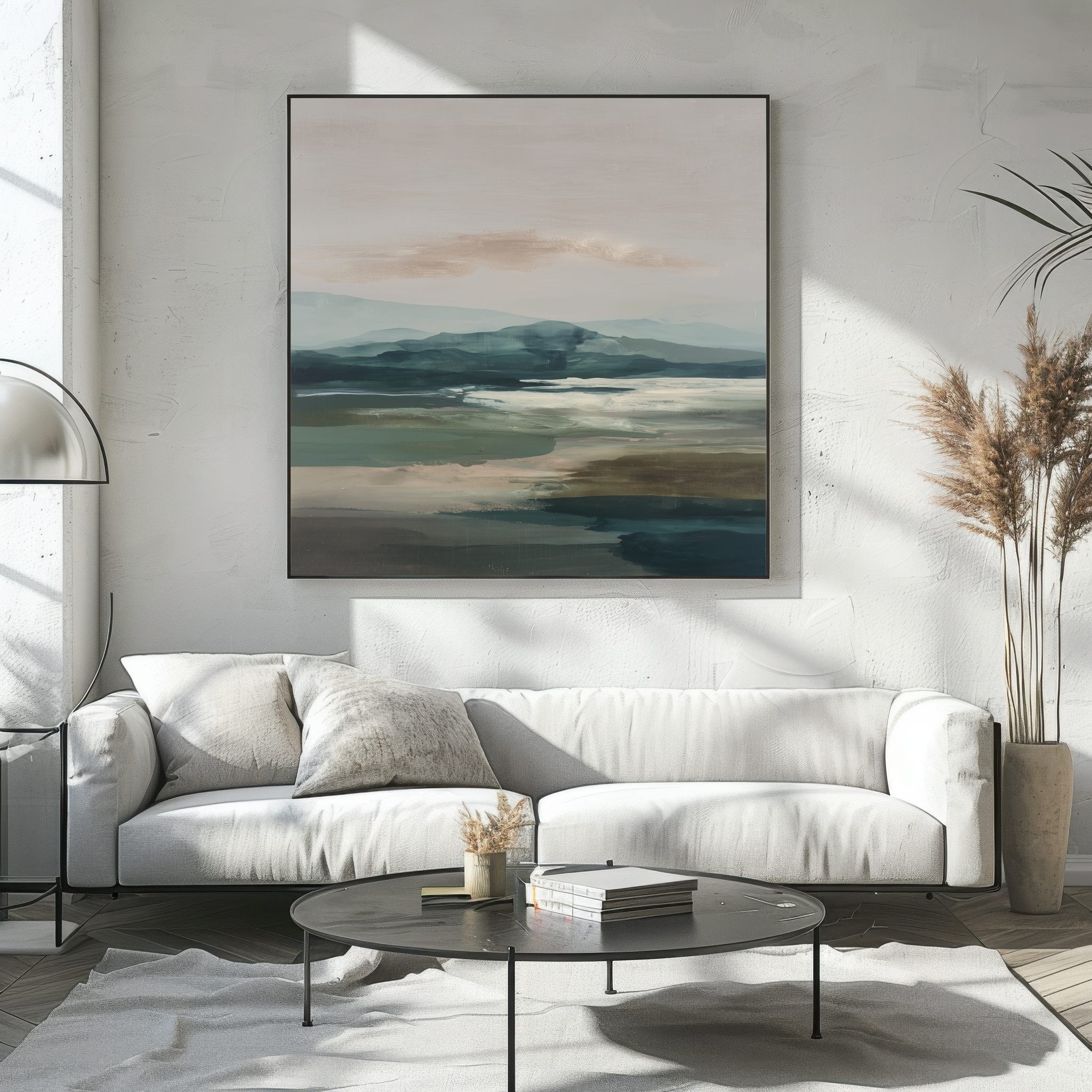 Questo quadro astratto moderno raffigura un paesaggio naturale stilizzato, con colline morbide e superfici d’acqua reinterpretate in toni verde, blu polvere e sabbia neutra. La composizione orizzontale e i colori equilibrati trasmettono calma e profondità visiva, rendendo l’opera ideale come quadro moderno grande per soggiorni eleganti, camere da letto o studi contemporanei. Perfetto per interni minimalisti, moderni e ispirati alla natura, dona armonia e raffinatezza agli spazi.