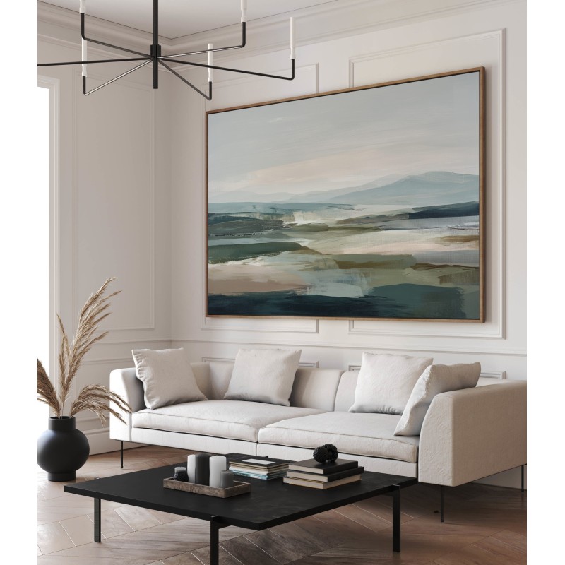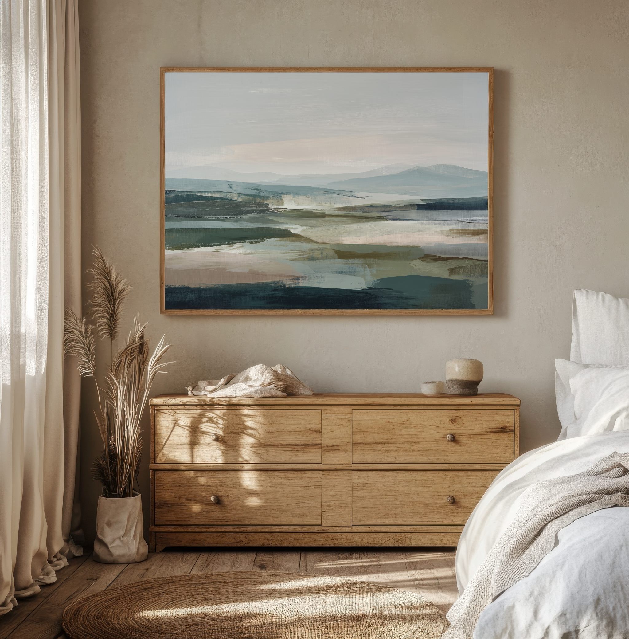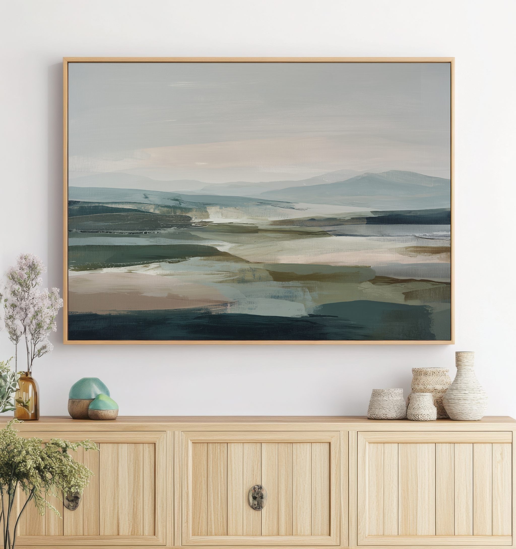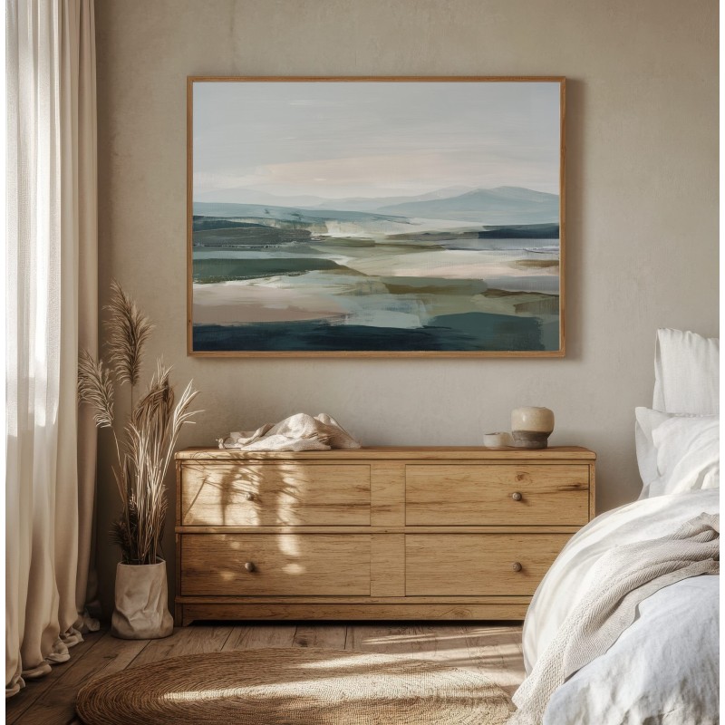 Questo quadro astratto moderno rappresenta un paesaggio orizzontale minimalista, composto da strati cromatici delicati che evocano colline lontane e superfici d’acqua. I toni naturali di verde salvia, blu polveroso, beige e grigio creano un effetto visivo armonioso e rilassante. Ideale come quadro moderno grande, è perfetto per soggiorni contemporanei, camere da letto raffinate o spazi professionali. Un’opera pensata per chi ama l’arte astratta elegante e l’equilibrio visivo.