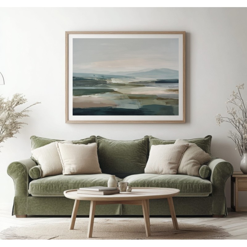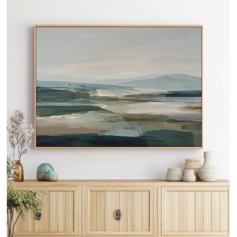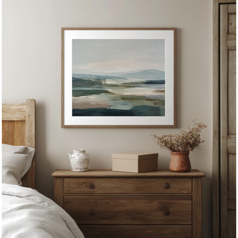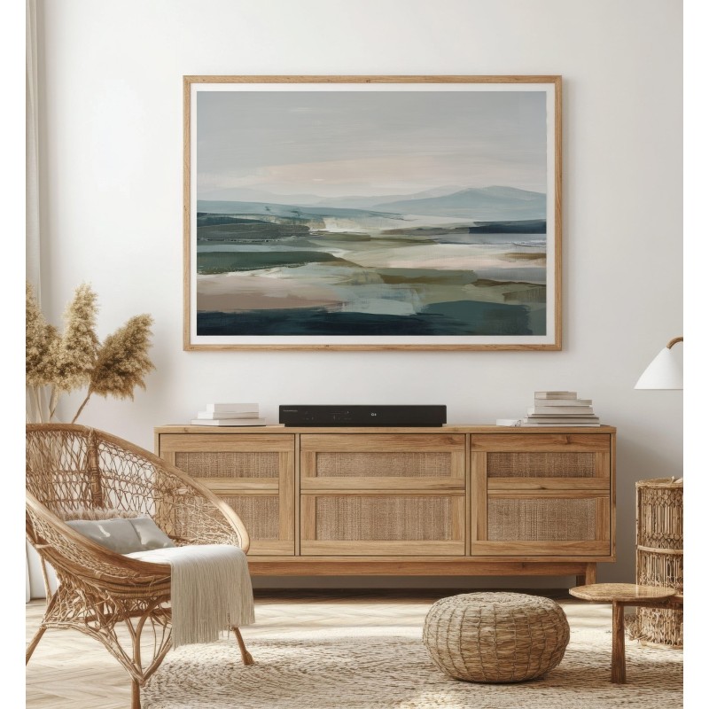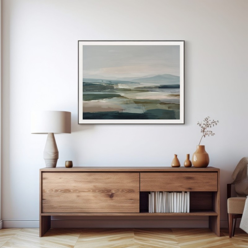 Questo quadro astratto moderno rappresenta un paesaggio orizzontale minimalista, composto da strati cromatici delicati che evocano colline lontane e superfici d’acqua. I toni naturali di verde salvia, blu polveroso, beige e grigio creano un effetto visivo armonioso e rilassante. Ideale come quadro moderno grande, è perfetto per soggiorni contemporanei, camere da letto raffinate o spazi professionali. Un’opera pensata per chi ama l’arte astratta elegante e l’equilibrio visivo.