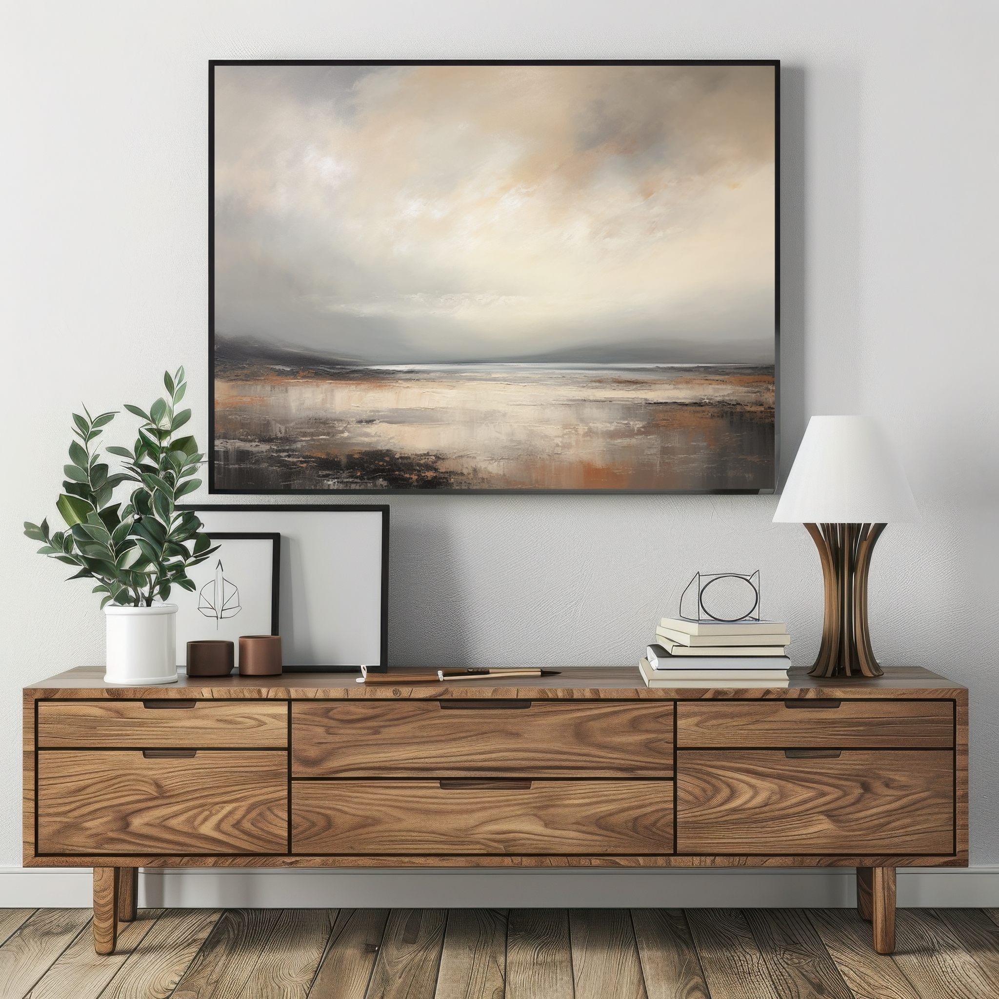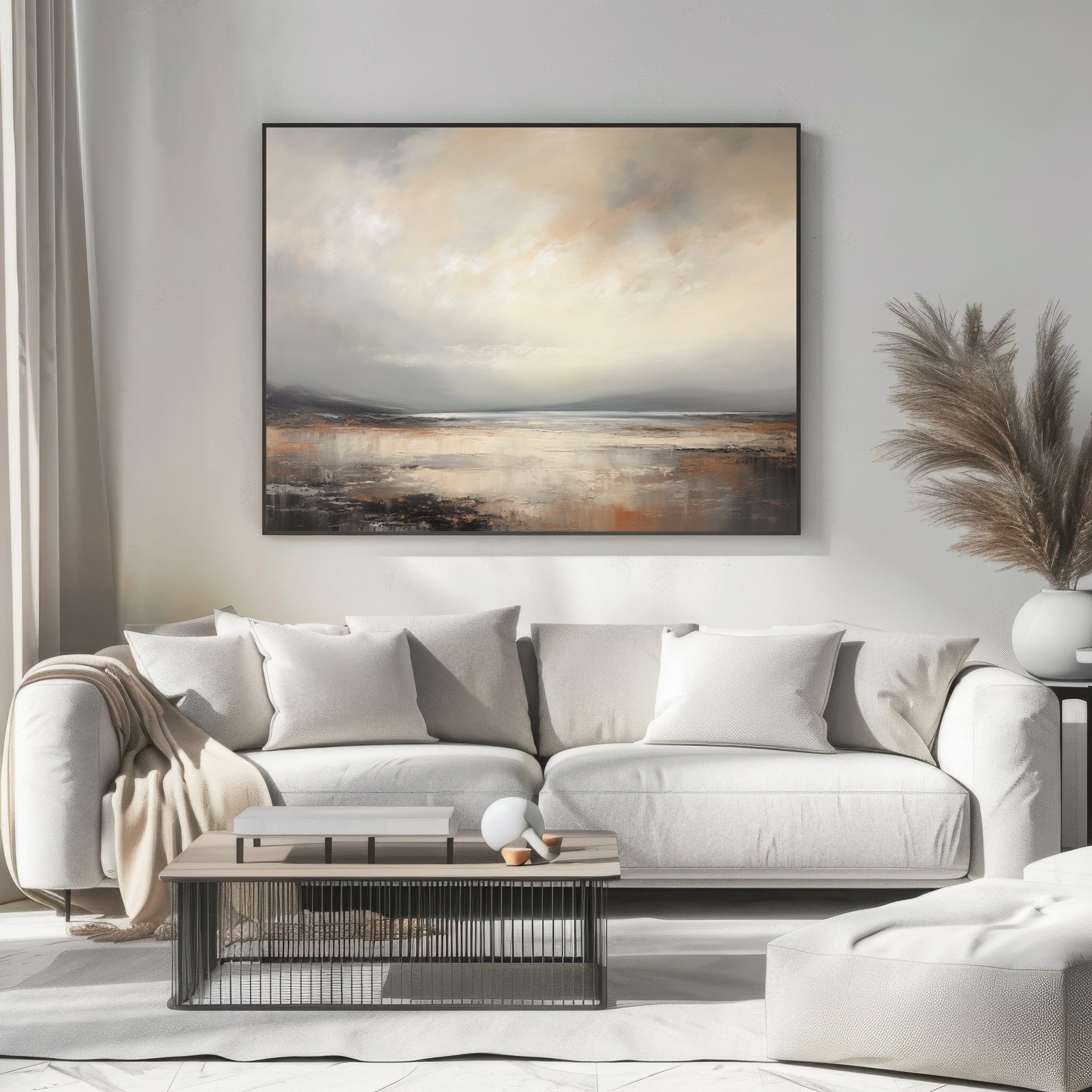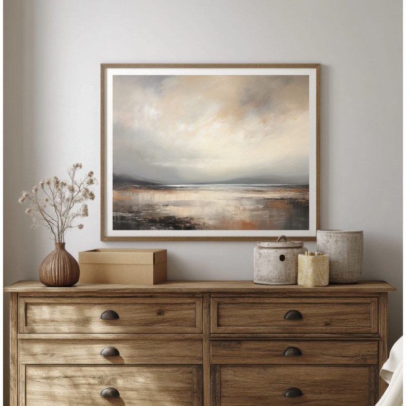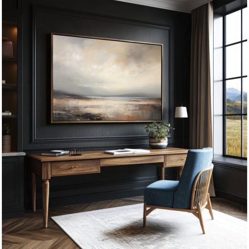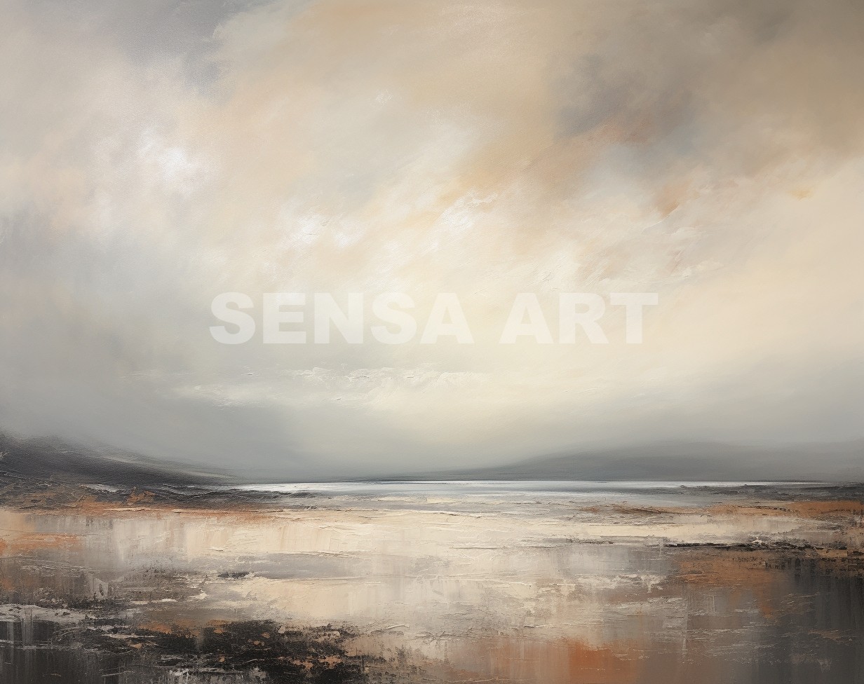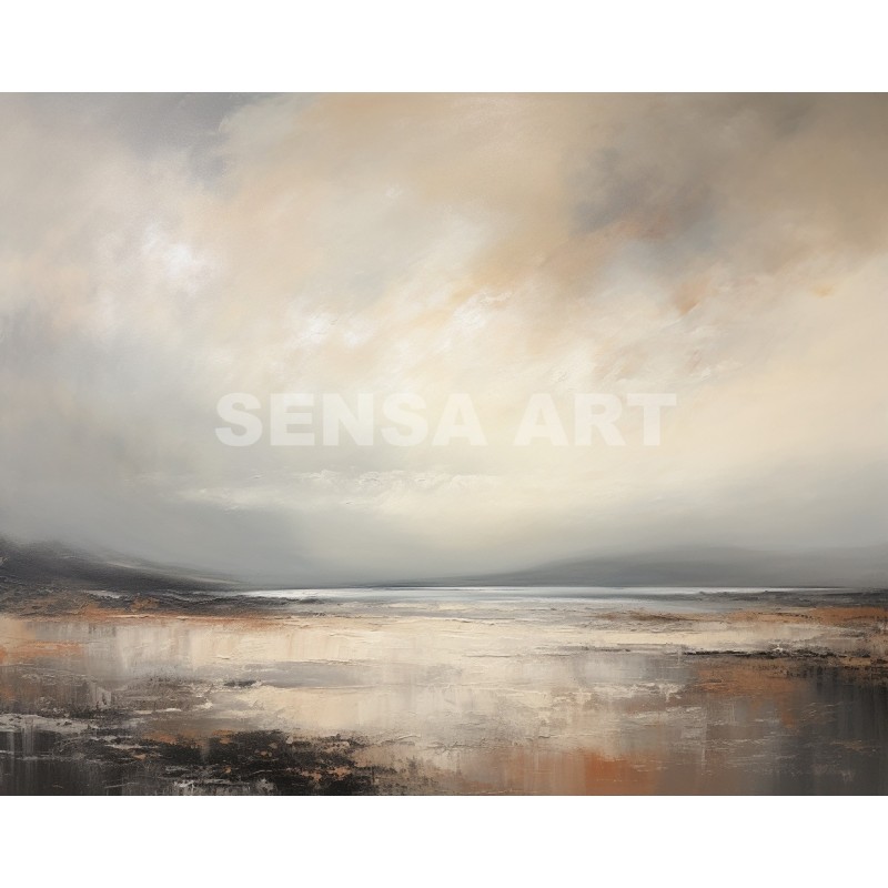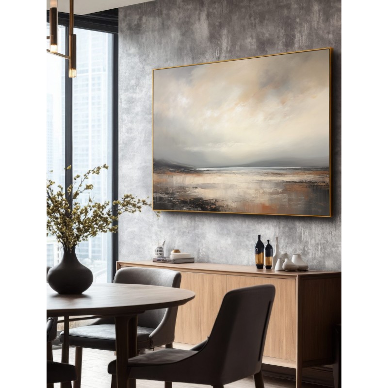 Questo quadro astratto moderno rappresenta un paesaggio marino essenziale, immerso in una luce morbida e avvolgente. Le sfumature neutre di beige, sabbia e grigio caldo, lavorate con texture pittoriche leggere, evocano calma, silenzio e profondità. Ideale come quadro moderno grande, si inserisce perfettamente in soggiorni eleganti, camere da letto raffinate o spazi minimal contemporanei. Un’opera pensata per chi cerca arte astratta luminosa, capace di valorizzare l’ambiente senza appesantirlo.