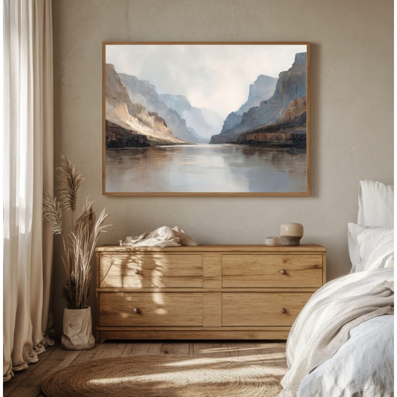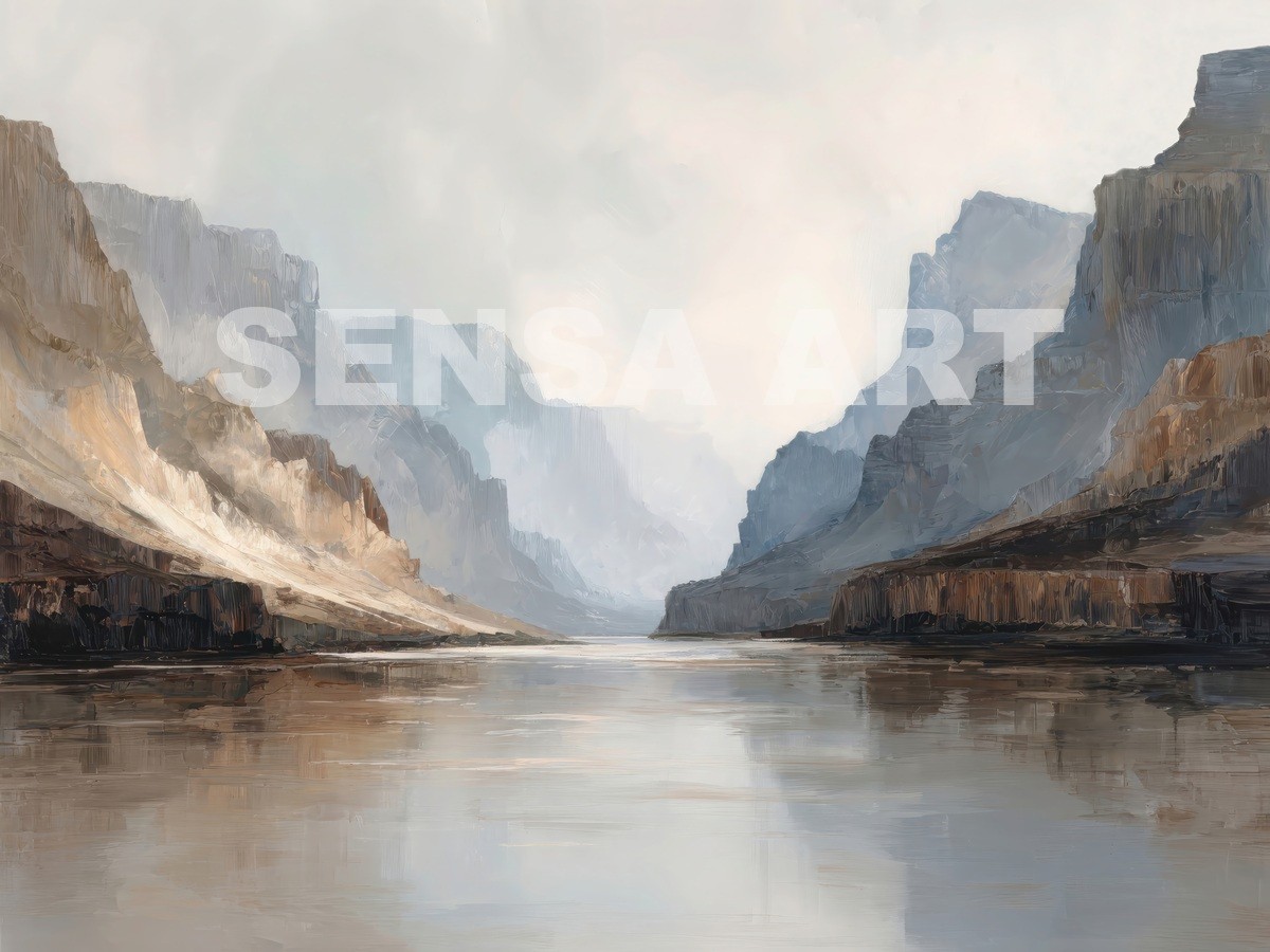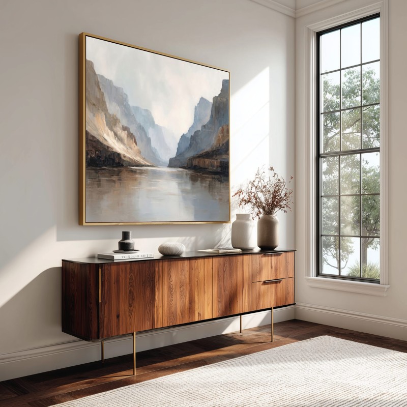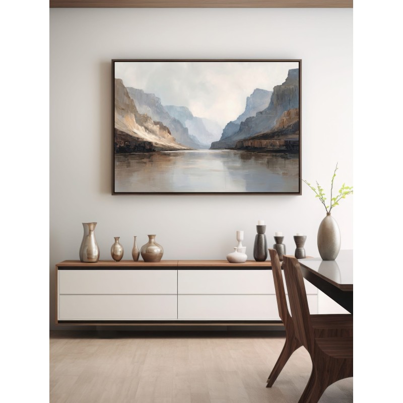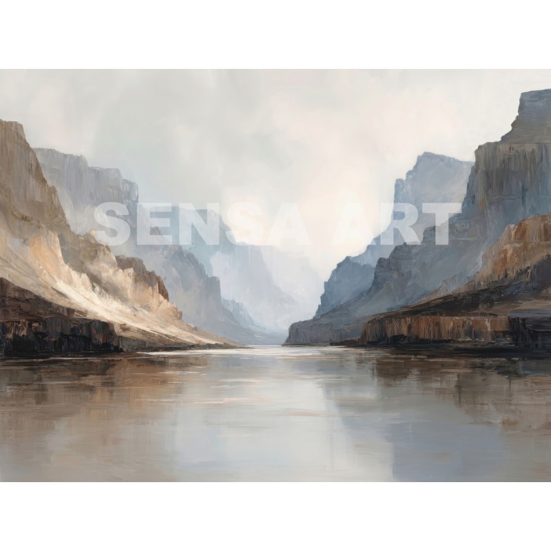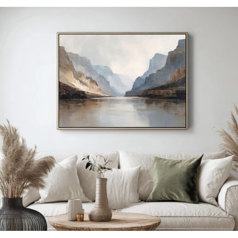 Questo quadro astratto moderno interpreta un maestoso paesaggio di canyon con pareti rocciose e riflessi d’acqua, resi attraverso toni neutri, sabbia, grigio e azzurro polveroso. Le pennellate ampie e materiche creano profondità e silenzio visivo, evocando una sensazione di equilibrio e contemplazione. Perfetto come quadro grande da parete, valorizza soggiorni moderni, ambienti minimal, studi professionali e spazi living eleganti con un’estetica contemporanea e raffinata.