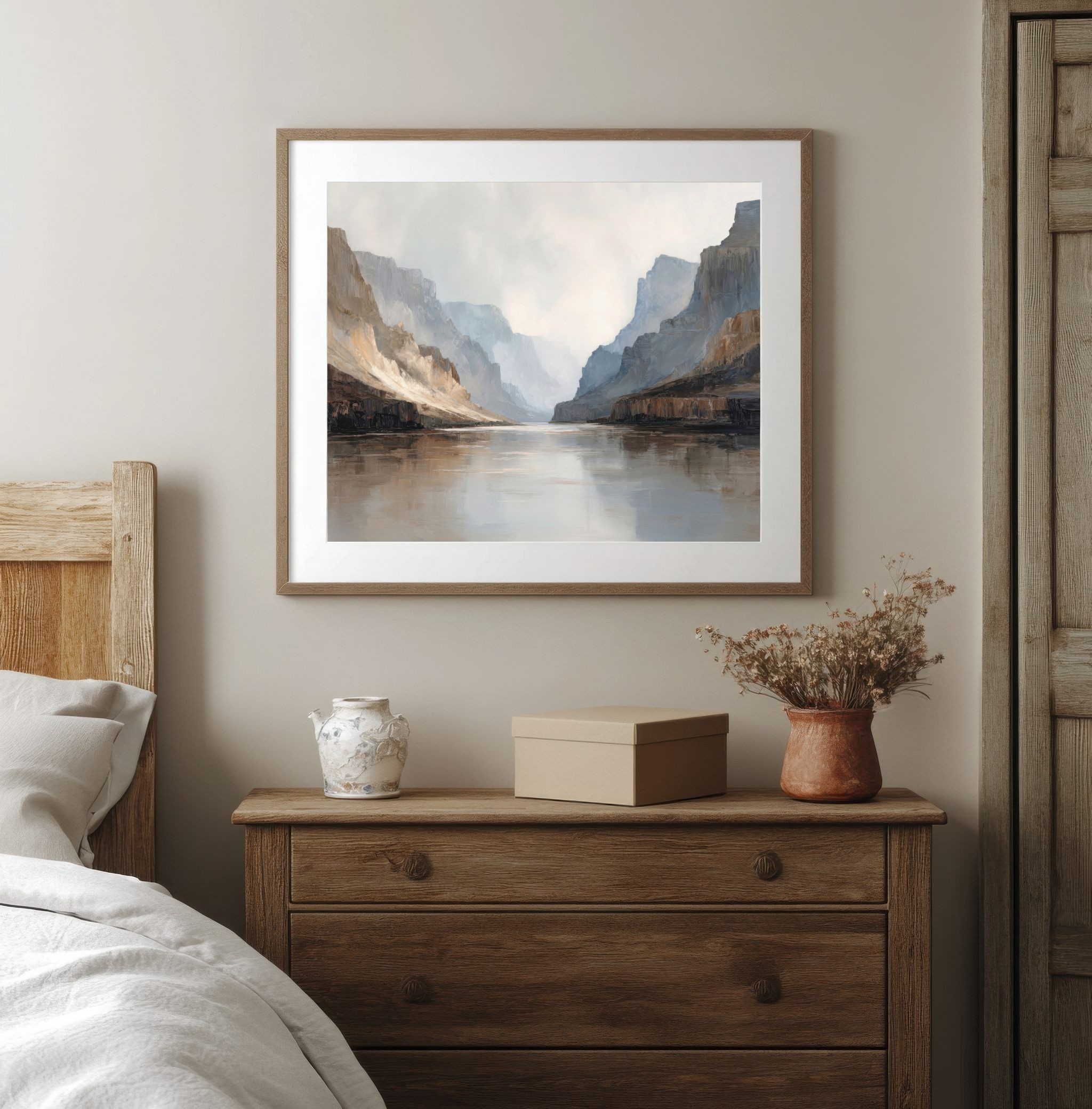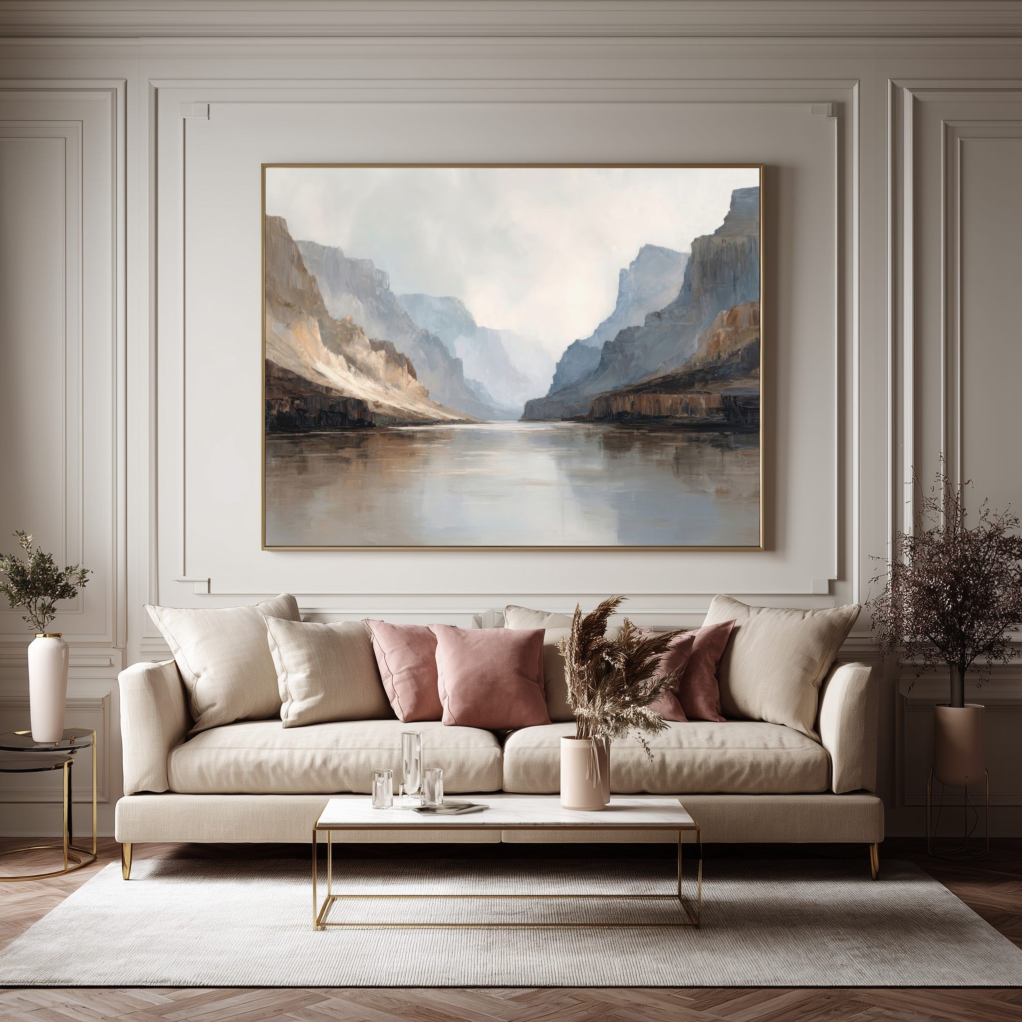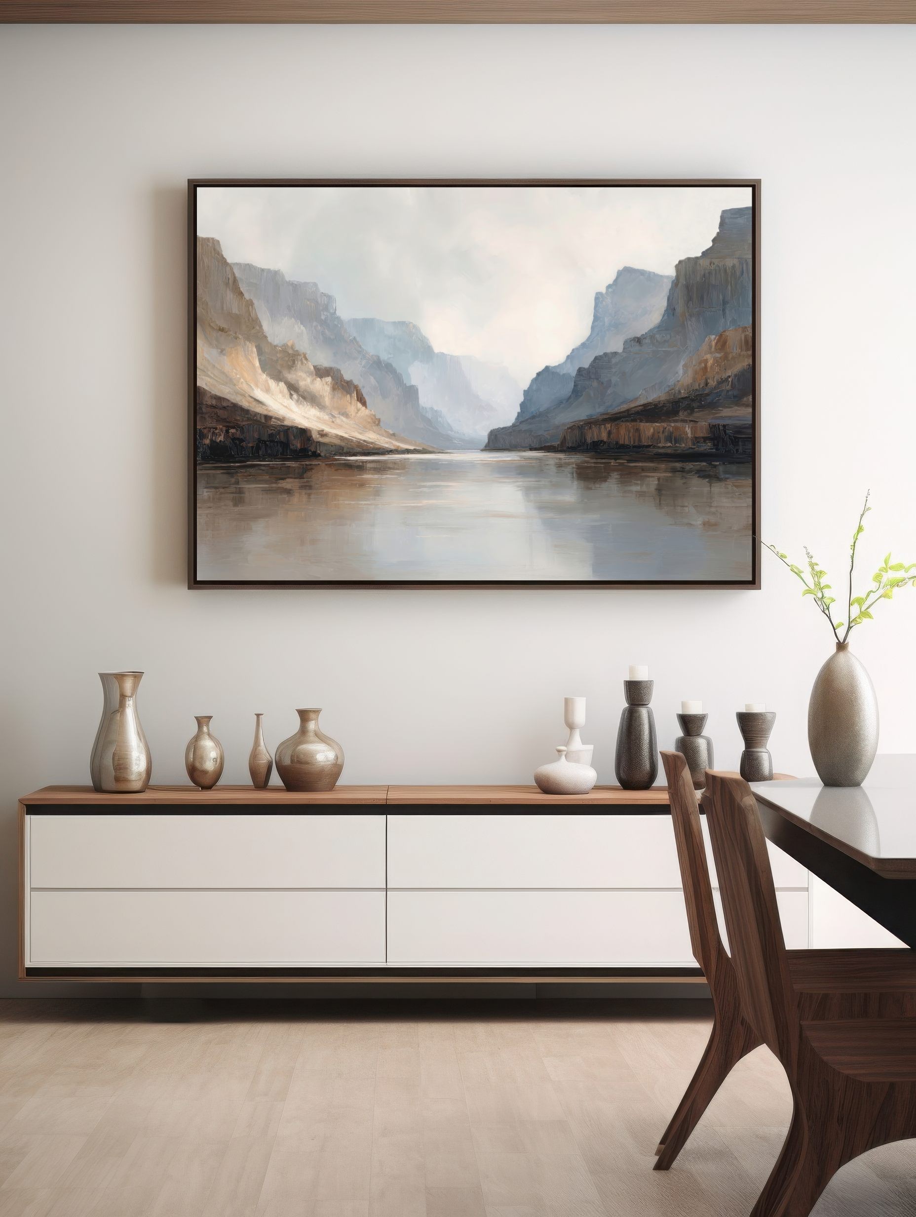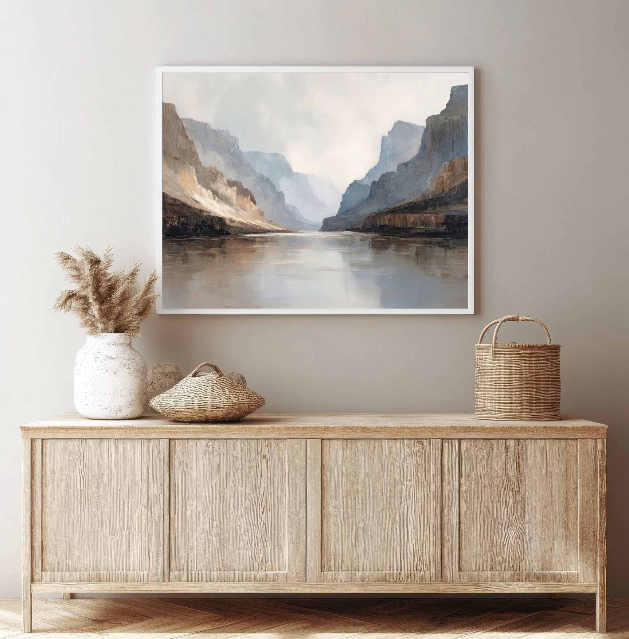 Questo quadro astratto moderno interpreta un maestoso paesaggio di canyon con pareti rocciose e riflessi d’acqua, resi attraverso toni neutri, sabbia, grigio e azzurro polveroso. Le pennellate ampie e materiche creano profondità e silenzio visivo, evocando una sensazione di equilibrio e contemplazione. Perfetto come quadro grande da parete, valorizza soggiorni moderni, ambienti minimal, studi professionali e spazi living eleganti con un’estetica contemporanea e raffinata.