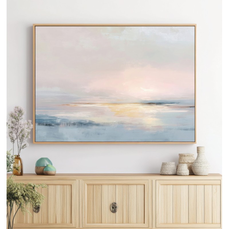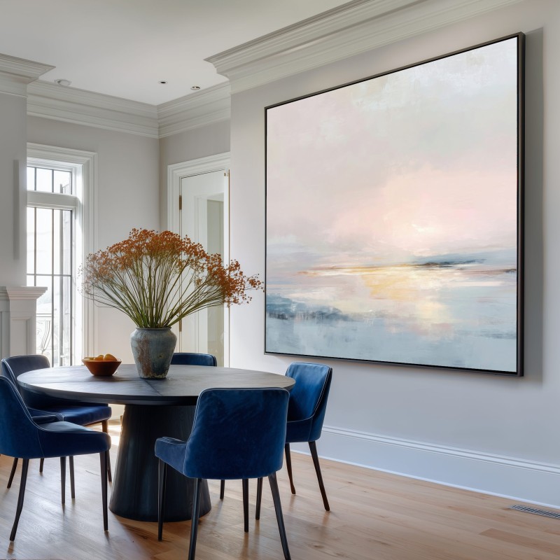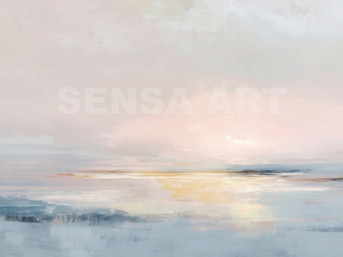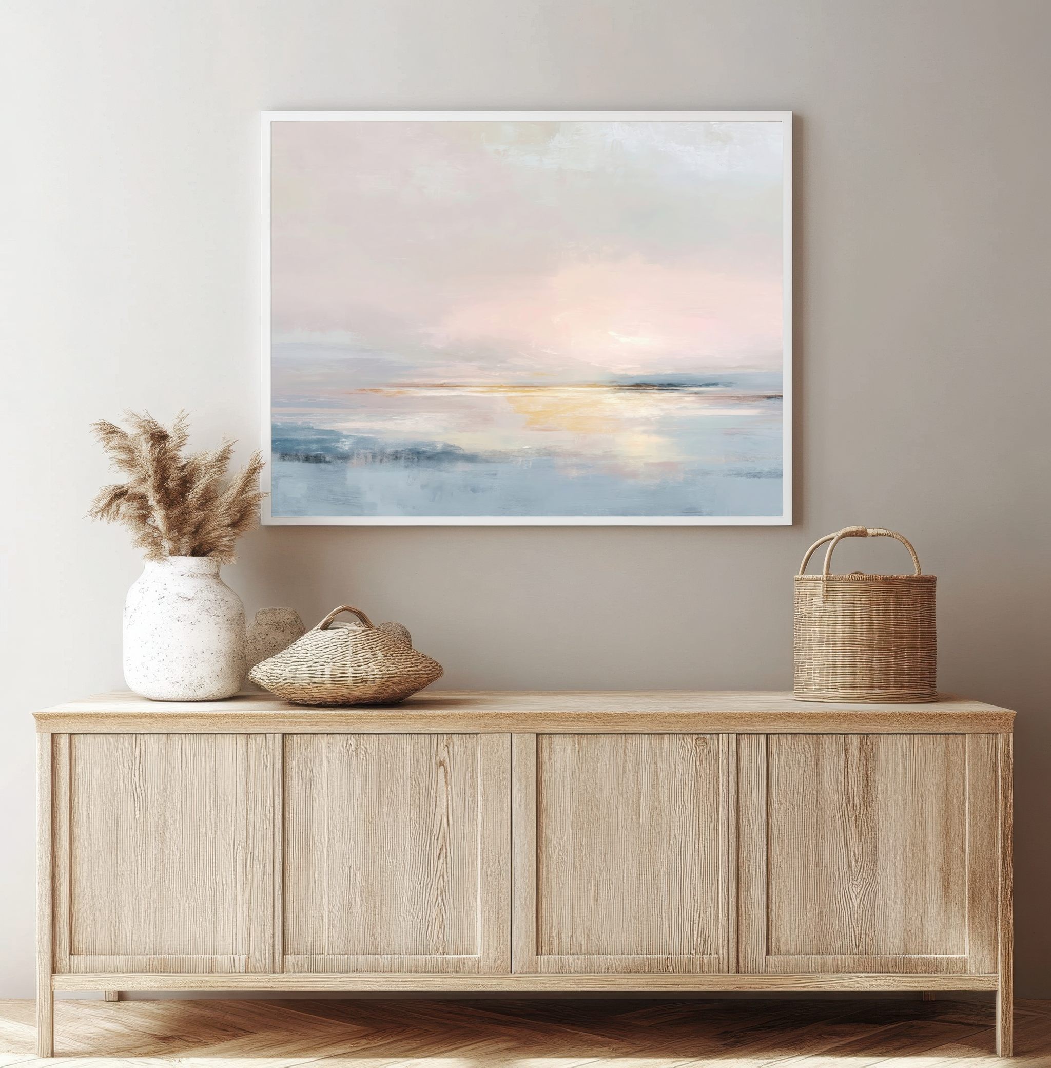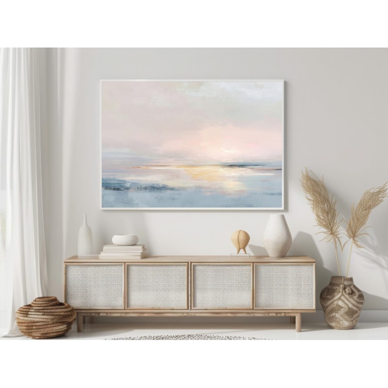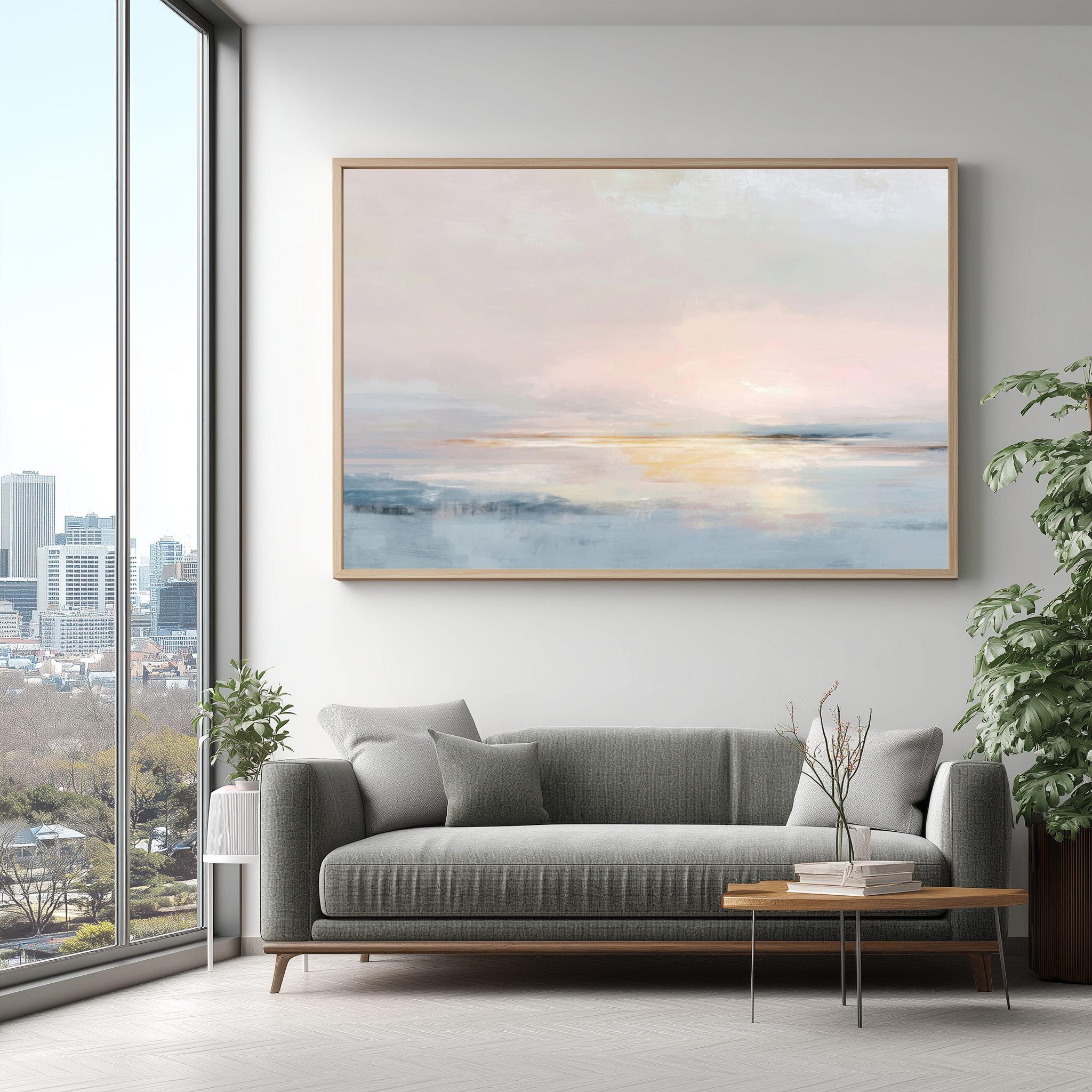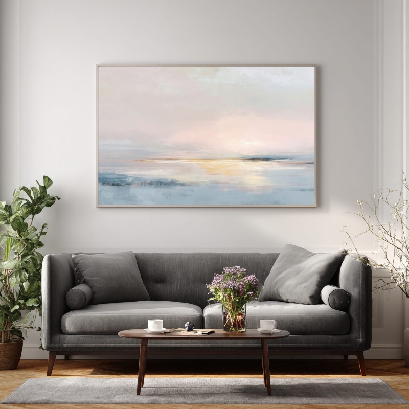 Questo quadro astratto moderno raffigura un paesaggio minimale dominato da toni pastello, azzurri polverosi e delicate sfumature rosate. L’orizzonte luminoso e le pennellate morbide creano un’atmosfera di calma, equilibrio e profondità visiva. Ideale come quadro grande da parete, è perfetto per soggiorni moderni, camere da letto eleganti, spazi minimal e ambienti contemporanei dove si desidera trasmettere luce, armonia e raffinatezza.