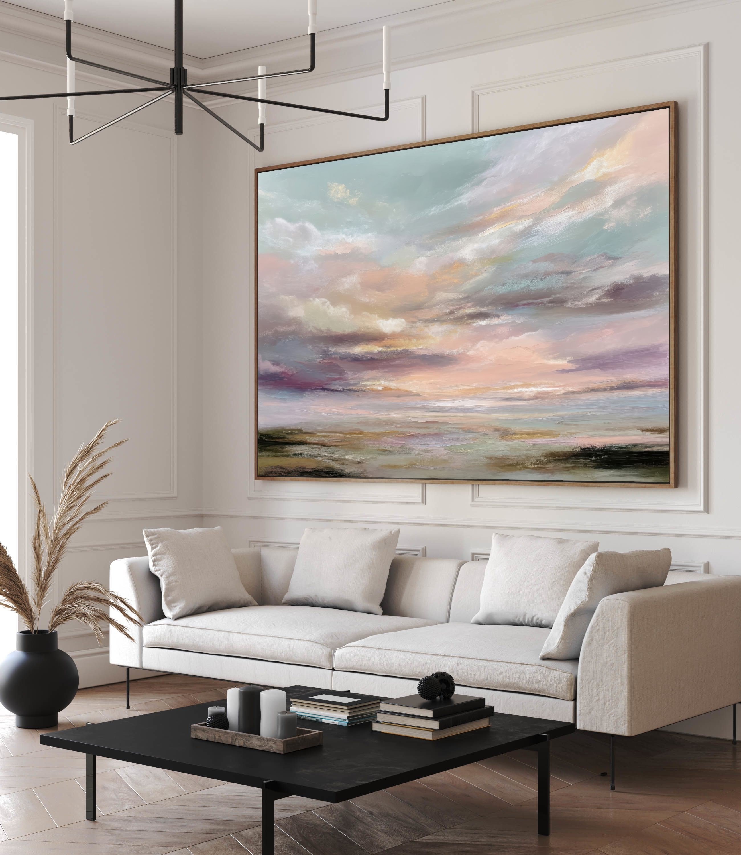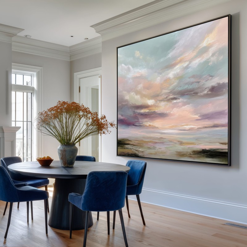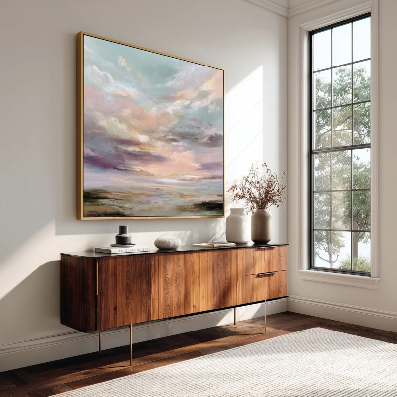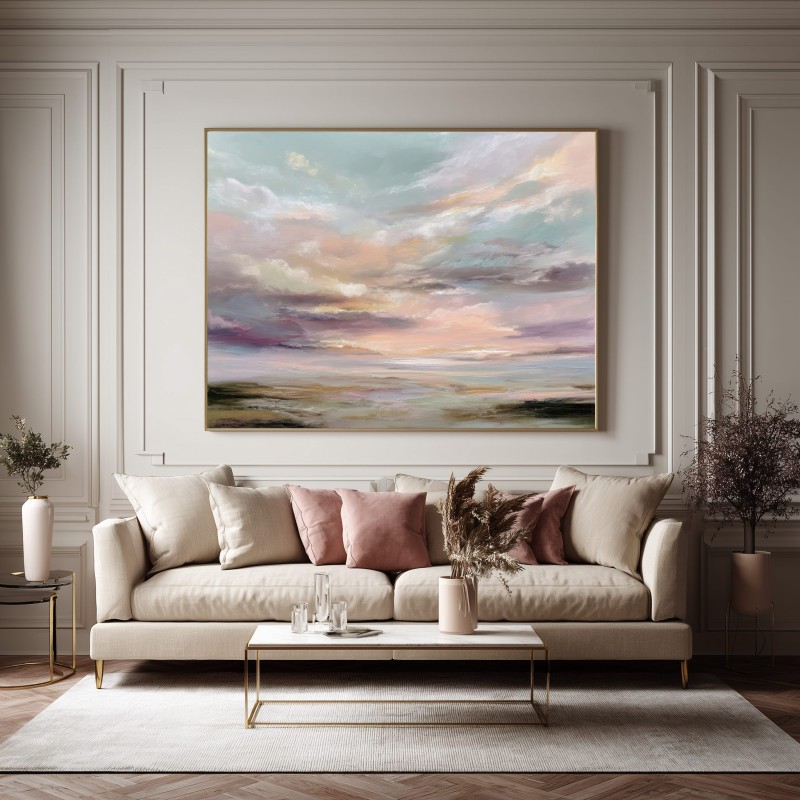 Questo quadro moderno astratto interpreta un paesaggio etereo dominato da sfumature pastello, rosa cipria, azzurri polverosi e tocchi caldi dorati. Le pennellate leggere e stratificate creano un cielo ampio e avvolgente, trasmettendo una sensazione di calma, luce e profondità. Ideale come quadro grande da parete, si inserisce perfettamente in soggiorni moderni, camere da letto raffinate, ambienti minimal e spazi contemporanei dove l’arte diventa elemento di equilibrio e serenità visiva.