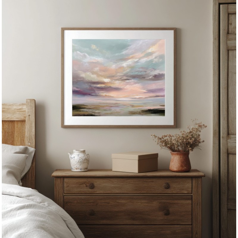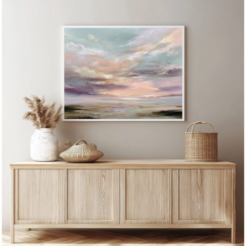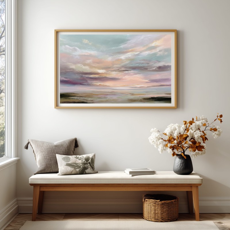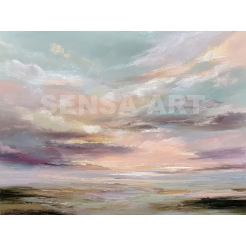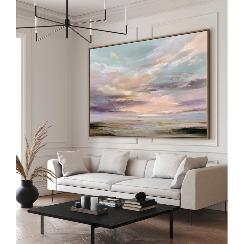 Questo quadro moderno astratto interpreta un paesaggio etereo dominato da sfumature pastello, rosa cipria, azzurri polverosi e tocchi caldi dorati. Le pennellate leggere e stratificate creano un cielo ampio e avvolgente, trasmettendo una sensazione di calma, luce e profondità. Ideale come quadro grande da parete, si inserisce perfettamente in soggiorni moderni, camere da letto raffinate, ambienti minimal e spazi contemporanei dove l’arte diventa elemento di equilibrio e serenità visiva.